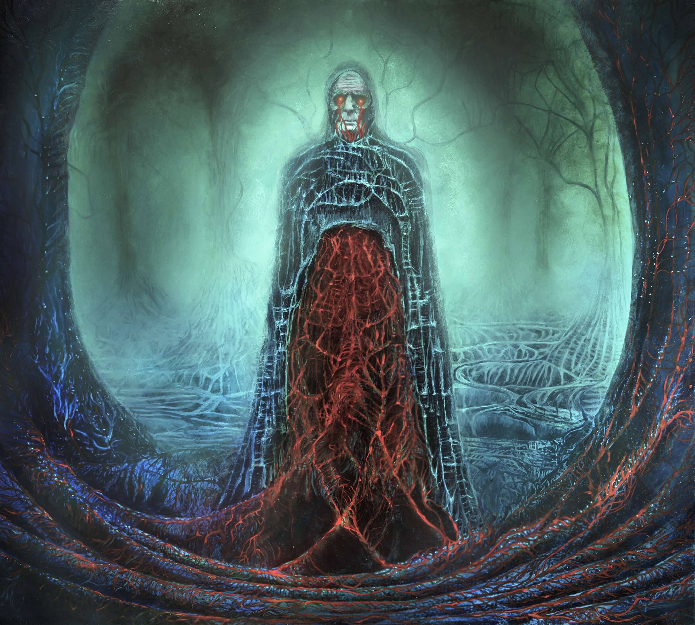 Na obrazie widzimy tajemniczą postać otoczoną drzewami, która zdaje się wyłaniać z mgły. Kolory to dominujący chłodny błękit, przeplatany ognistym czerwonym, przyciągającym wzrok jak magnes. Kompozycja jest niemal symetryczna, co nadaje jej hipnotyzującą jakość. Atmosfera obrazu jest mroczna i nieco niepokojąca, przypominając klimaty z horroru. Wyraźnie czuć napięcie, jakby coś miało się wydarzyć. Jakby z lasu miał wyłonić się duch przeszłości. Styl artysty jest ekspresjonistyczny, co widać w żarliwych kolorach i dynamicznych liniach. Jest jak rollercoaster emocji. Patrząc na to dzieło, można poczuć chłód przechodzący po plecach – a to wszystko przez te czerwone korzenie, które zdają się żyć własnym życiem. Czy to nie wygląda jak sceny z "Stranger Things"? Maluch mógłby powiedzieć: "Patrz mamo, potwór z lasu!". To niesamowite, jak obraz oddziałuje na zmysły, prawda? Artysta bawi się światłocieniem, co podkreśla trójwymiarową głębię przestrzeni. Obraz od razu przywołuje na myśl las pełen sekretów i tajemnic. Możesz mieć wrażenie, że las wokół ciebie oddycha, a coś w jego wnętrzu budzi się do życia.