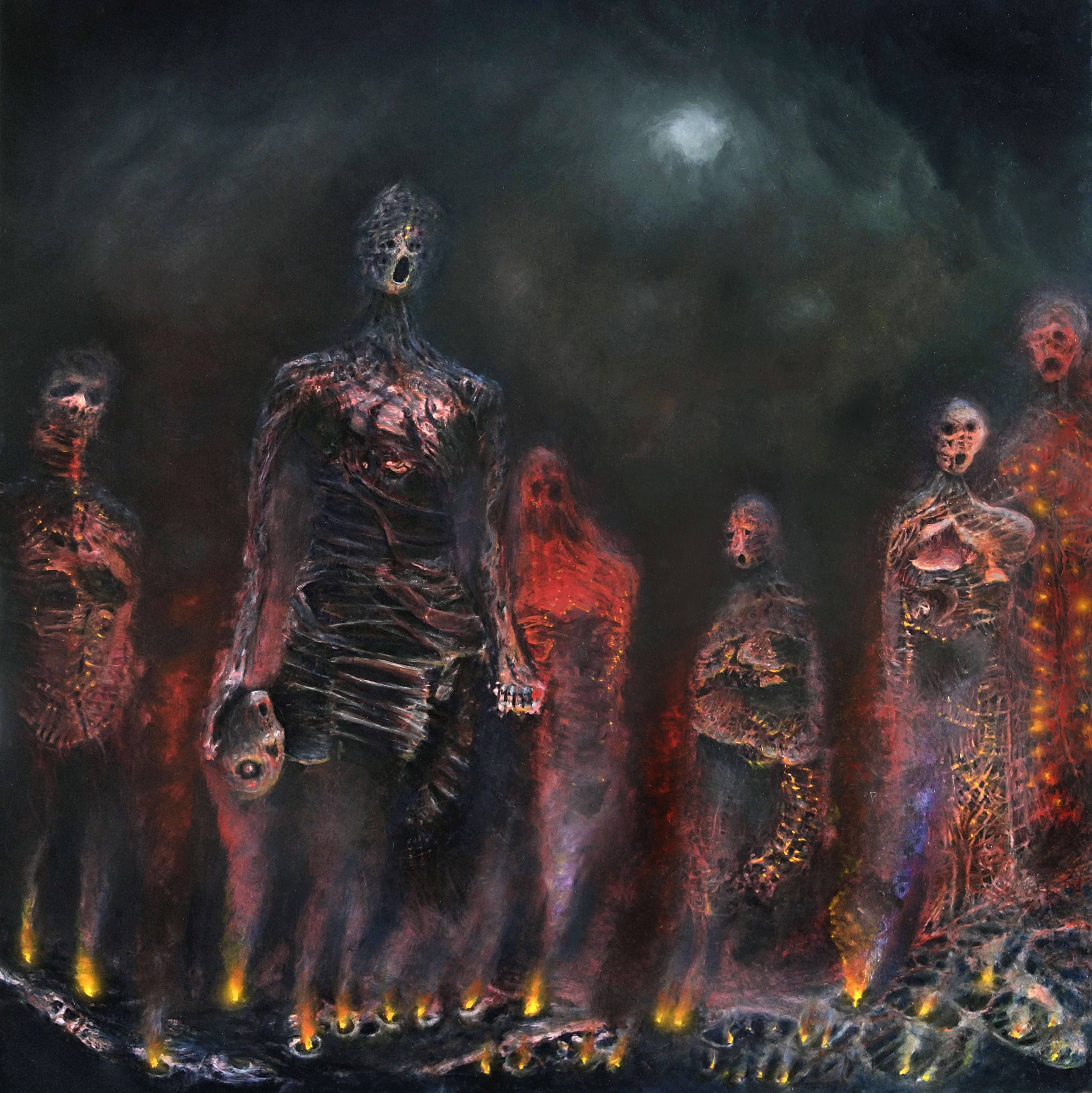 Na obrazie widać grupę tajemniczych postaci, które wydają się wyłaniać z mrocznej, mglistiej przestrzeni. Dominują ciemne, ponure barwy, takie jak głębokie odcienie czerni i szarości, przełamane jaskrawymi akcentami czerwonawych rozbłysków. Figury mają zniekształcone, niemal widmowe kształty, a ich twarze zdają się krzyczeć bezgłośnie. Kompozycja jest chaotyczna, ale jednocześnie hipnotyzująca. Atmosfera obrazu jest nieco dusząca i budząca niepokój. Emanuje z niego tajemniczy nastrój, jakbyśmy patrzyli na scenę z innego świata. Artysta zastosował techniki nakładania warstw, tworząc efekt głębi i niejasności. Tekstura, którą widzimy, jest bogata i intensywna, co wzmacnia ekspresję dzieła. Można odnieść wrażenie, że obraz kryje jakąś mroczną opowieść, pełną ukrytych znaczeń. To, co przyciąga uwagę, to kontrast między ciemnością a jarzącymi się elementami – almost like a glowing ember in the night. Obraz może wywoływać różnorodne emocje. Niektórzy mogą poczuć niepokój lub lęk, inni – fascynację i ciekawość. Dziecko mogłoby powiedzieć: "Te postacie wyglądają jak smutne duchy w ogrodzie". To ciekawe, jak takie obrazy mogą pobudzać naszą wyobraźnię i prowokować do refleksji nad własnymi lękami i marzeniami. Obraz jest intrygujący, a jego interpretacja zależy od osobistych doświadczeń odbiorcy.