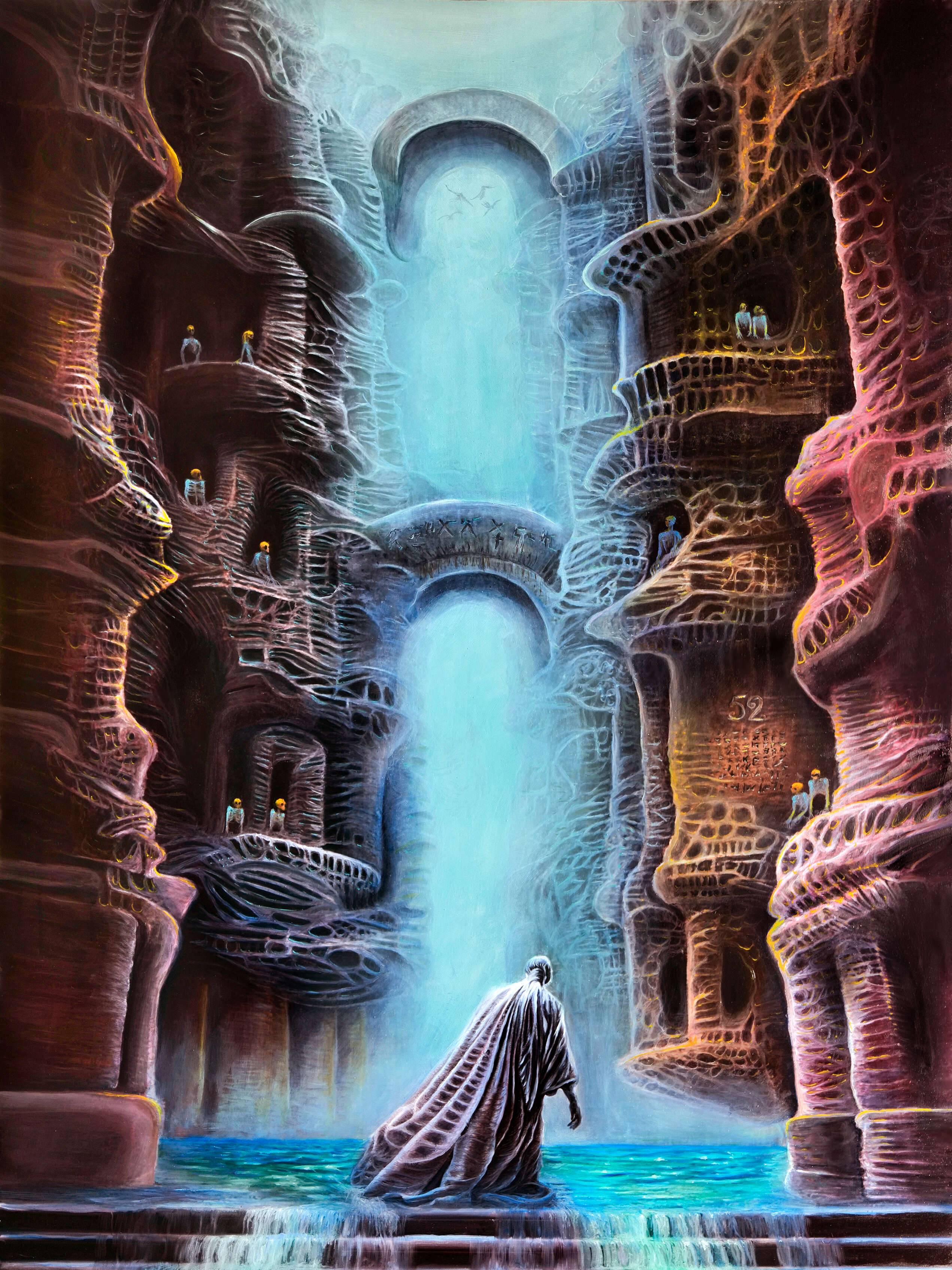 Na obrazie widzimy tajemniczą wizję przypominającą mityczne jaskinie. Postacie skrywają się na balkonach, a nad nimi wisi niebieska poświata, tworząc mistyczną atmosferę. Dominują chłodne odcienie błękitu, kontrastujące z ciepłymi brązami i fioletami skalistych ścian. Kształty są wymyślne, jakby artysta bawił się z wyobraźnią widza, tworząc organiczne struktury, które przypominają koralowce. Środkowa postać w zapierającym dech płaszczu spogląda w dal, wzbudzając w nas ciekawość, dokąd zmierza. Obraz emanuje poczuciem zagadki i odkrywania nieznanego. The mood is truly captivating. Użyto tu techniki olejnej, co podkreśla głębię kolorów i pozwala grać światłocieniem. Obraz skłania do interpretacji, może wzbudzać poczucie osamotnienia lub, przeciwnie, rodzącej się nadziei. To jak bajka, w którą chcesz się zanurzyć, pełna sekretów i niewyjaśnionych historii. A ja sobie wyobrażam, że to miejsce, gdzie mieszkają magiczne stwory i można tu spotkać smoki! Połączenie realistycznych detali z onirycznym klimatem działa na wyobraźnię, zachęcając do zatrzymania się na dłuższą chwilę. To naprawdę fascynujące dzieło, tworzące nić między rzeczywistością a fantazją.