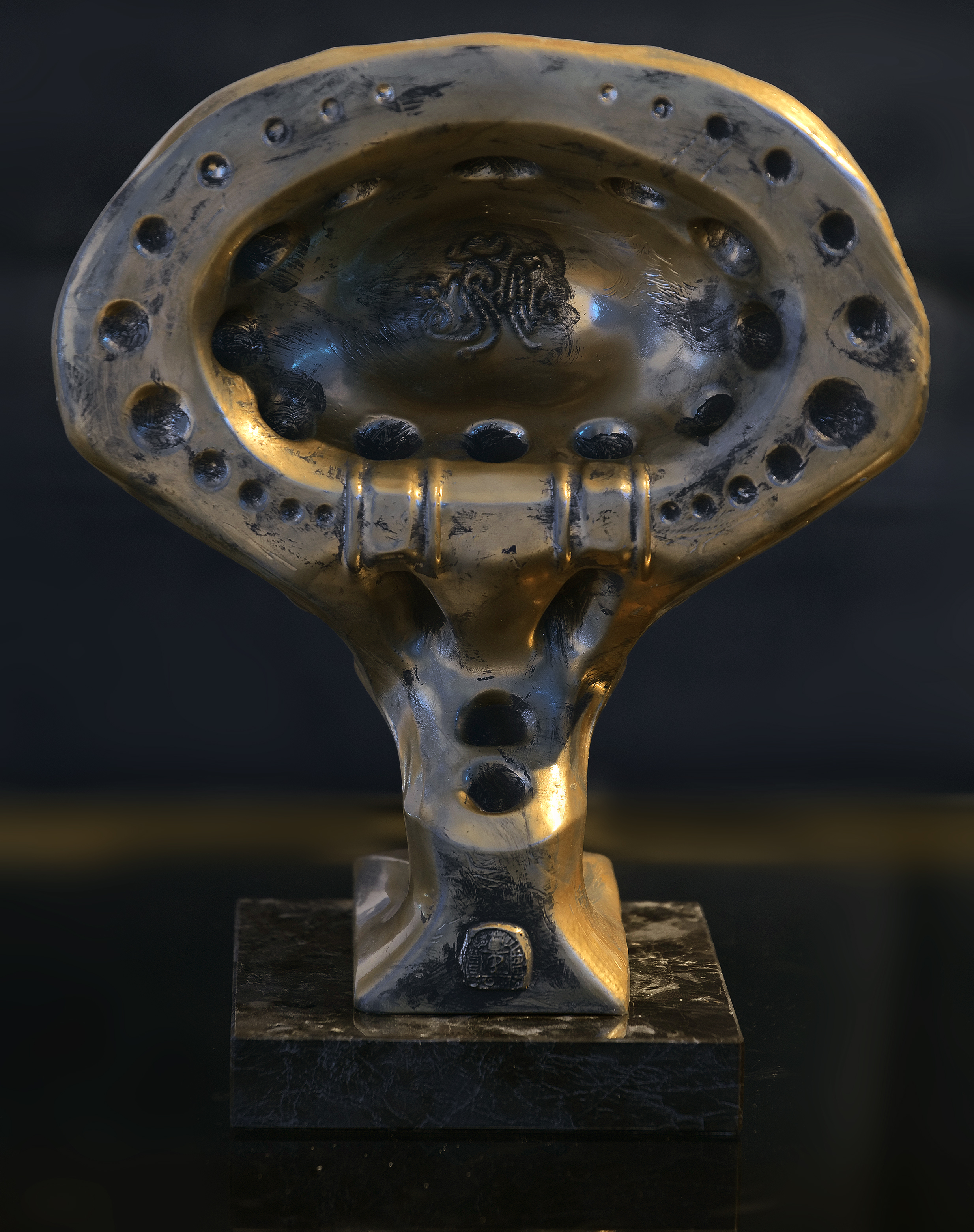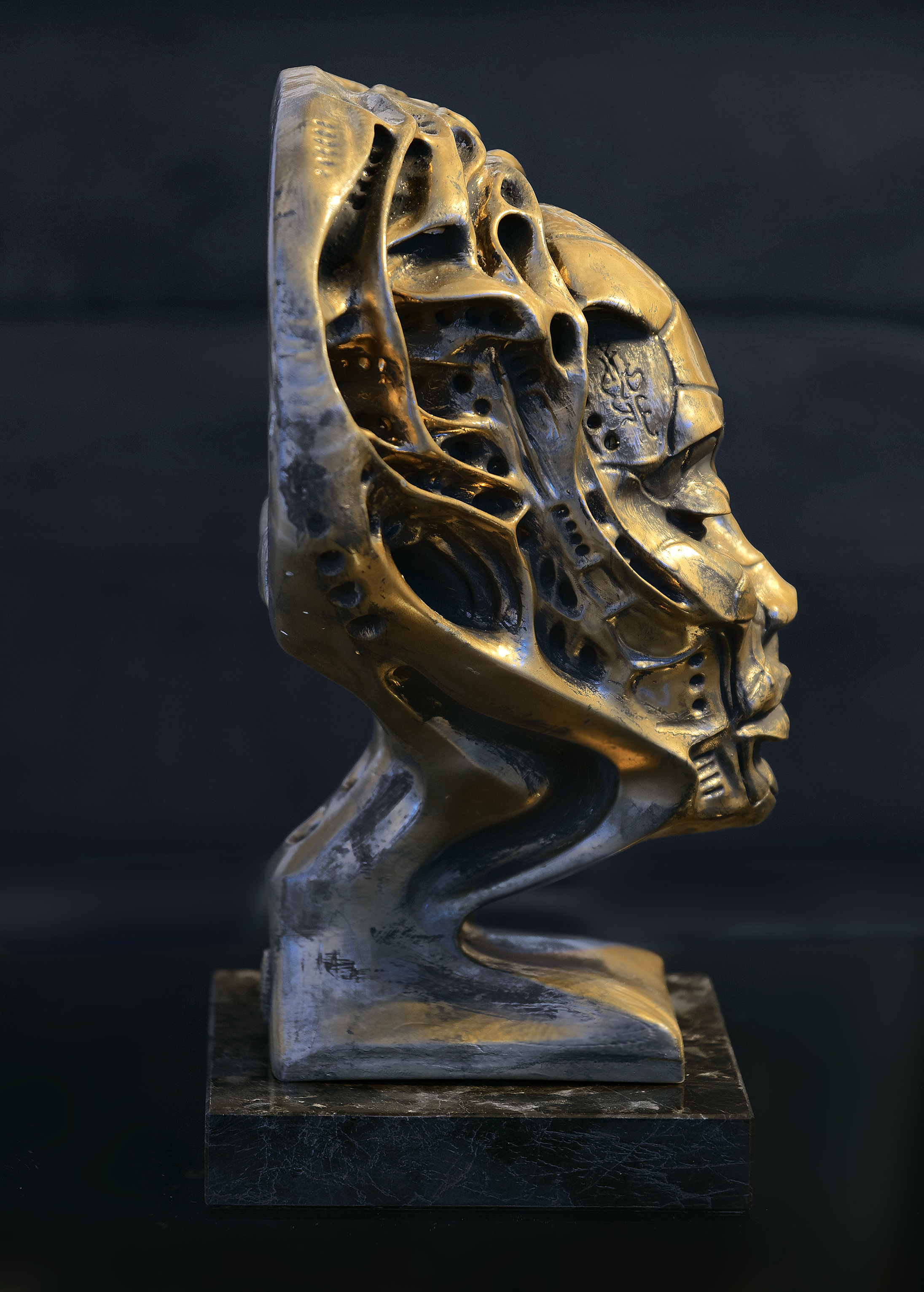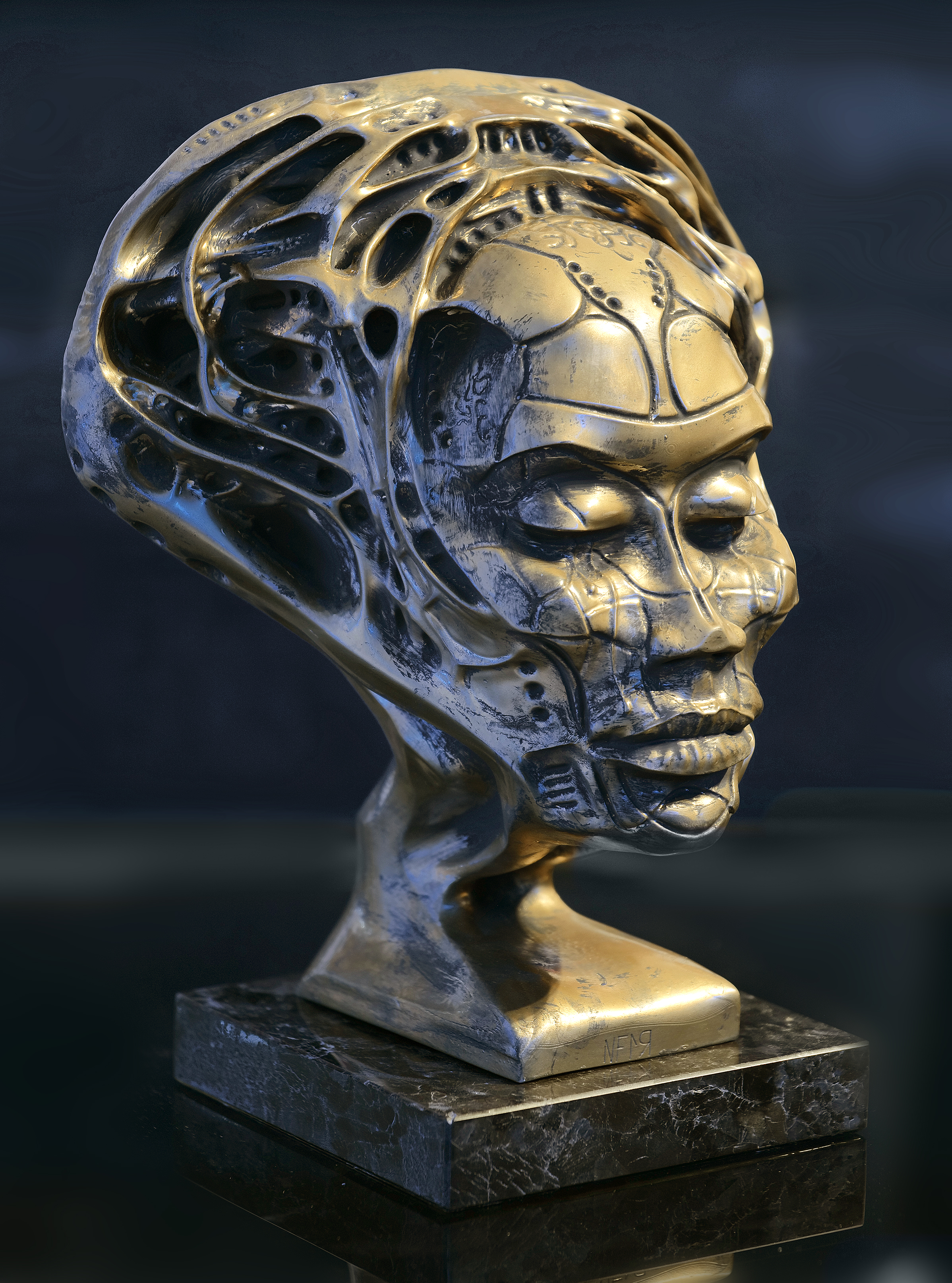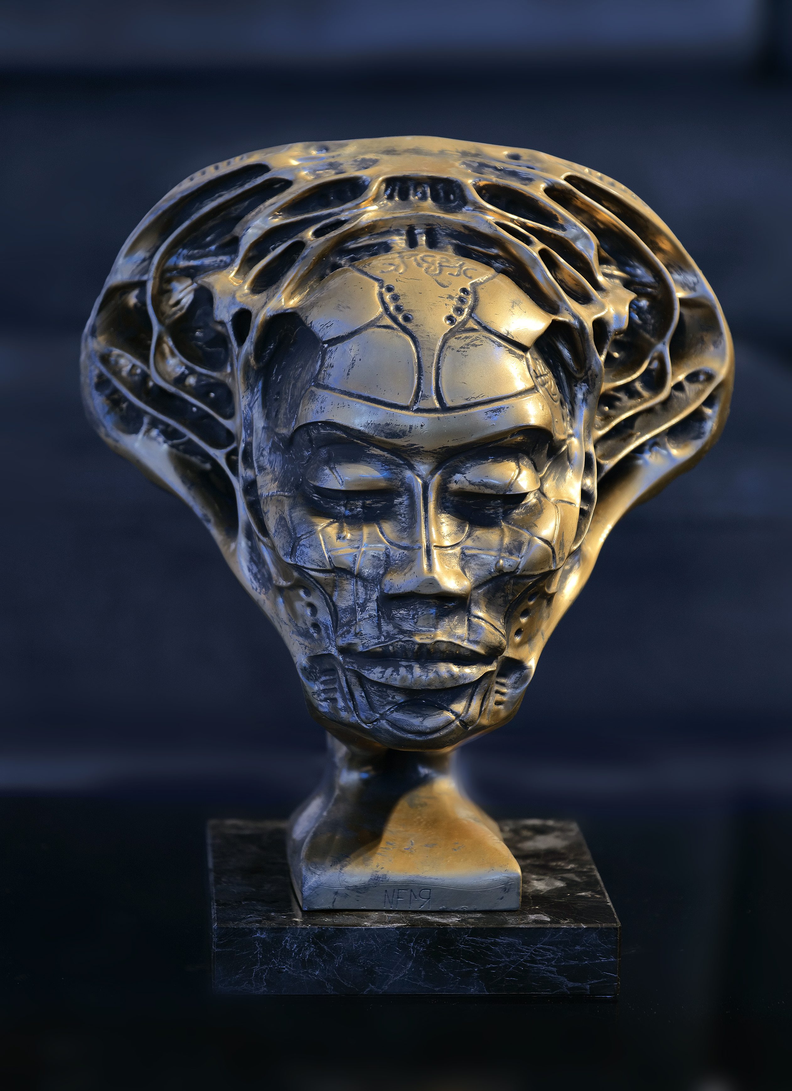NF1 ,wysokość ok 32 cm , kamień , żywica , granit . Waga około 5kg pokryta płynnym brązem i patynowana. Sygnowana z tyłu