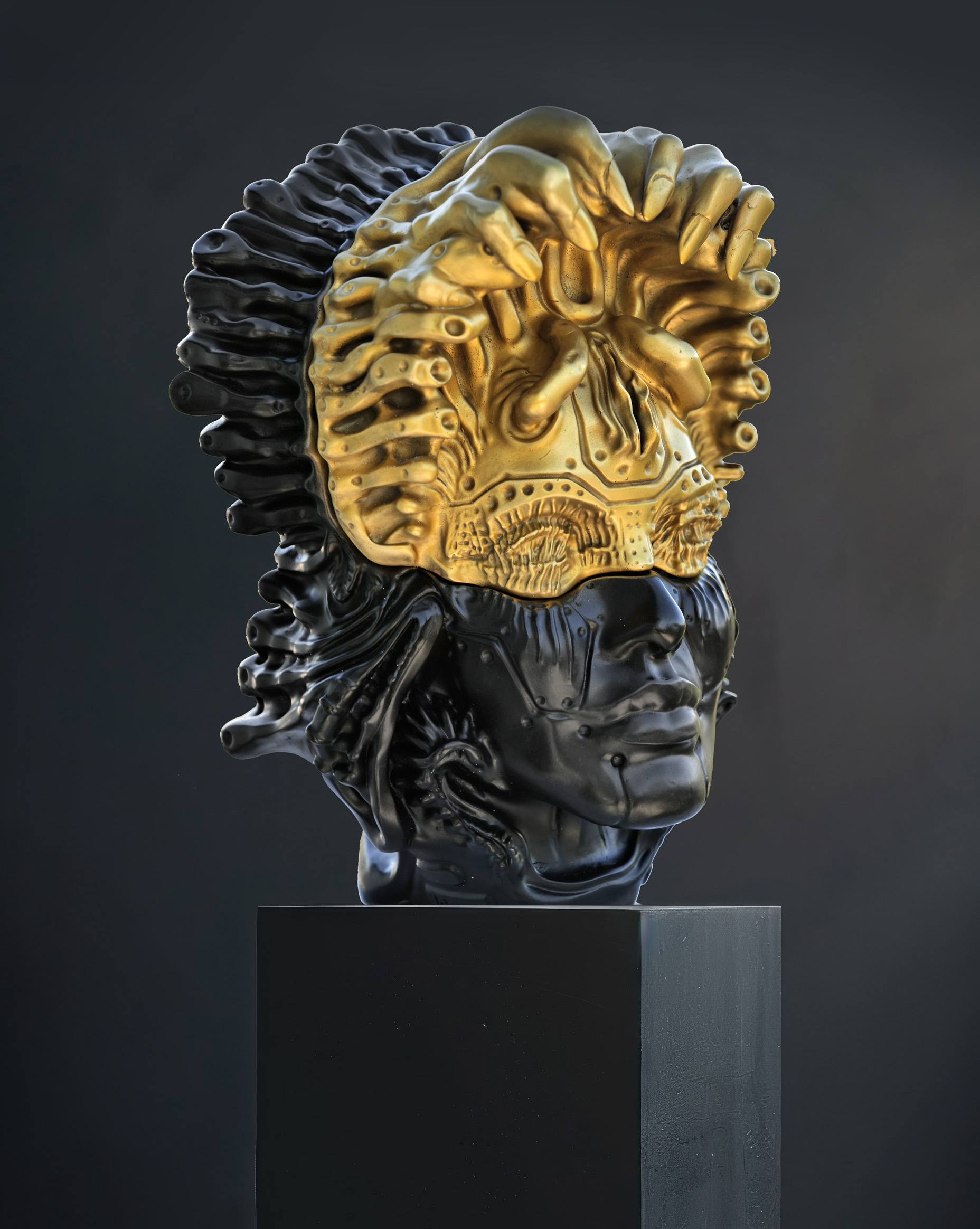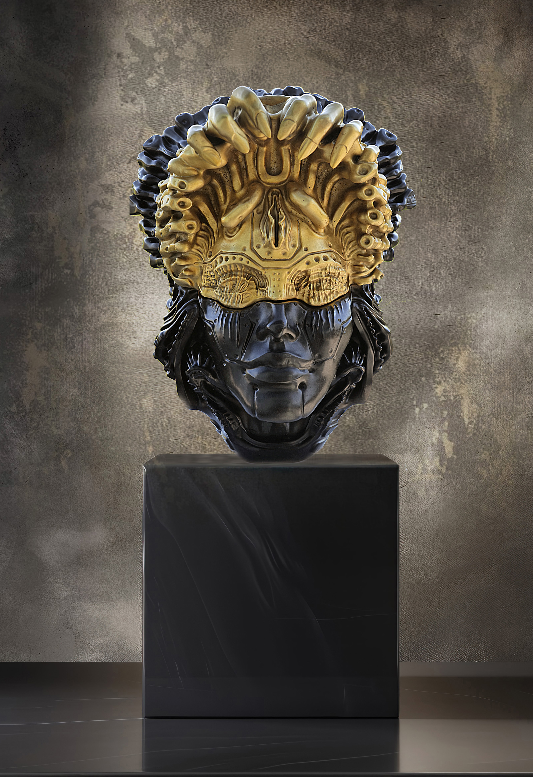 „Nutrix ” Dyptyk 40 cm i ok 20 kg wagi , sygnowana numerowana 3/8 z czego tylko 6 rzeźb jest czarno złotych a 2 to edycje specjalne galwanizowane   potężna  monumentalna rzeźba z brązu , która stanowi część dyptyku, łącząc w sobie elementy piękna i tajemnicy. Artysta stworzył postać uwodzicielskiej kobiety, której zmysłowość przyciąga uwagę, jednocześnie skrywając mroczne, mistyczne warstwy znaczeniowe. Część twarzy rzeźby została zaprojektowana w sposób, który pozwala na jej zdjęcie, odsłaniając niepokojące struktury wewnętrzne. To odważne posunięcie prowokuje do refleksji nad dualizmem natury kobiecej — z jednej strony pięknej i kuszącej, z drugiej zaś skrytej w cieniu, pełnej lęków i niepewności. „Nutrix ” to dzieło, które nie tylko fascynuje estetyką, ale także skłania do głębszej analizy psychologicznych i symbolicznych treści. To zaproszenie do odkrywania, co kryje się za zasłoną zewnętrznego piękna, a także do refleksji nad złożonością ludzkiej natury. Rzeźba ta, z jej mistycznym klimatem, stanowi istotny element współczesnej sztuki, będąc jednocześnie hołdem dla klasycznych archetypów.