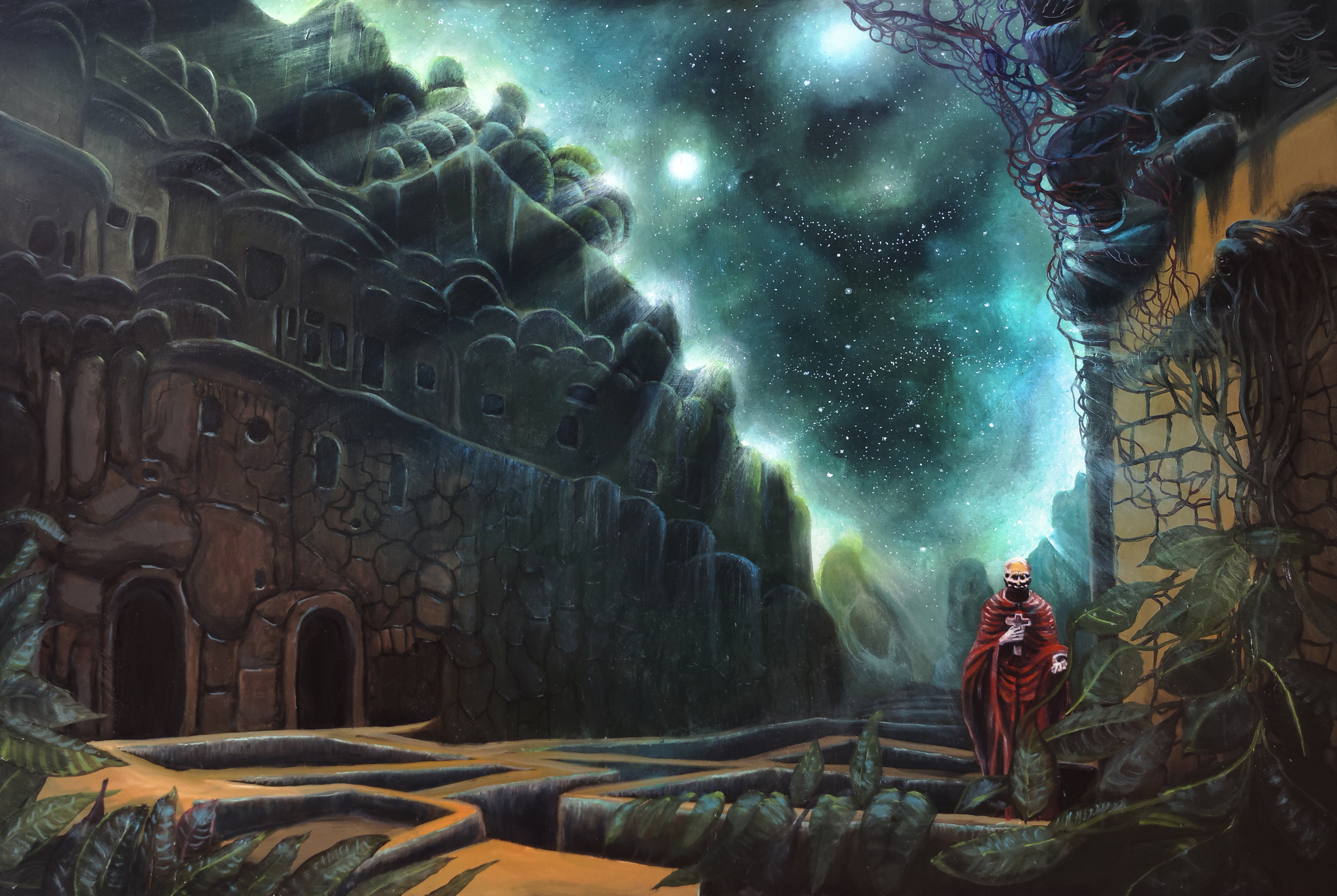 Obraz przedstawia niesamowitą scenę, która przenosi nas w świat fantazji i tajemnic. Dominują tu chłodne, ciemne odcienie zieleni i czerni, które wspaniale kontrastują z jasnym, gwieździstym niebem w tle. Budowle po lewej stronie przypominają starożytne ruiny, jakby wyrzeźbione w skale przez zapomnianą cywilizację. Są pełne zaokrąglonych kształtów i tajemniczych wnęk. Po prawej stronie postać w czerwonym płaszczu przyciąga uwagę. Jego czaszkowa twarz wprowadza element grozy i enigmatyzmu. Atmosfera na obrazie jest pełna napięcia i tajemnicy. Przestrzeń wokół wydaje się nieskończona, kosmiczna, a obecność postaci budzi pytanie o jej zamiary. Stylem dzieło przypomina surrealistyczne wizje, używając technik światłocienia do nadania głębi i dramatyzmu. Obraz może wywoływać uczucie zadumy i niepokoju. Te dziwne postacie są straszne! Przypomina o kruchości ludzkiej egzystencji i przeplatających się światach rzeczywistości i fantazji. To arcydzieło wywołuje refleksję nad nieznanym i skłania do odkrywania ukrytych znaczeń. Wow, to naprawdę magiczne.