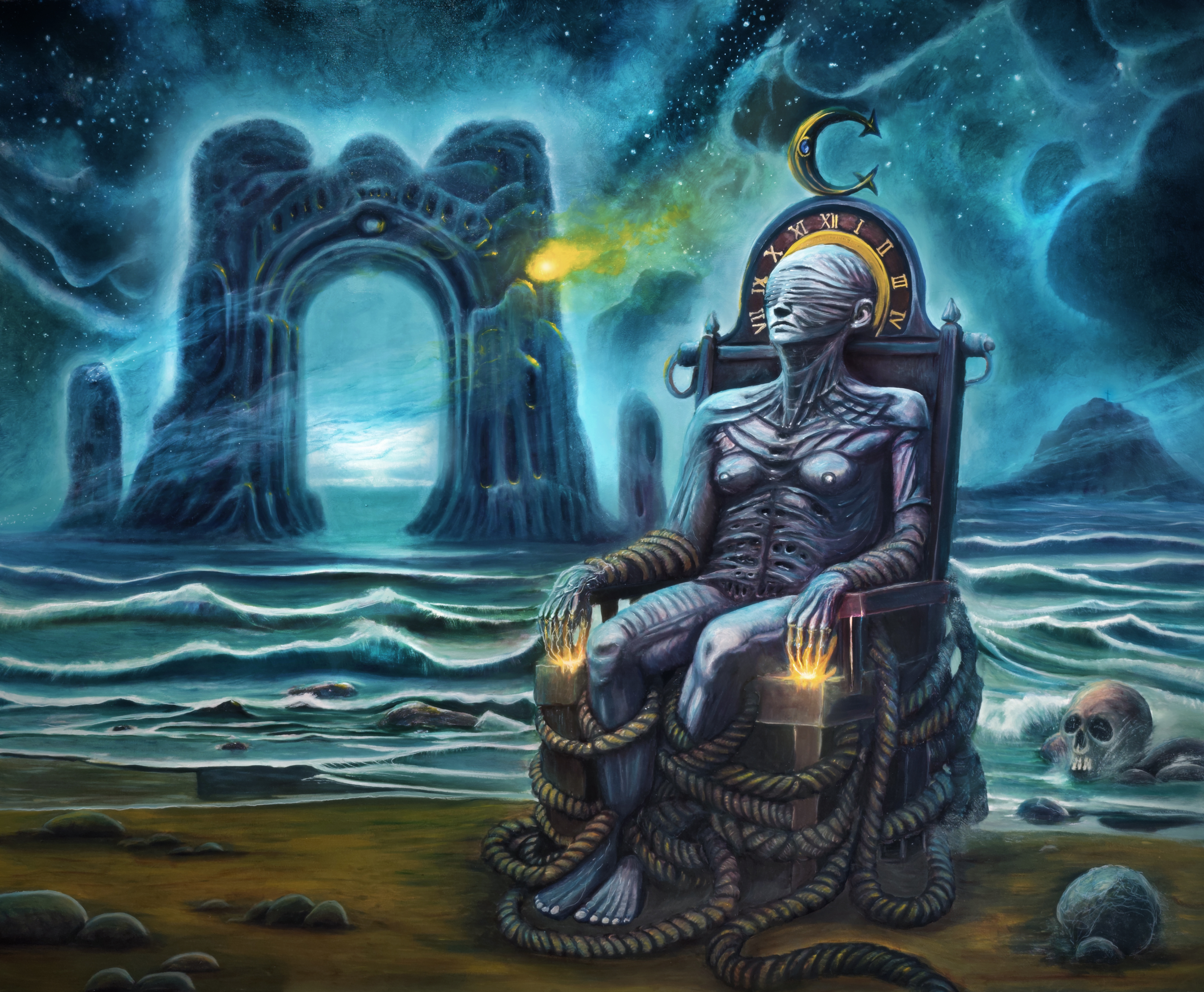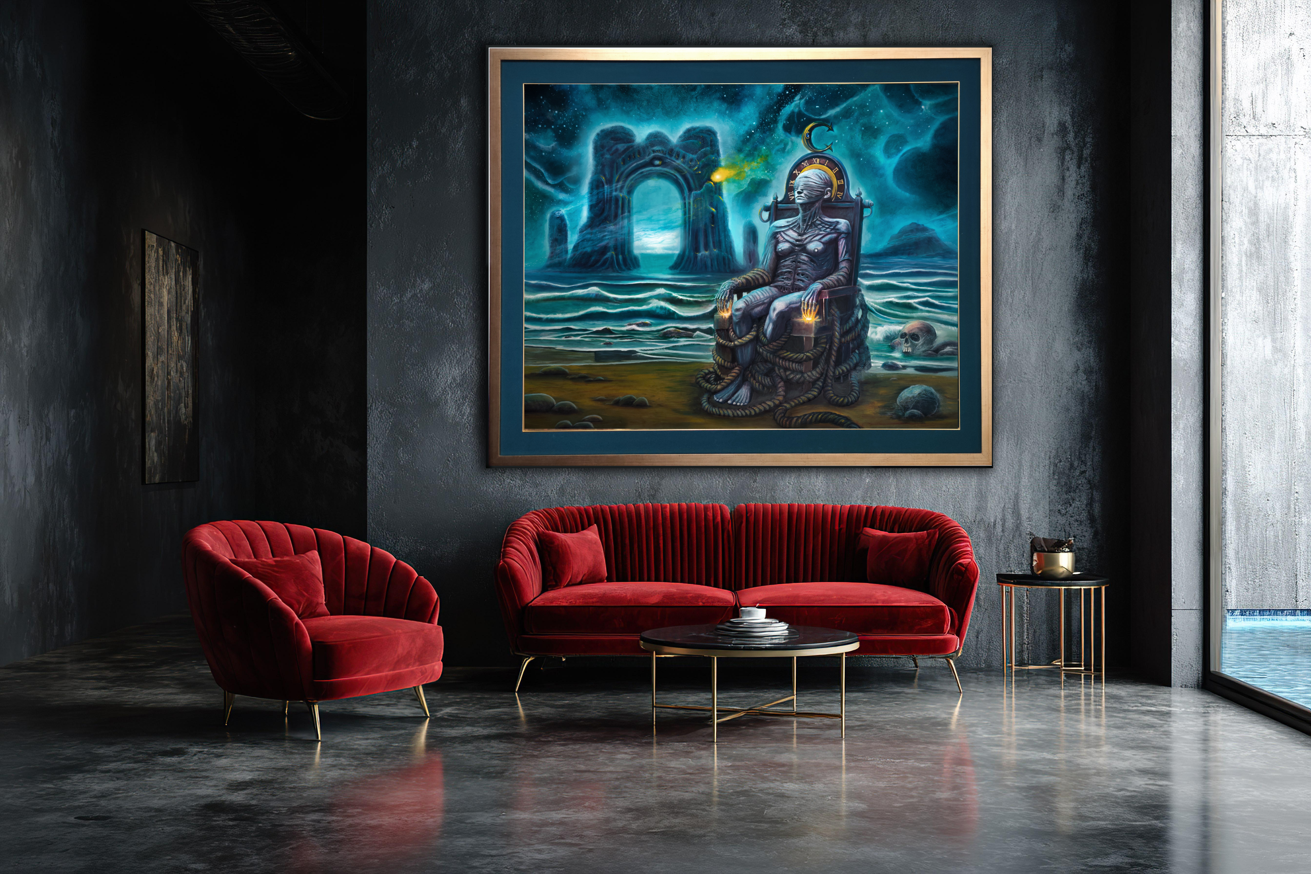 Na obrazie widzimy surrealistyczną postać, która siedzi na tronie przypominającym zegar. Dominują chłodne odcienie niebieskiego i zieleni, które nadają całemu dziełu mroczny, tajemniczy klimat. Fale morza w tle wydają się płynąć w nieskończoność, prowadząc wzrok ku monumentalnej bramie, która emanuje nieziemskim światłem. Ten detal przyciąga uwagę i nasuwa myśl o gateway in time. Atmosfera obrazu jest pełna napięcia, jakby czas stanął w miejscu. Artysta użył ostrych kontrastów światła i cienia, by podkreślić dramatyzm sceny. Postać na pierwszym planie przypomina zmumifikowaną istotę, która trzyma w dłoniach tajemnicze światło, co dodaje surrealistycznego wydźwięku. Moje uczucia? Czuję niepokój, ale jednocześnie fascynację. Płynące morze i świecące dłonie mogą sugerować przemijanie i zagubienie. Jakby, no wiesz, czas był różowym słonikiem w pokoju, którego nie można ignorować. Dla dzieciaka: "Wodę można pić, ale ta wygląda dziwnie." Obraz zdaje się mówić do nas szeptem o tajemnicach, których jeszcze nie znamy. To właśnie sprawia, że jest tak niesamowicie hipnotyzujący i przyciąga wzrok na dłużej niż by się chciało.