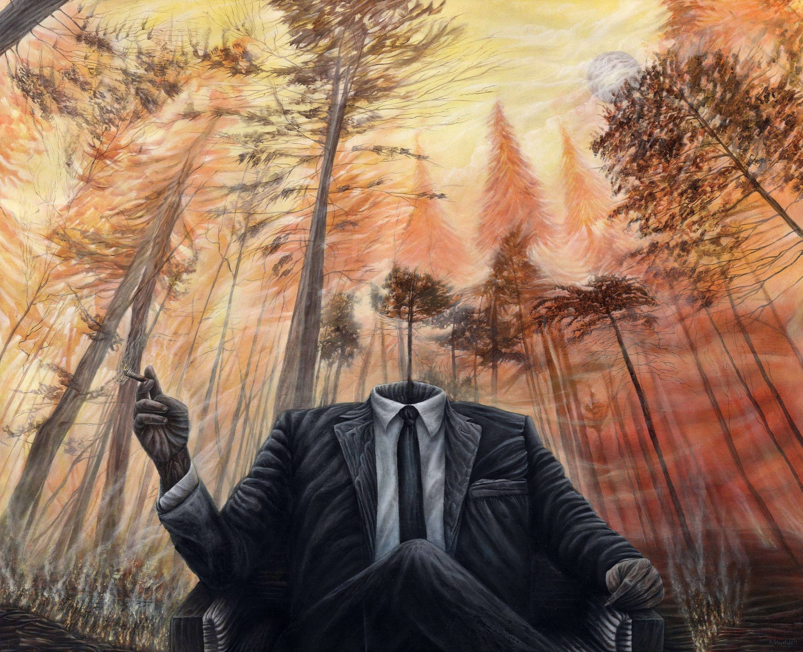 Obraz przedstawia emocjonalne wypalenie i dążenie po trupach do celu. Szaleńcza pogoń zawsze prowadzi do szaleństwa. Zatracenie się w doczesności oraz władzy potrafi odebrać rozum i zdolność właściwej oceny sytuacji. Wystarczy chwila nieuwagi, a zaprószony przez nas ogień strawi wszystko wokół. Obraz został wykonany emalią akrylową. W trakcie malowania zamiast wody użyłem lakieru poliuretanowego, aby powstające warstwy zachowały trwałość i przejrzystość. Płyta wsparta drewnianym blejtramem tworzy solidne podobrazie malarskie. Malatura jest pokryta wieloma warstwami lakieru poliuretanowego wysokiej jakości. Tył płyty również został zabezpieczony. Wyróżnienie – Praca dnia na międzynarodowym portalu deviantart.com
