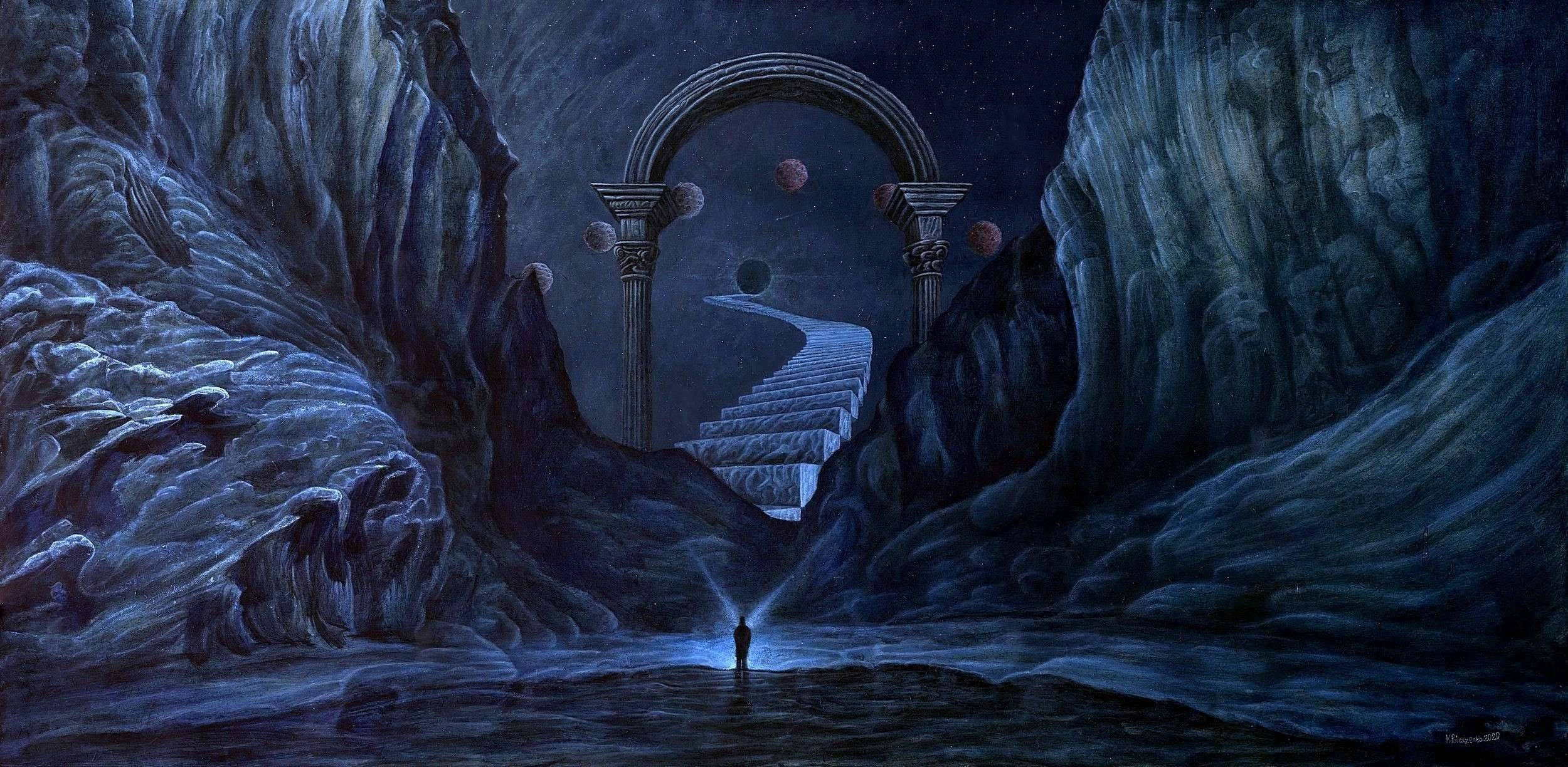 Obraz przedstawia ciągłe poszukiwania nowych pokładów inspiracji. Można go traktować jako alegorię życiowej wędrówki w głąb siebie. Obraz został wykonany emalią akrylową. W trakcie malowania zamiast wody użyłem lakieru poliuretanowego, aby powstające warstwy zachowały trwałość i przejrzystość. Masywna płyta stanowi solidne podłoże malarskie. Malatura jest pokryta wieloma warstwami lakieru poliuretanowego wysokiej jakości. Tył płyty również został zabezpieczony.