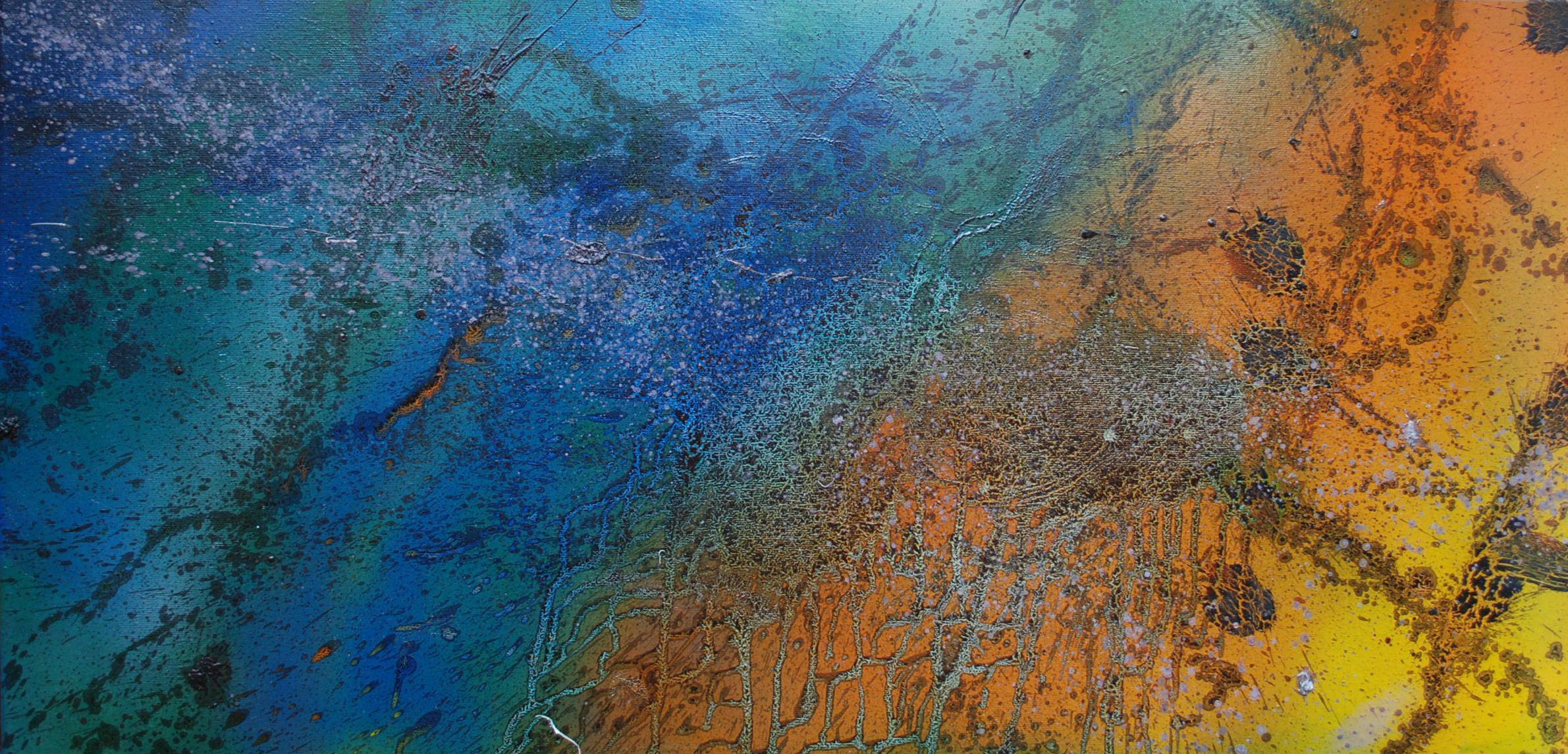 Obraz, który właśnie podziwiamy, przypomina migotliwy taniec kolorów na płótnie. Dominują w nim soczyste odcienie niebieskiego i zieleni, które mieszają się z ciepłymi pomarańczami i żółcieniami po prawej stronie. Kompozycja jest pełna energii, przejścia między kolorami są płynne, a delikatne plamki tworzą wrażenie ruchu. To jak patrzeć na rozgwieżdżone niebo lub głębiny oceanu. Atmosfera jest tajemnicza i jednocześnie fascynująca. Artysta użył techniki drippingu, która dodaje dynamiki i spontaniczności. Farba zdaje się płynąć, tworząc organiczne wzory. Patrząc na to dzieło, można poczuć przypływ ciekawości i wewnętrznego spokoju. Krótkie, przypadkowe plamki white rozsiane są po całym obrazie, dodają mu głębi. Dla dziecka to może być mapa skarbów, a dla dorosłego chwila relaksu i refleksji nad chaosem. Fajne, nie? Emocjonalnie, obraz wywołuje mieszankę zachwytu i zadumy, przypomina, że piękno tkwi w nieprzewidywalności.