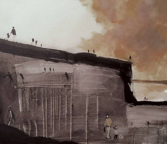 Na obrazie dominują subtelne odcienie szarości, beżów i brązów, które nadają mu delikatnej tajemniczości i głębi. Centralnym elementem jest ogromny klif, który przypomina abstrakcyjną formę, u góry liczne postacie maszerują w różnych kierunkach. Kształty tych postaci są proste, niemal karykaturalne, co dodaje obrazowi humorystycznego zabarwienia. Niebo z kolei ożywiają ciepłe odcienie pomarańczy, kontrastujące z chłodnym krajobrazem. Atmosfera obrazu jest wyjątkowo spokojna, choć z nutką niepokoju. Te samotne postacie na krawędzi klifu mogą symbolizować ludzką samotność w szerokim świecie. Artysta zastosował technikę szerokich pociągnięć pędzla, co nadaje pracy nieco impresjonistycznego charakteru. Dzięki temu, nawet niepozorne szczegóły wydają się żywe. Obraz budzi we mnie mieszane uczucia. Jest coś melancholijnego w tym niekończącym się krajobrazie, co sprawia, że zastanawiam się nad sensem wędrówki tych małych postaci. Lubię ten painting! Wyzwala on refleksję nad codziennością, nad zawiłością życia, które prowadzimy. Dzieciak powiedziałby pewnie: "Te ludziki wyglądają jak na spacerze po chmurach!" Szarość tła i promień światła na horyzoncie przypomina o istnieniu nadziei, nawet w najprostszych chwilach. Każdy może znaleźć tu siebie, być może pośród podróży, jaką jest życie.