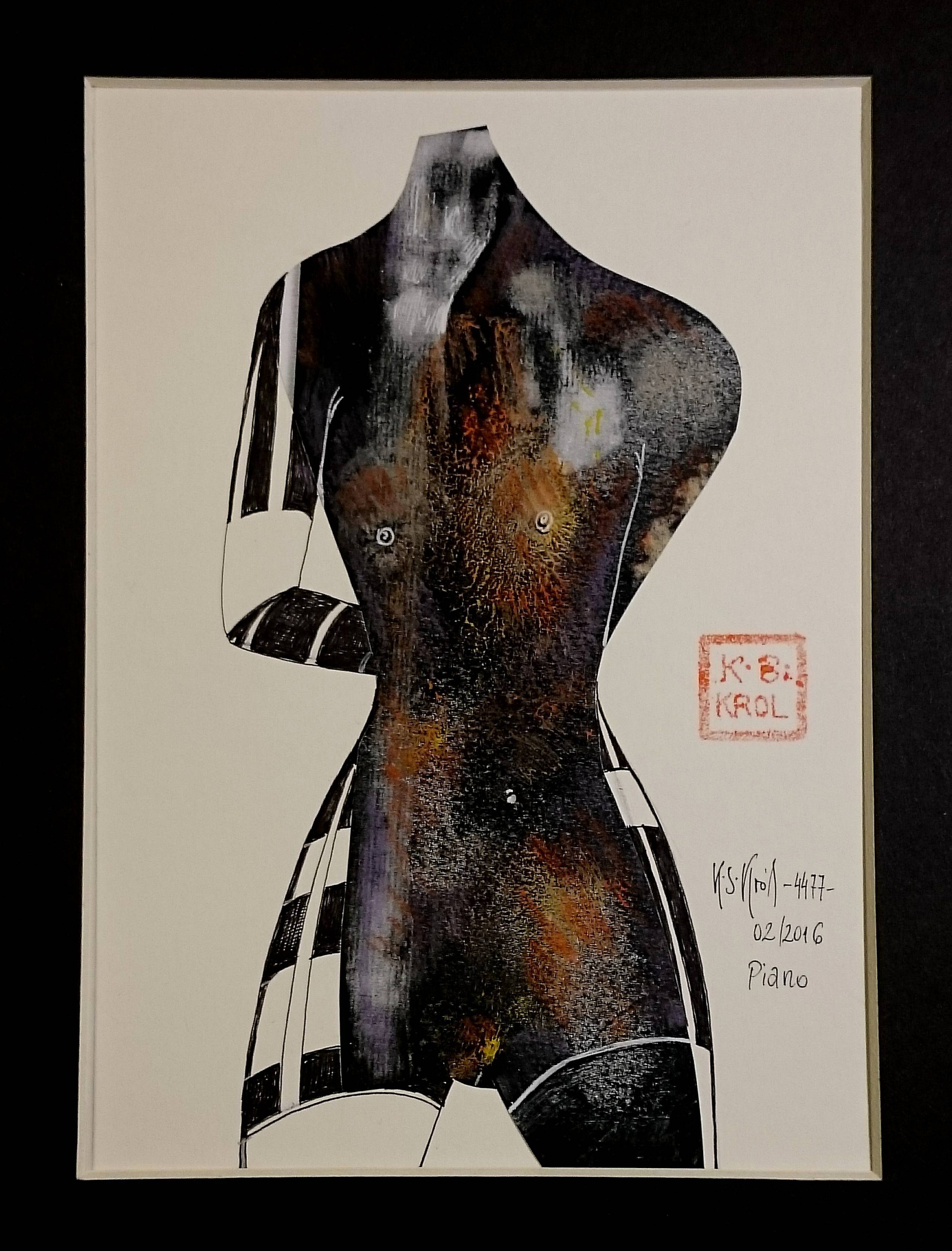 Collage na czarnym, bez kwasowym papierze. Symbolizuje wyrafinowaną grę z podtekstami.