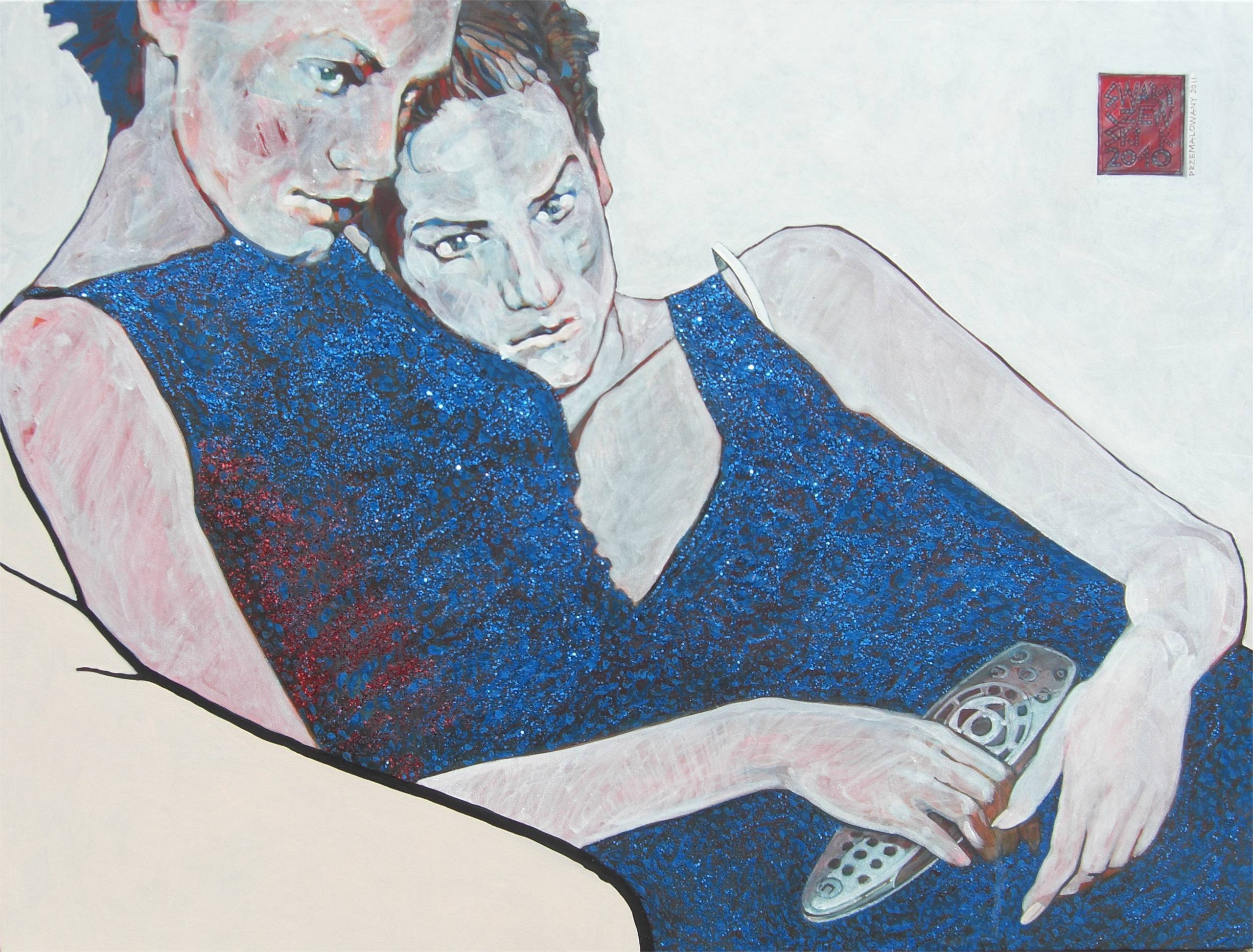 Mile spędzane wspólne chwile podczas oglądania TV. Obraz ma w sukienkach zatopiony brokat dzięki czemu połyskuje przy różnym oświetleniu (żyje własnym życiem).