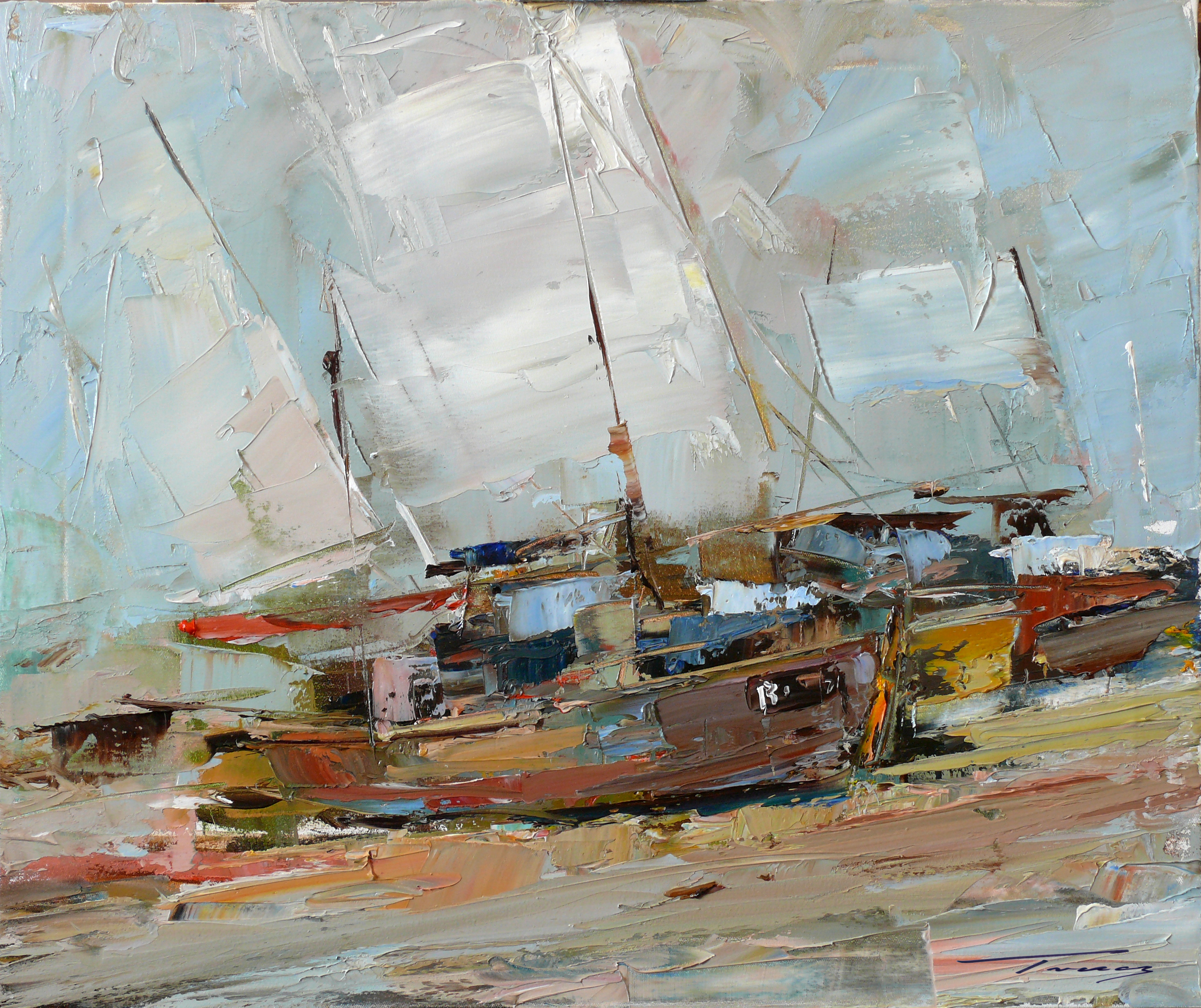 Obraz jest niezwykle dynamiczny jak dobra piosenka rockowa. Kolory dominujące to biel, błękit i brązy, które razem tworzą niemalże kolorystyczną mozaikę. Żagle są jakby poruszane przez wiatr, co dodaje całości dynamiki. Atmosfera na obrazie przypomina letni dzień nad morzem, pełen energii i spokoju jednocześnie. Artysta zastosował technikę impastu, nakładając grube warstwy farby. Ten styl przypomina nieco impresjonizm, ale z nowoczesnym twistem. Żaglówki piją wiatr, wszystko wydaje się być uchwycone w jednym krótkim momencie, który dla mnie jest pełen życia. Odbiorca może czuć się zrelaksowany, ale również podekscytowany. To obraz, który wywołuje uśmiech i może też trochę zadumy. Jakie to życie bywa nieprzewidywalne. Przypomniało mi się, jak sam byłem nad morzem, i to jest takie "coastal magic", kiedy czas staje w miejscu. Jedno jest pewne: ten obraz to nie tylko przedstawienie, ale też emocja. W tym wszystkim jest coś uzależniającego, coś, co sprawia, że chce się wracać do tego kadru jeszcze raz.