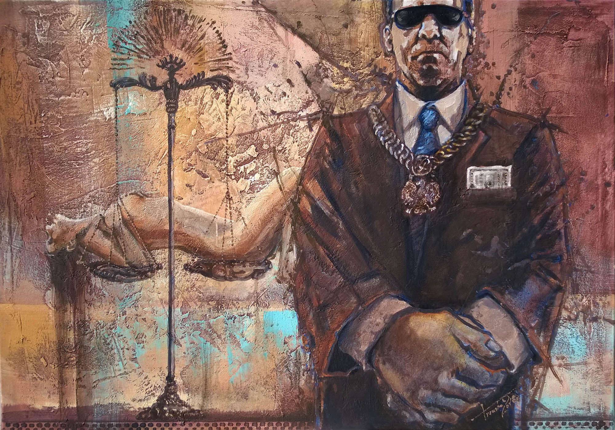 Obraz emanuje tajemniczą i nieco surową atmosferą. Dominują tu ciepłe brązy, beże, z odrobiną jasnego błękitu, które nadają mu głębokiej tonacji. Główną postacią jest mężczyzna w ciemnym garniturze, noszący masywny złoty łańcuch i okulary przeciwsłoneczne. Wygląda jak ktoś ważny, pewny siebie, niemalże intymiduący. Styl jest wyraźny, z mocnymi pociągnięciami pędzla, które uwydatniają teksturę i detalu. Element symetrii, przedstawiony przez wagę, wprowadza do kompozycji balans i odrobinkę symbolismu. Mężczyzna wygląda jak strażnik tajemnic, wokół niego wiążą się historie niewypowiedziane. To dzieło, które przez pewną surowość formy, skłania do zastanowienia. Wow, jaki duży naszyjnik ma ten pan! Technika artysty łączy realistyczne przedstawienie z elementem abstrakcji, zwłaszcza w tła, które przypomina zniszczoną ścianę pełną sekretów. A może to symbol władzy i kontrolowania? Połączenie kolorów i faktury może sprawić, że odbiorca poczuje się niemalże przytłoczony tą dominującą postacią. Czasem wyobraźnia podpowiada nam historie zwiazane z takimi obrazami, dając szansę na indywidualną interpretację. It's intriguing i zaskakujące, jak sztuka potrafi poruszać nasze emocje i myśli.