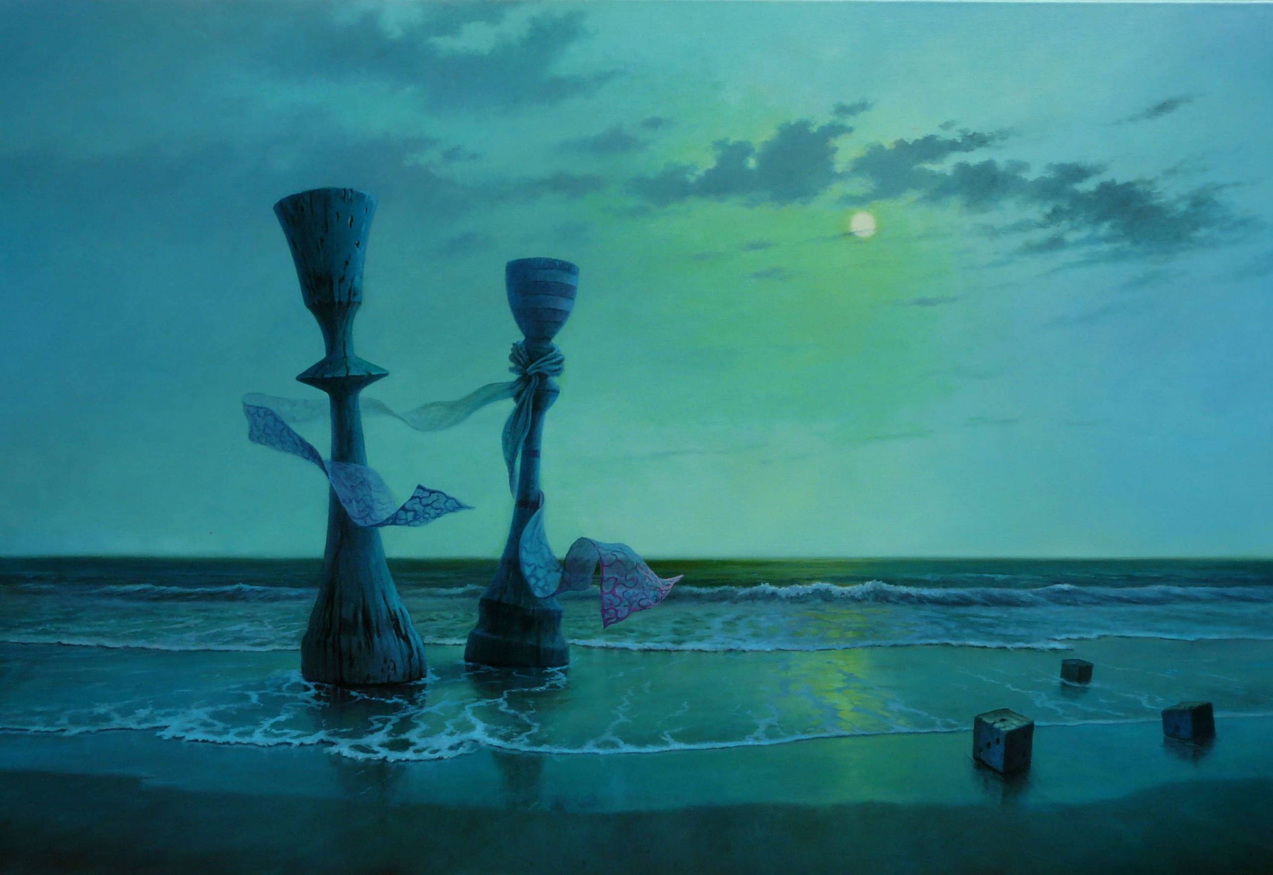Obraz przedstawia tajemniczy morski krajobraz oświetlony miękkim, zielonkawym światłem. Dominują tu chłodne, niebiesko-zielone tony, tworzące spokojną, a jednak nieco niespokojną atmosferę. Na pierwszym planie widzimy dwie abstrakcyjne formy, przypominające olbrzymie kielichy, ozdobione lekkimi, przezroczystymi wstęgami. Ich kształty są wyraziste i tajemniczo wyrzeźbione, unosząc się nad spokojną taflą wody. Mówić szczerze, sprawiają wrażenie, jakby nadawały ton całej kompozycji, przykuwając wzrok. Na horyzoncie widoczna jest nieco wzburzona linia fal, a nad nimi unoszą się ciemniejsze chmury, skrywające zachodzące słońce. Ten surrealistyczny obraz emanuje ciszą, która jest niemal namacalna. Można by rzec, że to coś pomiędzy snem a rzeczywistością, balansując na granicy jawy. Emocje, jakie wzbudza, to mieszanina spokoju i niepewności, zostawiając przy tym pole do licznych interpretacji. Artystyczne maniery zastosowane przez twórcę przywodzą na myśl techniki realistyczne, z nutą surrealizmu. Detale kształtów i harmonijna gra światła tworzą intrygującą iluzję. Może to i trochę crazy, ale widząc to, poczułem jakbym odkrywał jakąś tajemniczą historię, ukrytą w piaskach czasu, gdzie dzieci mogłyby powiedzieć – to chyba baśniowa kraina! Obraz jest subtelny, ale i intrygujący, zachęcając do refleksji nad nieznanym.