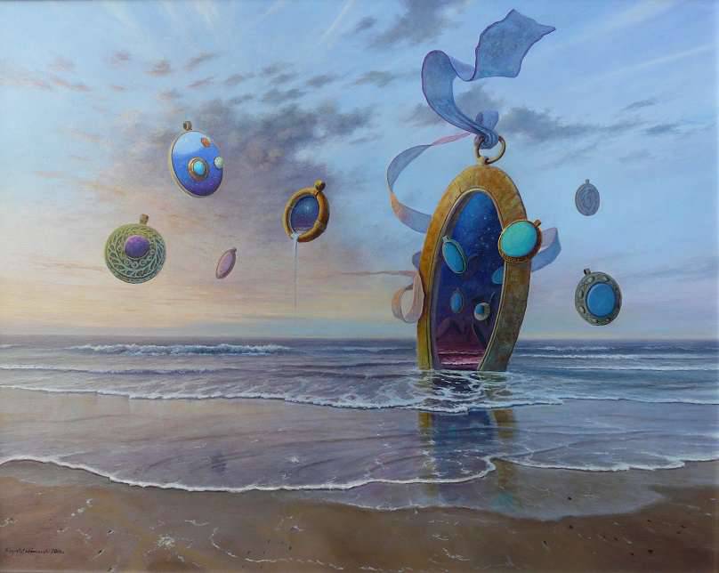 Na obrazie widzimy surrealistyczną scenę, gdzie na brzegu oceanu stoi tajemnicza brama. Obraz emanuje pastelowymi kolorami, głównie odcieniami błękitu, fioletu i złota. Niebo jest pokryte chmurami, które zdają się tańczyć z wiatrem. Powierzchnia wody subtelnie odbija otaczające elementy, tworząc efekt sennej iluzji. W powietrzu unoszą się zjawiskowe medaliony, które przywołują na myśl magiczne amulety. Niektóre z nich są duże i ciężkie, inne lekkie jak piórko. Kompozycja obrazu jest dynamiczna, ale jednocześnie zrównoważona, co nadaje mu eteryczny, niemalże dreamlike nastrój. Styl artystyczny jest bliski surrealizmowi, widać wpływy Salvadora Dalego. Technika olejna nadaje obrazowi gładkość i głębię. Odbiorca może poczuć stan zawieszenia między rzeczywistością a marzeniem. Dzieło wywołuje emocje tęsknoty za nieznanym. Może również pobudzić wyobraźnię, zmuszając do refleksji nad podróżami po wymiarach. Dziecko powiedziałoby pewnie: "Medaliony wyglądają jak cukierki w powietrzu!" Osobiście myślę, że obraz jest jak portal do innego świata, gdzie wyobraźnia nie zna granic. Wyjątkowo wciąga i intryguje, zostawiając widza z pytaniem: gdzie prowadzi ta magiczna brama?