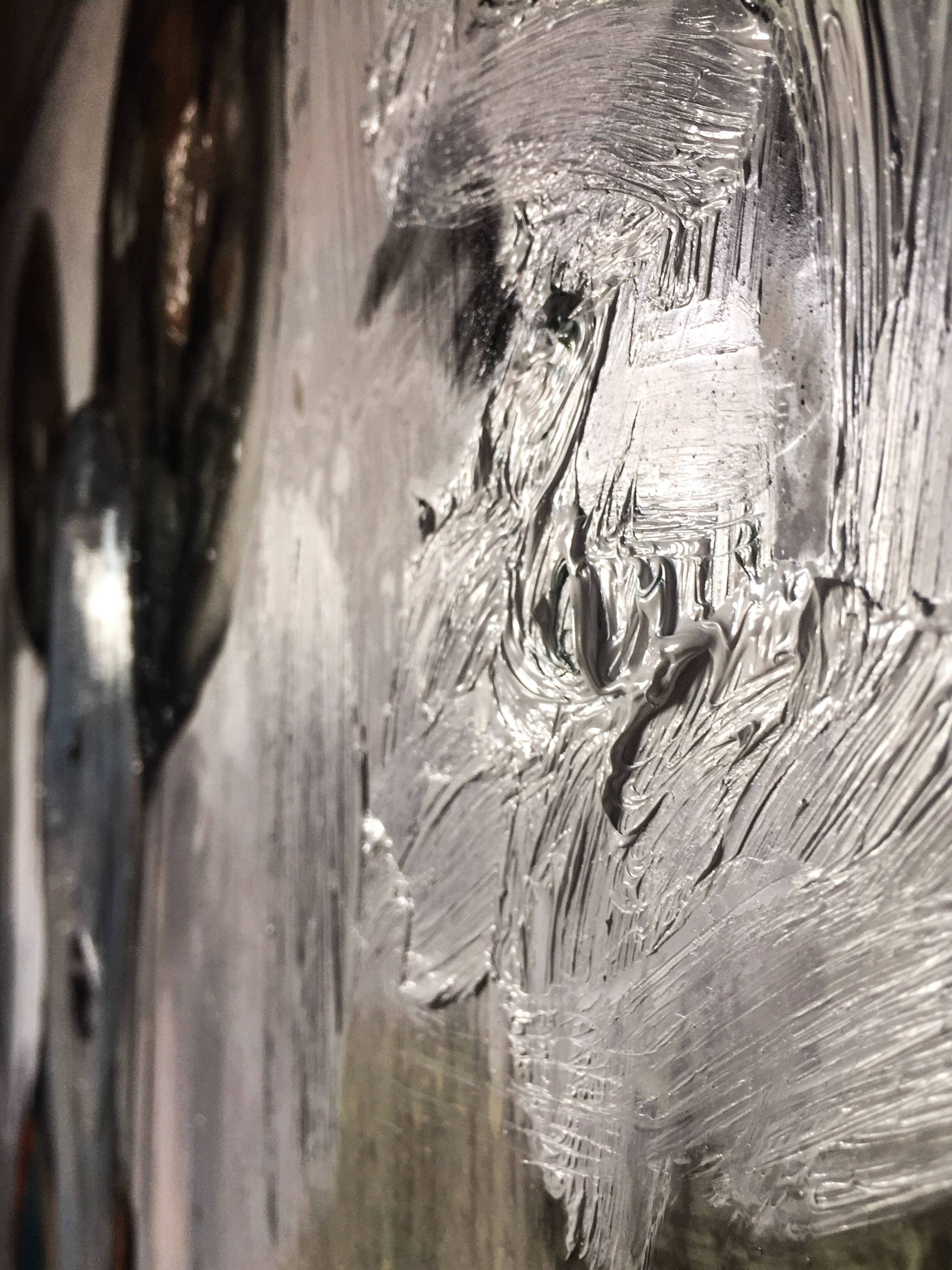 The oil painting was created by Kvila Bristenia on August 2017. Painting: oil on glass with the copper frame. Size: 91×71.