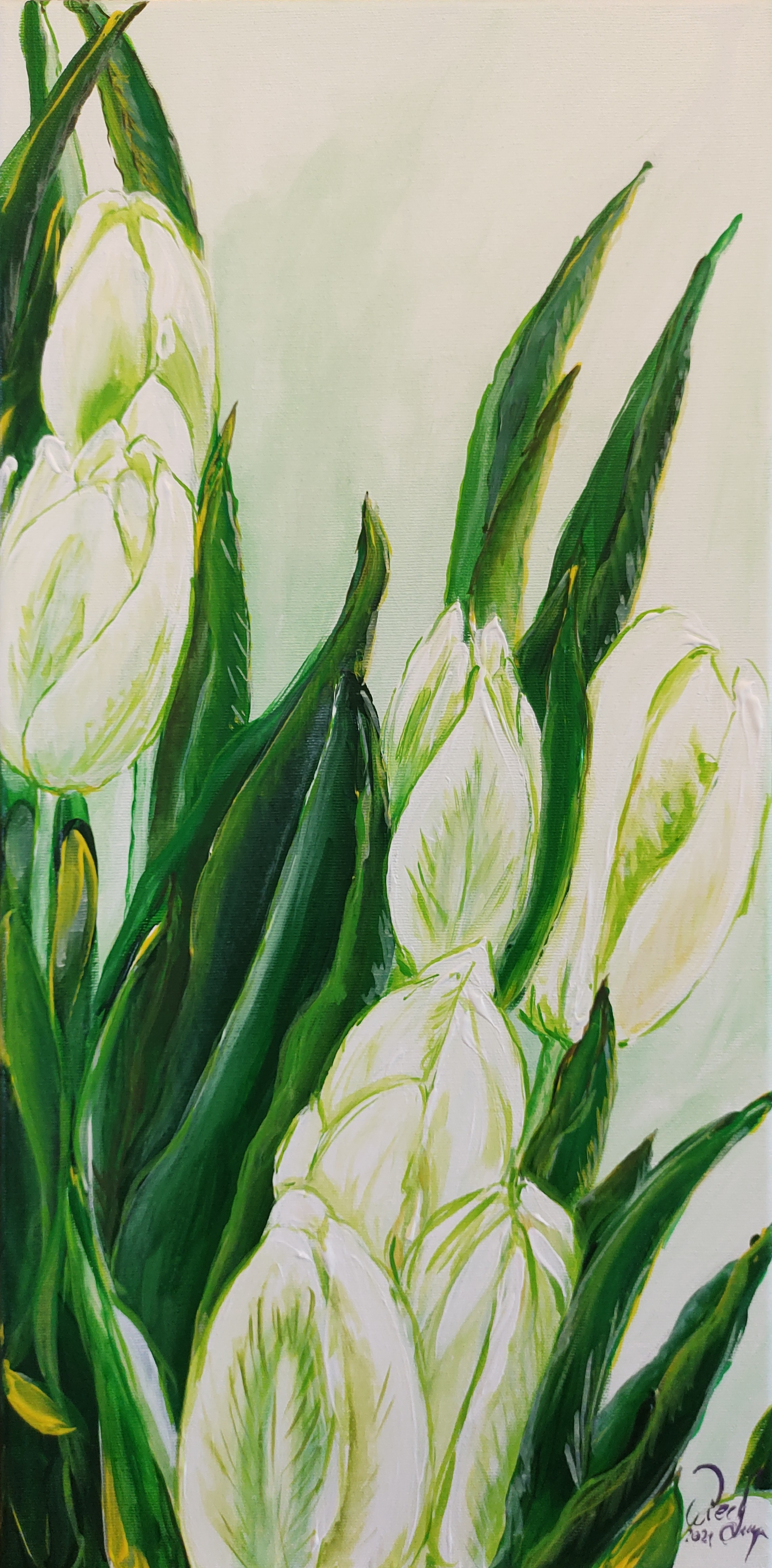 Na obrazie widać majestatyczne białe tulipany, które dumnie wyłaniają się z tła w odcieniach delikatnej zieleni. Ich płatki, skrzące się subtelnymi odcieniami bieli, kontrastują z ciemniejszymi, soczystymi liśćmi. Kompozycja skupia się na pionowych liniach, które przyciągają wzrok ku górze, nadając całości dynamiczny, a jednocześnie spokojny charakter. Obraz emanuje świeżością i wiosenną aurą, przypominając o delikatnych, ale nieustępliwych siłach natury. U boku tulipanów można poczuć spokój, a jednocześnie pewną dozę napięcia wynikającą z intensywności kolorów. Technika artystyczna charakteryzuje się płynnymi pociągnięciami pędzla, które nadają całości lekkiego, impresjonistycznego wdzięku. Malowanie wygląda jakby artysta chciał uchwycić moment przebudzenia się natury po długiej zimie. Dla niektórych widzów, obraz może symbolizować początek nowego etapu lub delikatność chwili. Ta prostota formy zaskakuje swoją głębią, a może też przypominać o ulotności życia, które, jak te tulipany, kwitnie przez krótki czas.