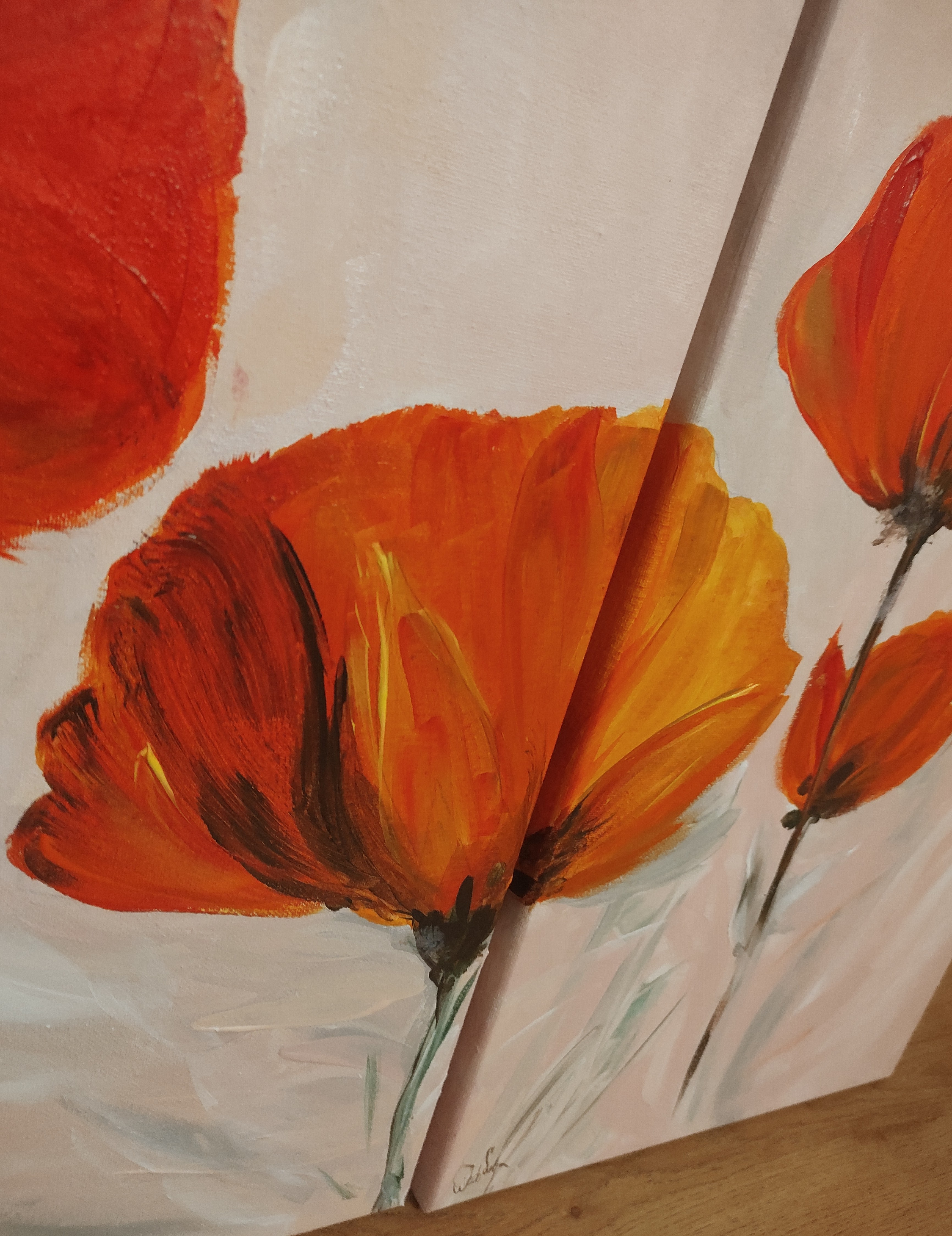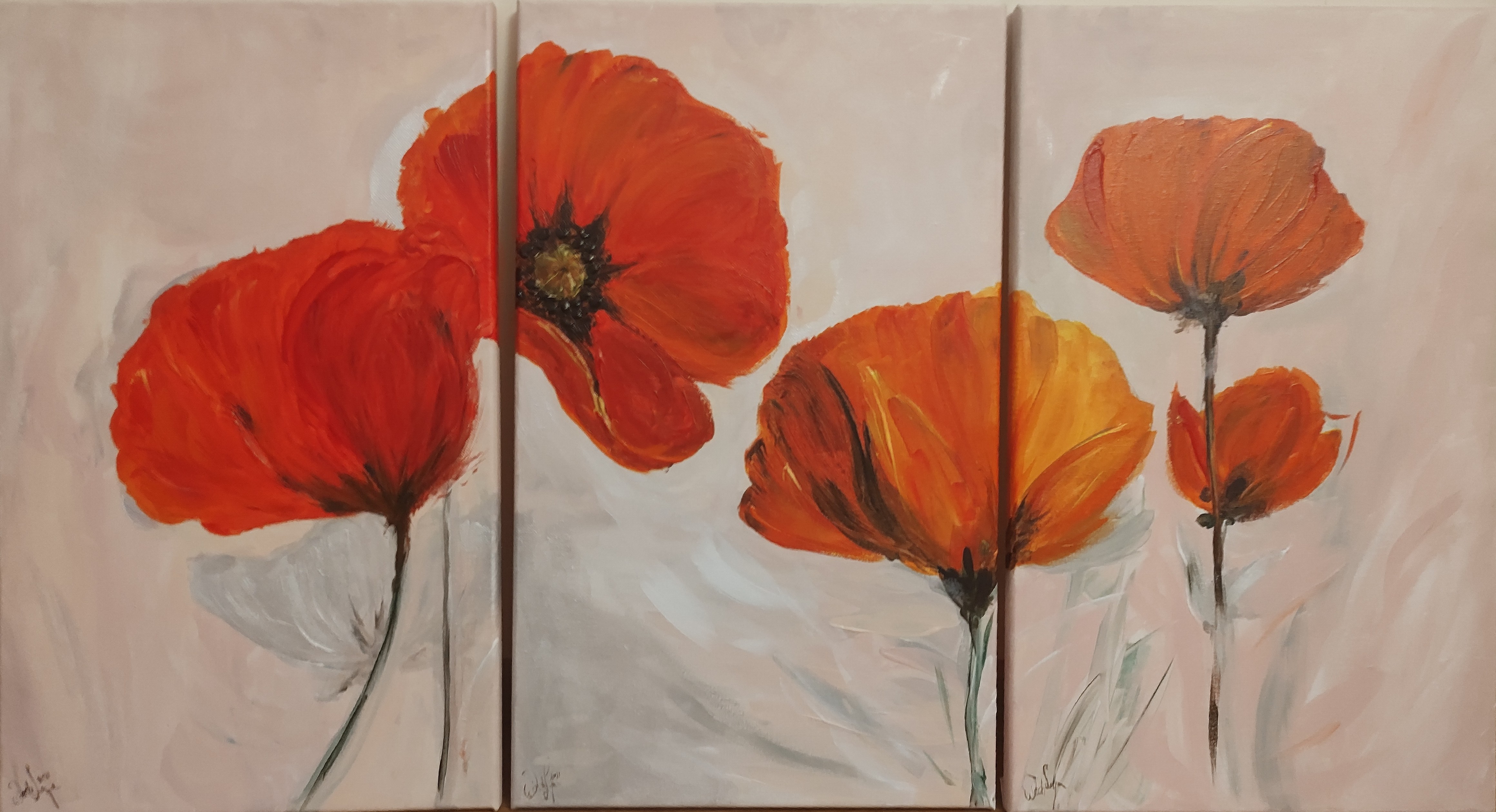 Na obrazie widzimy trzy panele z dynamicznie rozwijającymi się makami, które rozciągają się z gracją na tle delikatnego, jasnego tła. Głęboka czerwień kwiatów aż bije po oczach, na ich płatkach widać subtelne przejścia kolorów od pomarańczu do ciemnego bordo. Artysta wykorzystał płynne pociągnięcia pędzla, tworząc efekt naturalnego ruchu i lekkości. Kompozycja jest prosta, niemal minimalistyczna, ale niezwykle efektowna. Obraz emanuje spokojem i delikatną elegancją, jednocześnie przyciągając wzrok swoim intensywnym kolorem. Wygląda jakby kwiaty miały zaraz zatonąć w porannie rosie, a może to drifting clouds? Styl jest modernistyczny, z odrobiną impresjonistycznego podejścia do światła. Odbiorca może poczuć nostalgię, a może też radosną prostotę natury, chwytając chwilę ulotnej piękności kwitnienia. Dla mnie, to jak wspomnienie letniego dnia, kiedy wszystko wydaje się możliwe. Błędy i niedoskonałości dodają mu uroku i autentyczności.