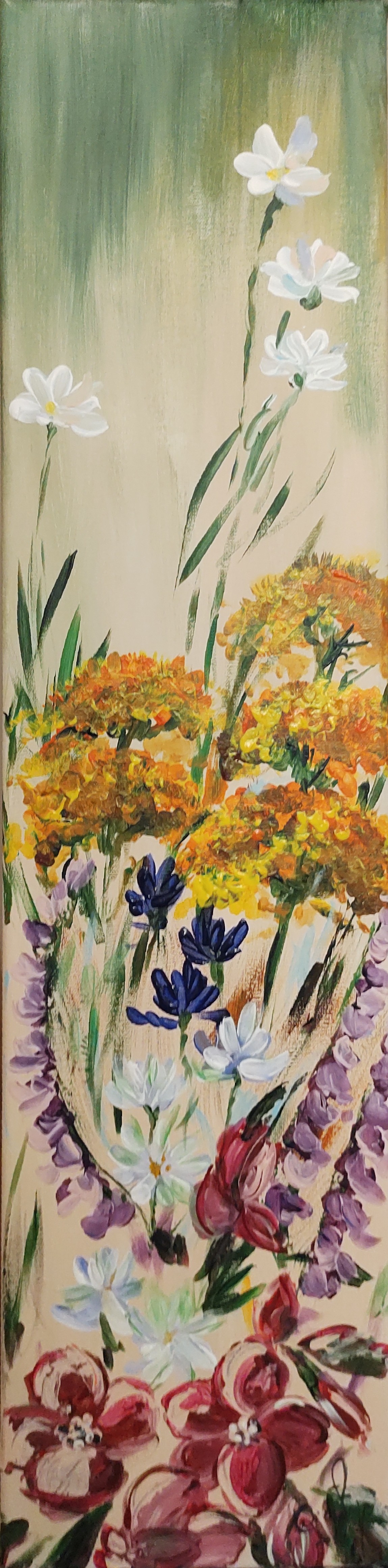 Obraz emanuje malowniczym ciepłem, przyciągając wzrok bogactwem kolorów i kwiatowych motywów. Dominują odcienie zieleni, które tworzą spokojne tło dla intensywnej, wręcz eksplodującej żywiołowości kwiatów w pomarańczach, czerwieniach i fioletach. Kształty są swobodne, niemal impresjonistyczne, co daje wrażenie dynamicznej gry świateł i kolorów. Atmosfera w obrazie jest pełna radości i beztroski, jak letni poranek na łące. Artysta użył techniki farb olejnych, co nadaje dziełu głębię i teksturę. Pociągnięcia pędzla są energiczne, przypominające spontaniczny taniec kolorów. Patrzenie na ten obraz wywołuje uczucie harmonii i lekkości, jakby czas na chwilę się zatrzymał, dając nam szansę na pełne zanurzenie się w pięknie natury. Wizualna feeria kolorów może inspirować do refleksji nad ulotnością chwili i pięknem przyrody. Jest w tym coś magicznego, jakby artysta uchwycił "magic moment" przyrody. Odbiorca może poczuć wewnętrzny spokój, ale też entuzjazm i wdzięczność za to, co natura ma do zaoferowania. Takie obrazy przypominają nam, że nawet w codziennym chaosie warto chwilę przystanąć i dostrzec piękno wokół nas.