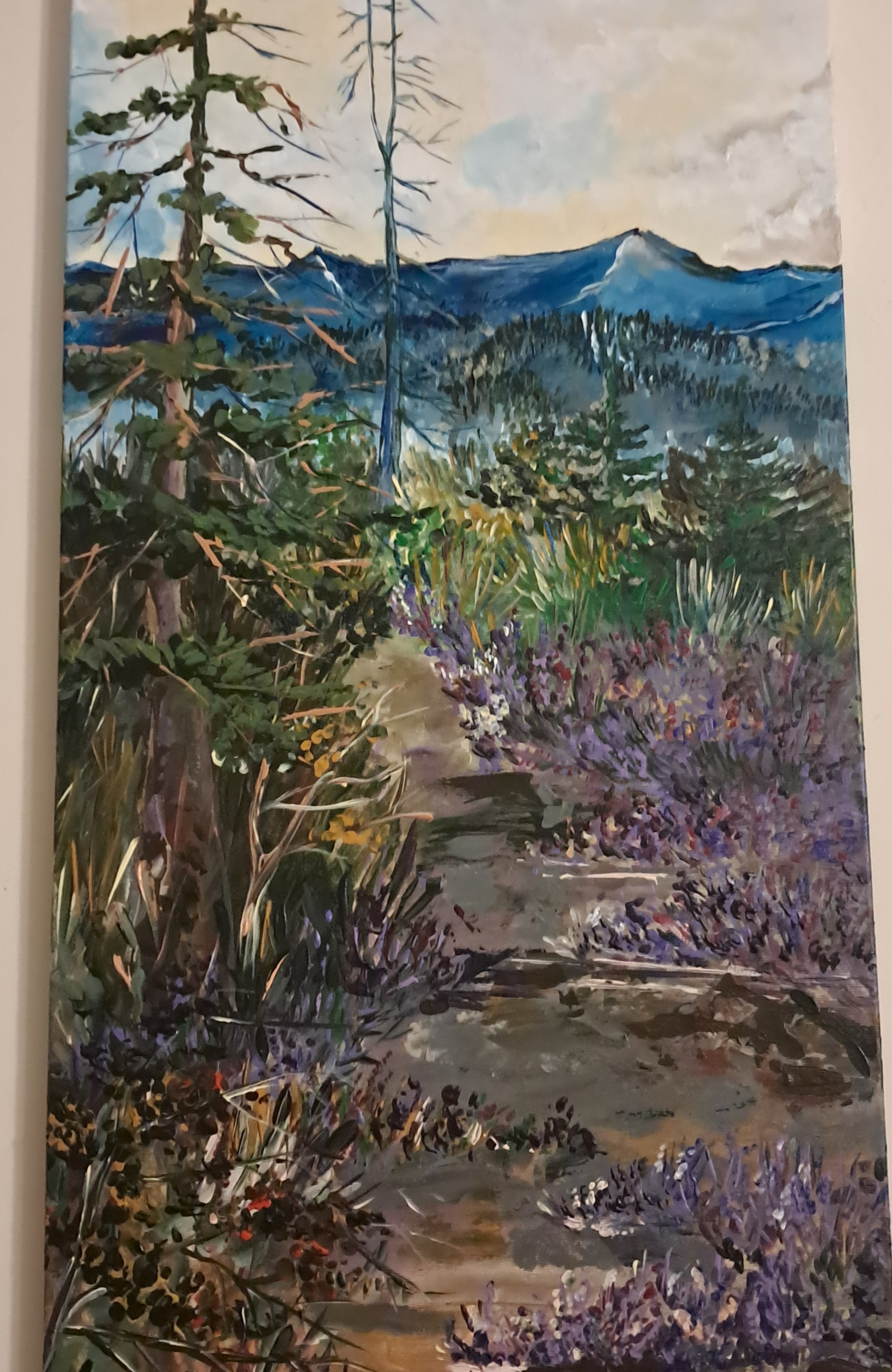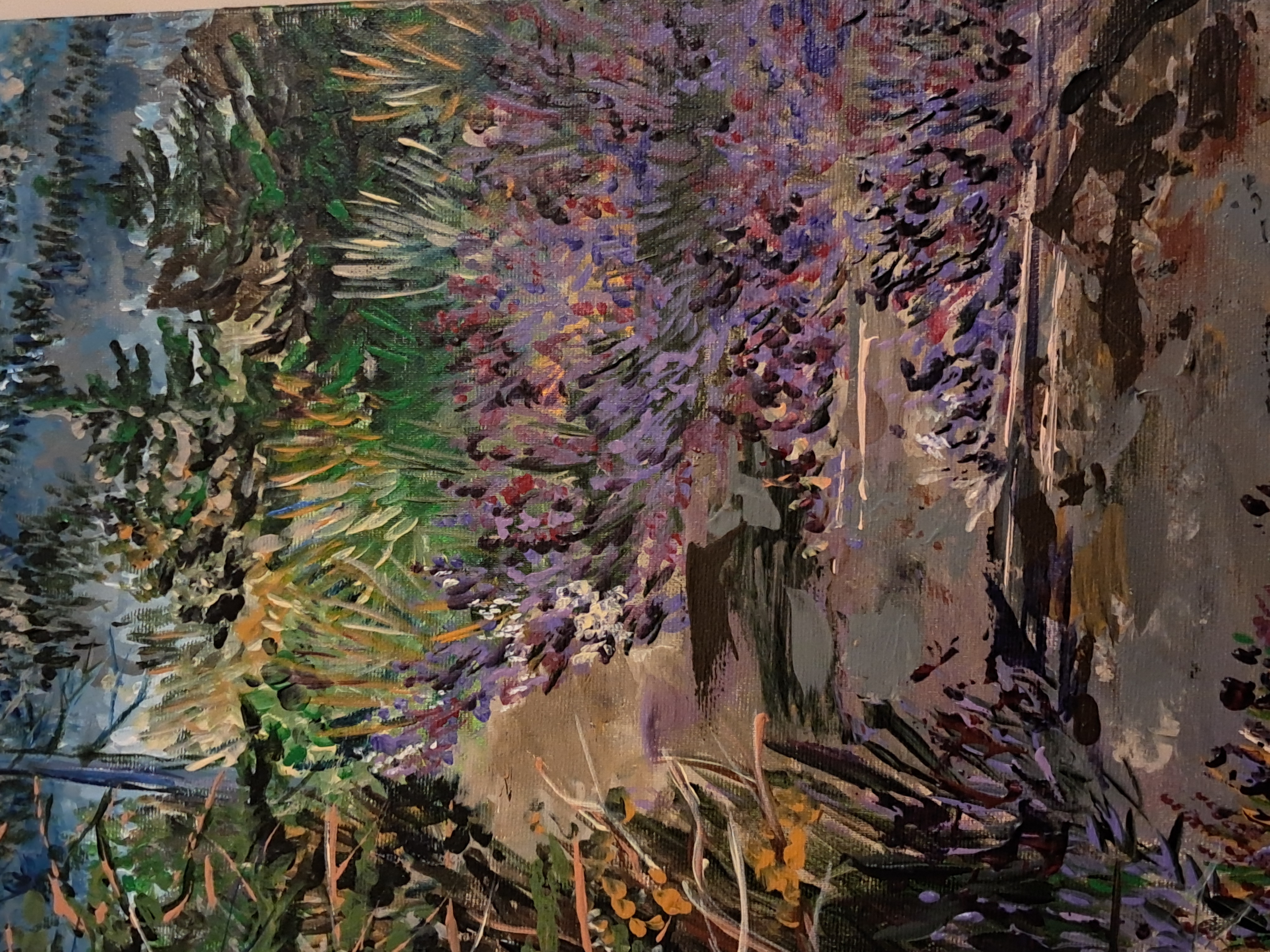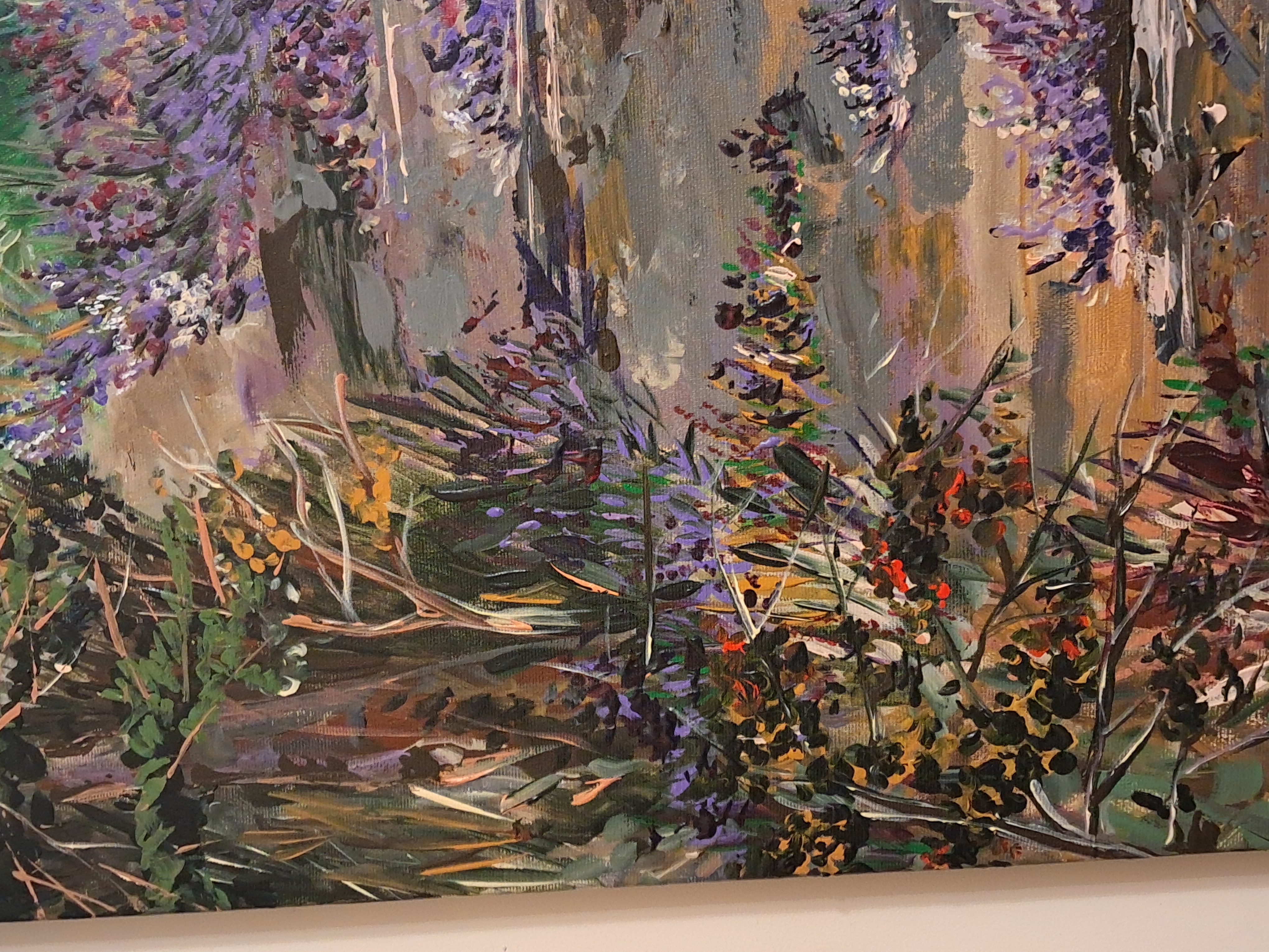 Obraz przedstawia malowniczy krajobraz leśny, pełen żywych odcieni zieleni, fioletu i błękitu. Na pierwszy plan wysuwają się drzewa o smukłych, nieco postrzępionych gałęziach, które zdają się być osadzone na tle górskiej panoramy. Kolory mieszają się ze sobą w technice przypominającej impresjonizm, gdzie każdy pędzel tworzy dynamiczną i niemalże pulsującą teksturę. Nastrój obrazu jest spokojny, ale jednocześnie witalny, jak poranek w magicznej krainie. Zastosowane techniki artystyczne przykuwają oko, jakby artysta chciał uchwycić chwilową grę światła i cienia. Każdy detal wprowadza do scenerii głębię, przy czym ścieżka wijąca się wśród roślinności wprowadza widza w głąb świata przedstawionego. Obraz jest jak sen o niekończącej się przygodzie w sercu natury. Widz patrząc na ten obraz, może poczuć ciszę przerywaną jedynie szumem wiatru. Myślę, że mogłbym tam stać godzinami. To takie beautiful, że aż dech zapiera.