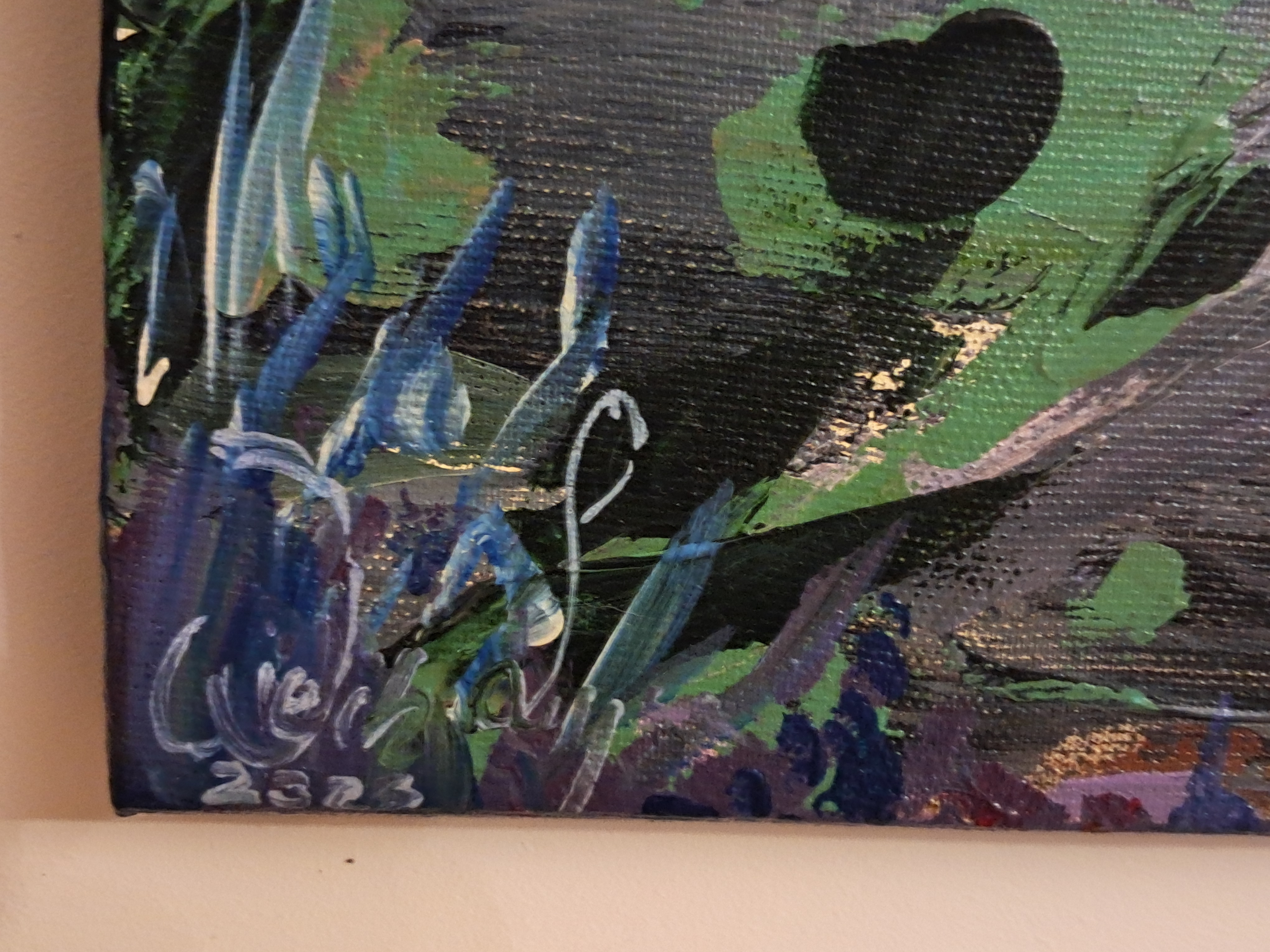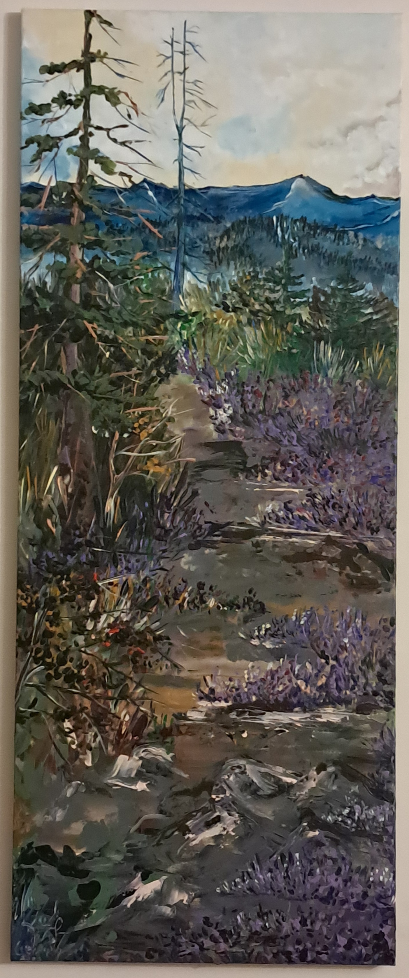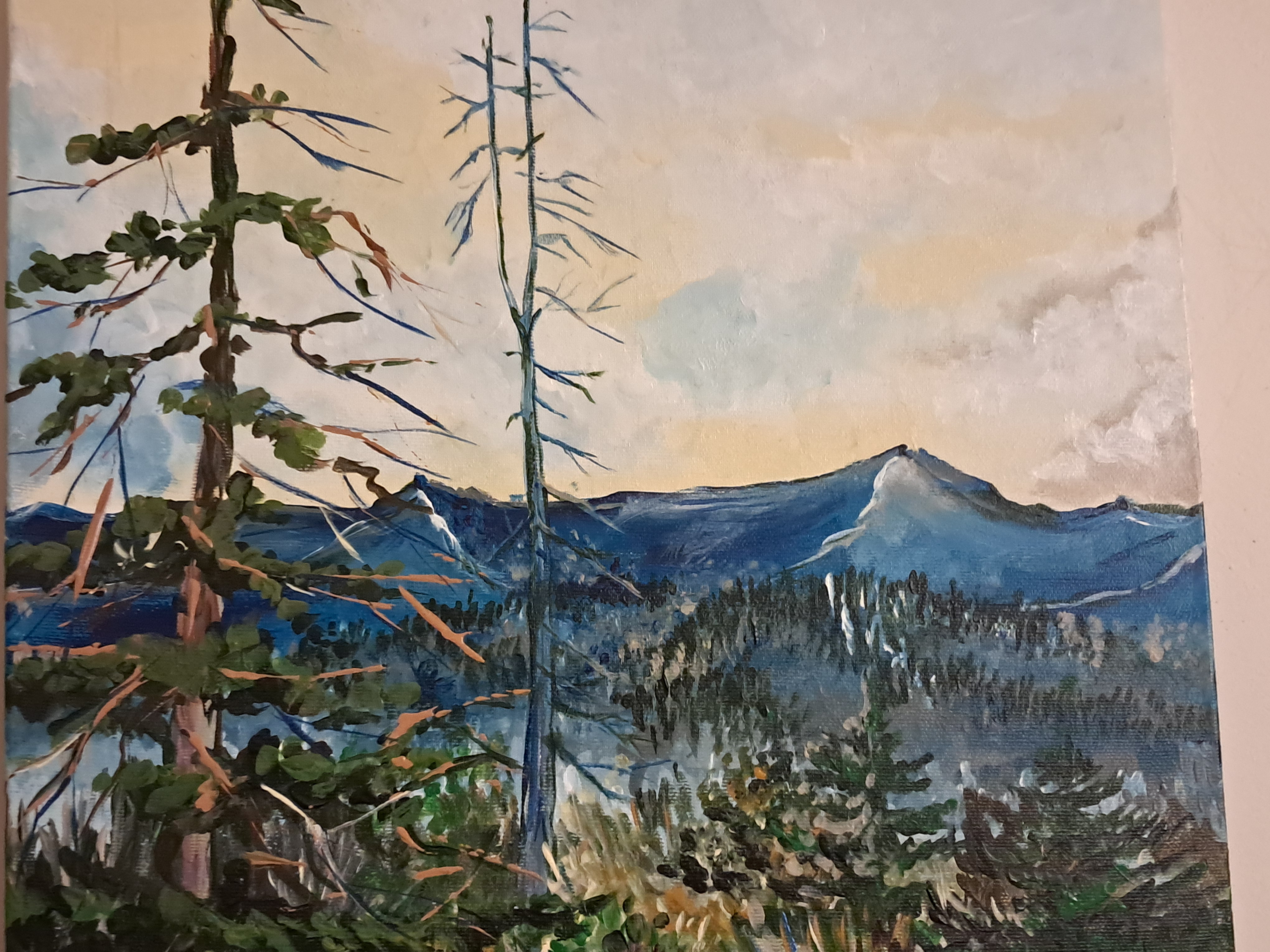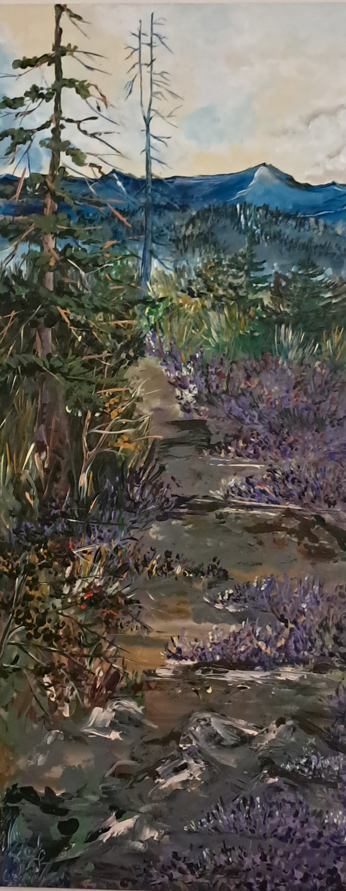 Obraz przedstawia malowniczy krajobraz leśny, pełen żywych odcieni zieleni, fioletu i błękitu. Na pierwszy plan wysuwają się drzewa o smukłych, nieco postrzępionych gałęziach, które zdają się być osadzone na tle górskiej panoramy. Kolory mieszają się ze sobą w technice przypominającej impresjonizm, gdzie każdy pędzel tworzy dynamiczną i niemalże pulsującą teksturę. Nastrój obrazu jest spokojny, ale jednocześnie witalny, jak poranek w magicznej krainie. Zastosowane techniki artystyczne przykuwają oko, jakby artysta chciał uchwycić chwilową grę światła i cienia. Każdy detal wprowadza do scenerii głębię, przy czym ścieżka wijąca się wśród roślinności wprowadza widza w głąb świata przedstawionego. Obraz jest jak sen o niekończącej się przygodzie w sercu natury. Widz patrząc na ten obraz, może poczuć ciszę przerywaną jedynie szumem wiatru. Myślę, że mogłbym tam stać godzinami. To takie beautiful, że aż dech zapiera.