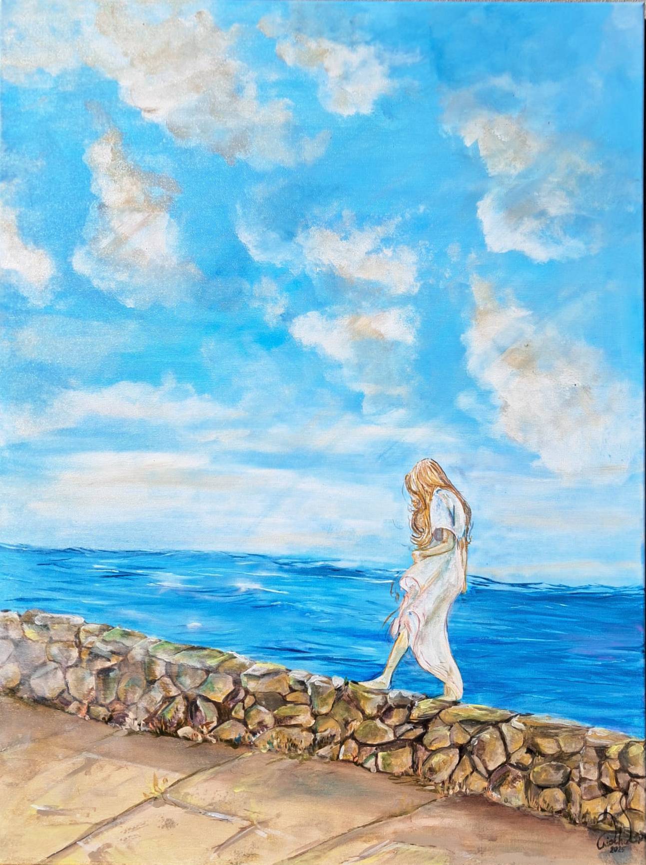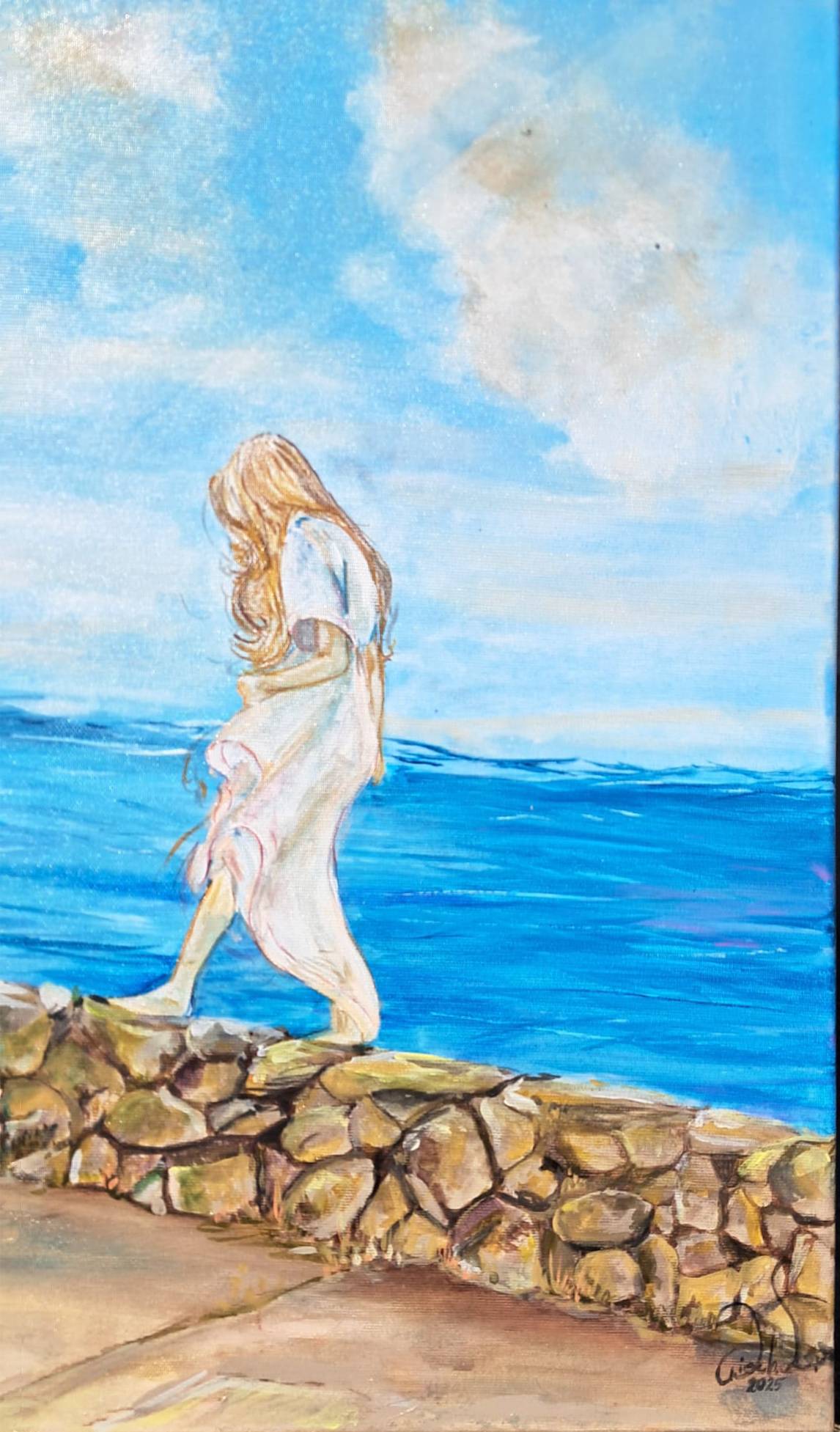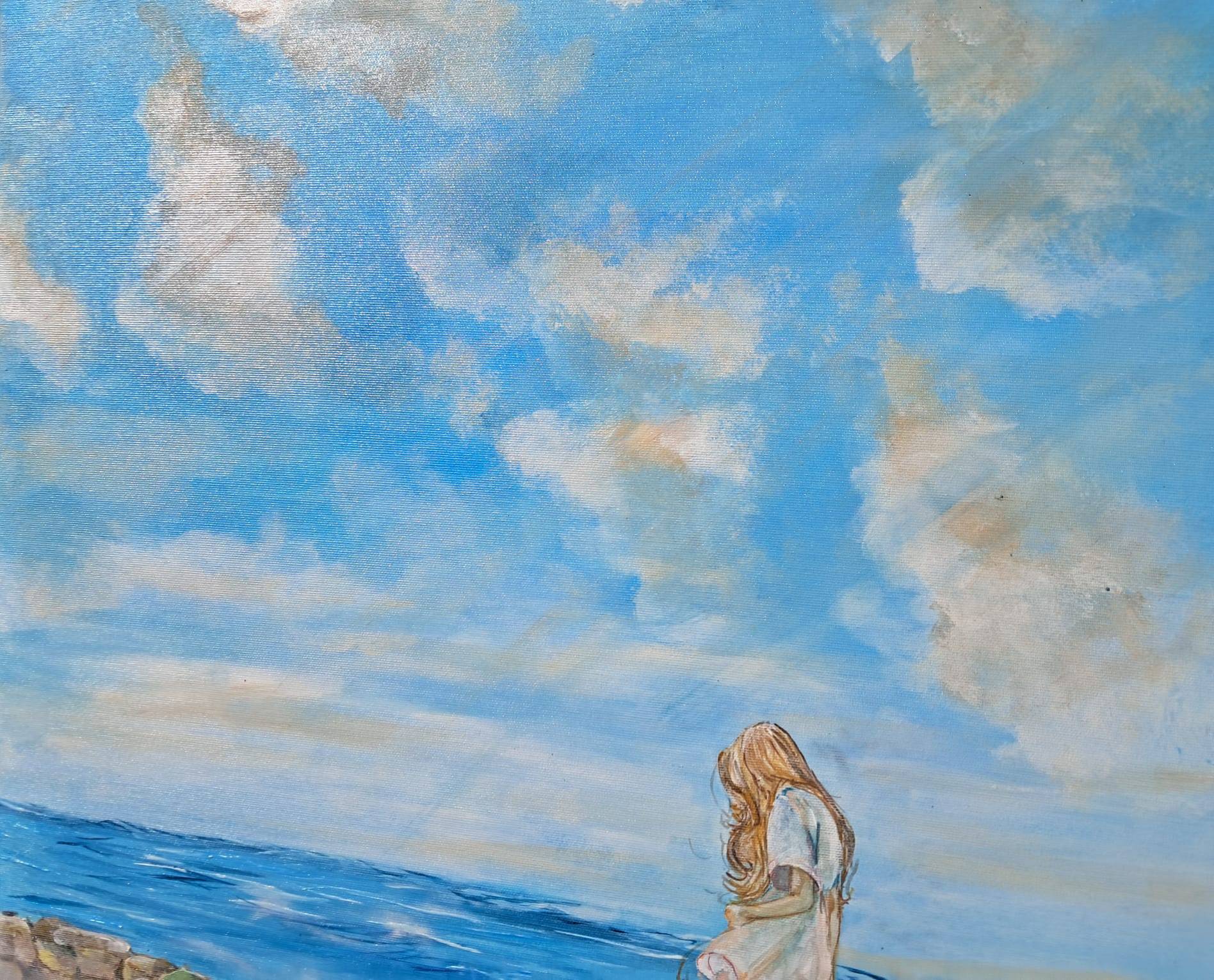 Nie wiem, kim jest osoba na obrazie, ale widok jest naprawdę urokliwy. Obraz przedstawia czyste, błękitne niebo, ozdobione białymi, puszystymi chmurami, które zdają się płynąć w nieskończoność. Artysta wspaniale oddał delikatność chmur poprzez subtelną grę światła i cienia. Na dole, spokojne morze współgra z kolorem nieba, tworząc harmonijną całość. Nadmorski brzeg urozmaicają kamienie, a sylwetka osoby spoglądającej na wodę dodaje scenie cichej refleksyjności. Atmosfera obrazu jest niezwykle spokojna, niemal medytacyjna. Można poczuć lekki powiew morskiej bryzy. Znajdujemy się gdzieś między snem a jawą, zatrzymując się na chwilę w codziennym pośpiechu. Styl obrazu jest spokojny, impresjonistyczny, malowany delikatnymi pociągnięciami pędzla. Czuć emocje, jakby artysta próbował uchwycić ulotność chwili. Patrząc na ten obraz, czułem się jakbym sam stał nad brzegiem, zastanawiając się nad sensem życia. Wow, to takie deep! W tym wszystkim jest coś takiego, co sprawia, że chcemy się zatrzymać na dłużej, zamyślić i może nawet zapisać w pamięci te chwile na "forever". To właśnie ta magia sztuki, która pozwala nam podróżować bez ruszania się z miejsca. Chciałbym, żeby moje wakacje zawsze wyglądały tak jak na tym obrazie.