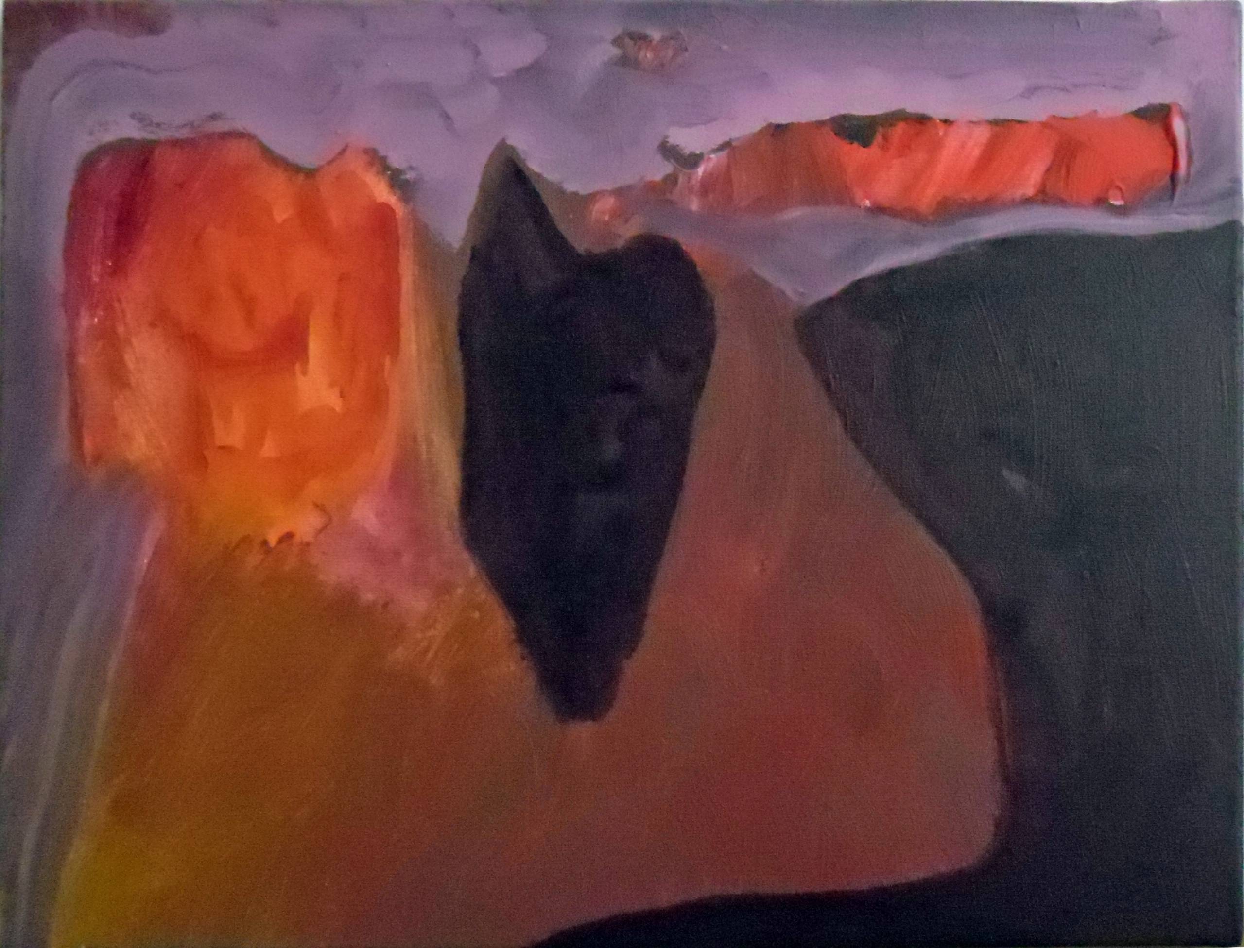 Na obrazie dominują ciepłe odcienie pomarańczu i czerwieni, kontrastujące z ciemnym, niemal czarnym centrum. Wszystko wygląda jakby ktoś rozlał kolorowe farby i pozwolił im się swobodnie mieszać. Kompozycja jest dynamiczna, a kształty są abstrakcyjne, bez wyraźnych konturów, co dodaje obrazu tajemniczości. Atmosfera dzieła jest nieco enigmatyczna, może nawet niepokojąca, ale jednocześnie intrygująca. Wydaje się, jakby obraz próbował coś opowiedzieć, ale zostawia duże pole do interpretacji. Artysta zastosował technikę impasto, co widać po grubych pociągnięciach pędzla i teksturze płótna. To, w jaki sposób kolory się mieszają i nakładają, przypomina niespieszny taniec, który wciąga w swoją głębię. Dla mnie, ten obraz to podróż przez sen, który chociaż trochę mroczny, nie pozwala oderwać oczu. Czuję tu jakąś magię, jakieś "wow", które ciężko opisać słowami. Może to pejzaż widziany o zmierzchu? A może coś zupełnie innego? Trudno powiedzieć. Jak patrzę na ten obraz, myślę sobie, że to takie dziwne, ale czadowe rozwiązanie kolorystyczne. Jakby ktoś poddenerwowany próbował całemu światu wyrazić swoje uczucia. Z każdym spojrzeniem odkrywam coś nowego, może zato jest taki porywający. Coś w tym jest, że czasem abstrakcja mówi więcej niż realistyczne przedstawienia. Obraz ten na pewno wywołuje emocje, często nieokreślone, troszkę melancholijne, ale na pewno niezapomniane.