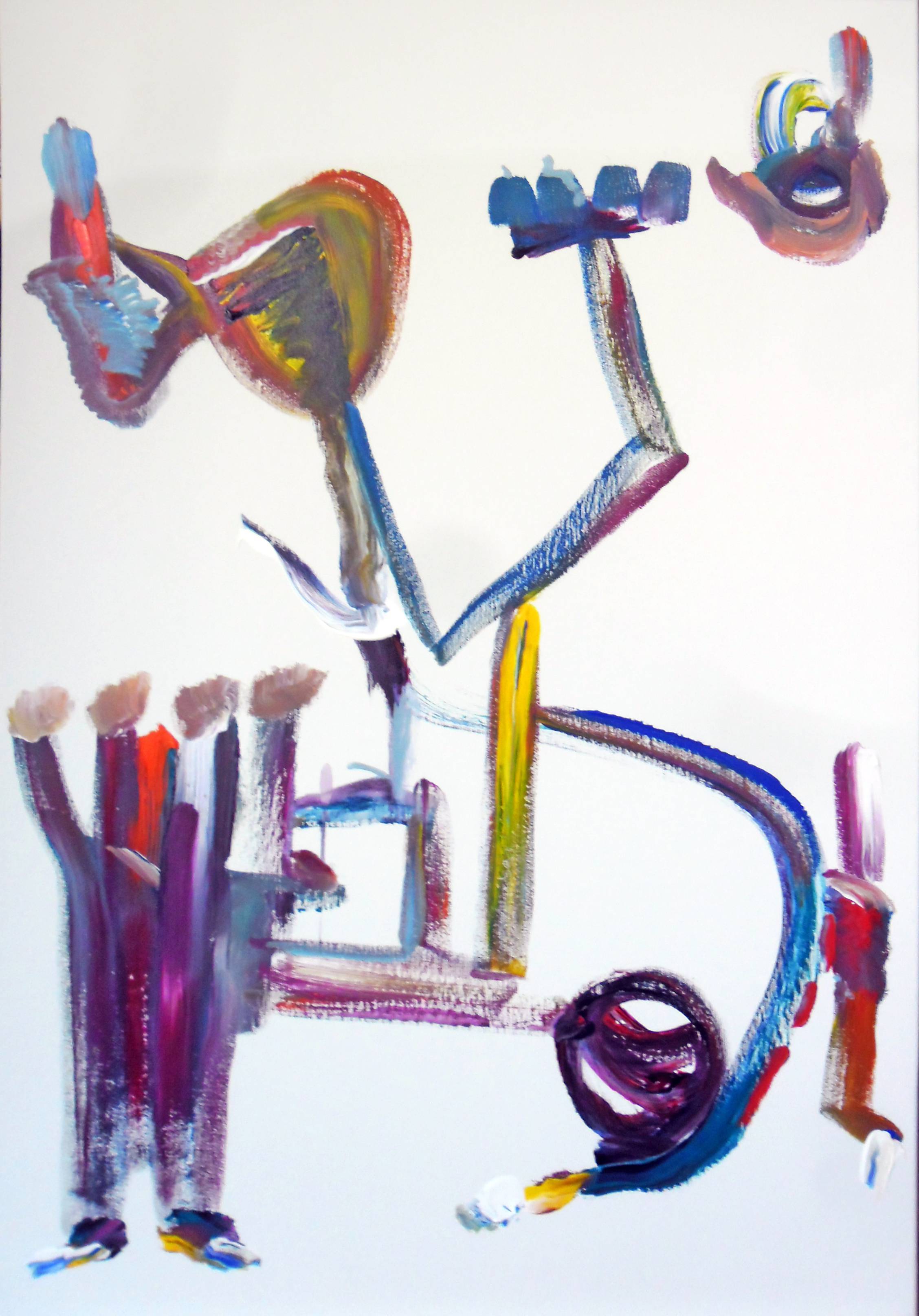 Obraz to prawdziwa eksplozja kolorów i emocji. Dominują na nim odważne barwy - intensywne czerwienie, głębokie błękity i tajemnicze fiolety. Kompozycja jest dynamiczna, chaotyczna trochę, ale ma w sobie coś hipnotyzującego. Linia zatacza się i wiją się na płótnie niczym ścieżki myśli malarza. Trochę jakby kółka i patyczki, które dziecko mogłoby narysować magicznym markerem. Nastrój obrazu to na pewno playful harmony. Widać, że artysta używał techniki grubo nakładanej farby, dodając fakturę, która aż się prosi, by ją dotknąć. Tworzy to wrażenie ruchu i głębi. Patrząc, można poczuć zwiewność, ale i pewną ekspresję. Obraz się nie spieszy, ale chce powiedzieć coś ważnego, choć nie do końca wiadomo co. Taki trochę filozof. Dzieło wzbudza w odbiorcy ciekawość i lekki niepokój. Kojarzy mi się z nieodgadnioną melodią, która wibruje w powietrzu. Można też poczuć coś jakby dziecięcą radość z odkrywania. To co prawda abstrakcja, ale nie jest wyłącznie sztuką dla sztuki. Emocje, które z niego płyną, są szczere. Patrząc na to, przypominają mi się dziecięce dni, kiedy wszystkie kolory były wyjątkowe.