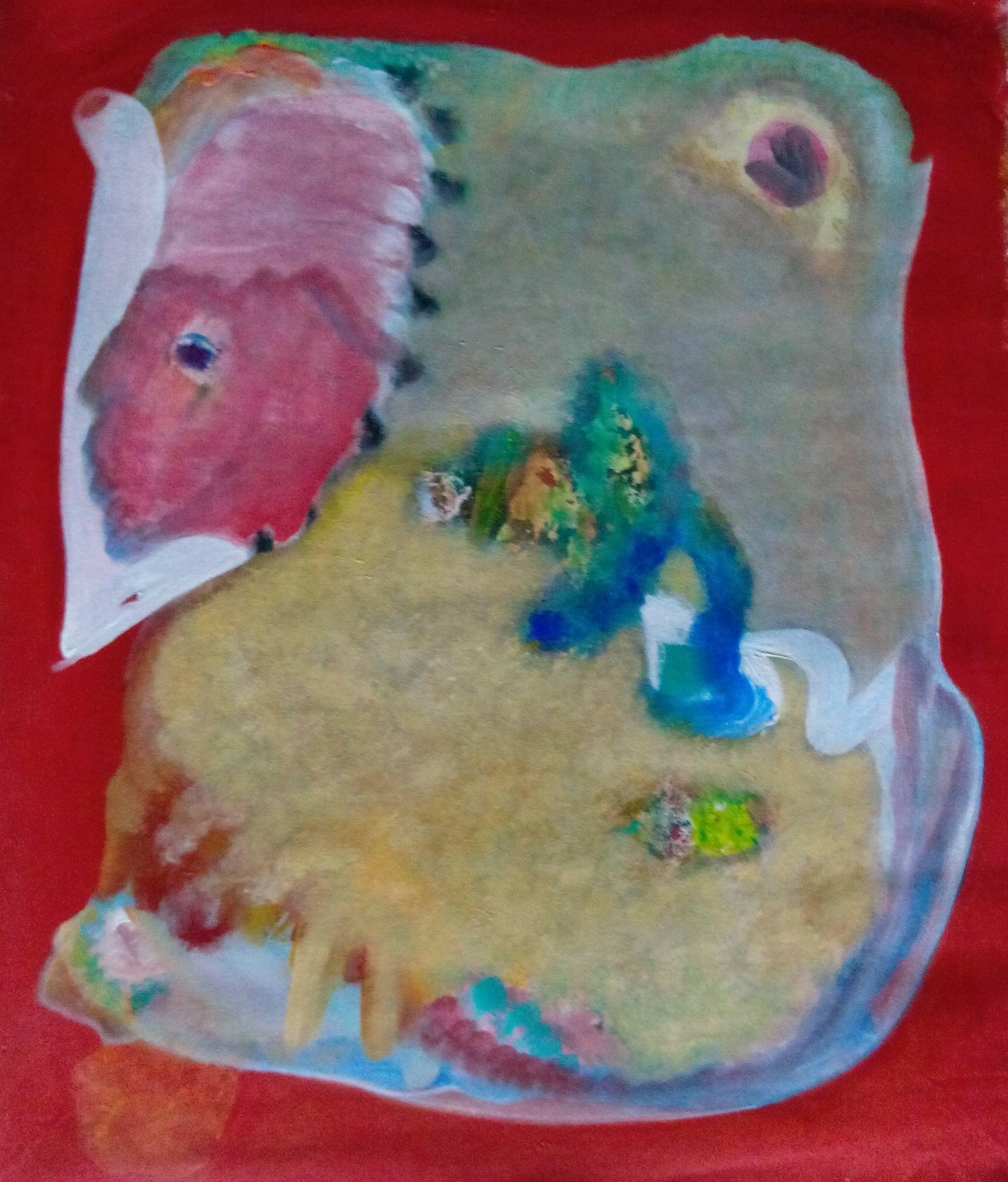 Obraz emanuje eksplozją kolorów. Dominują tu ciepłe odcienie czerwieni i różu, które kontrastują z chłodnym turkusem i zielenią. Centralna kompozycja zdaje się być abstrakcyjną mapą emocji, gdzie swobodnie mieszają się kształty i barwy, niczym w kalejdoskopie. Wyczuwam w tym chaosie artystyczny zamysł, jakby przesłanie było ukryte w bałaganie form. Warstwy farby, nakładane niemalże jak w technice impasto, dodają dziełu głębi i faktury. To jakby ktoś malował palcami. Obraz przywodzi na myśl niespokojny sen pełen niejasnych symboli. Ma to w sobie jakiś "magic touch". Patrząc na niego, czuję mieszaninę zagubienia i zadziwienia. Można się zastanawiać, czy czerwone tło symbolizuje niepokój, czy po prostu pasję. Dla siedmiolatka mogłoby wyglądać to jak wieloryb w kosmosie! Przyjemność z odkrywania tajemnic tego płótna może być porównywalna do czytania książki bez słów, gdzie każda strona jest niespodzianką.