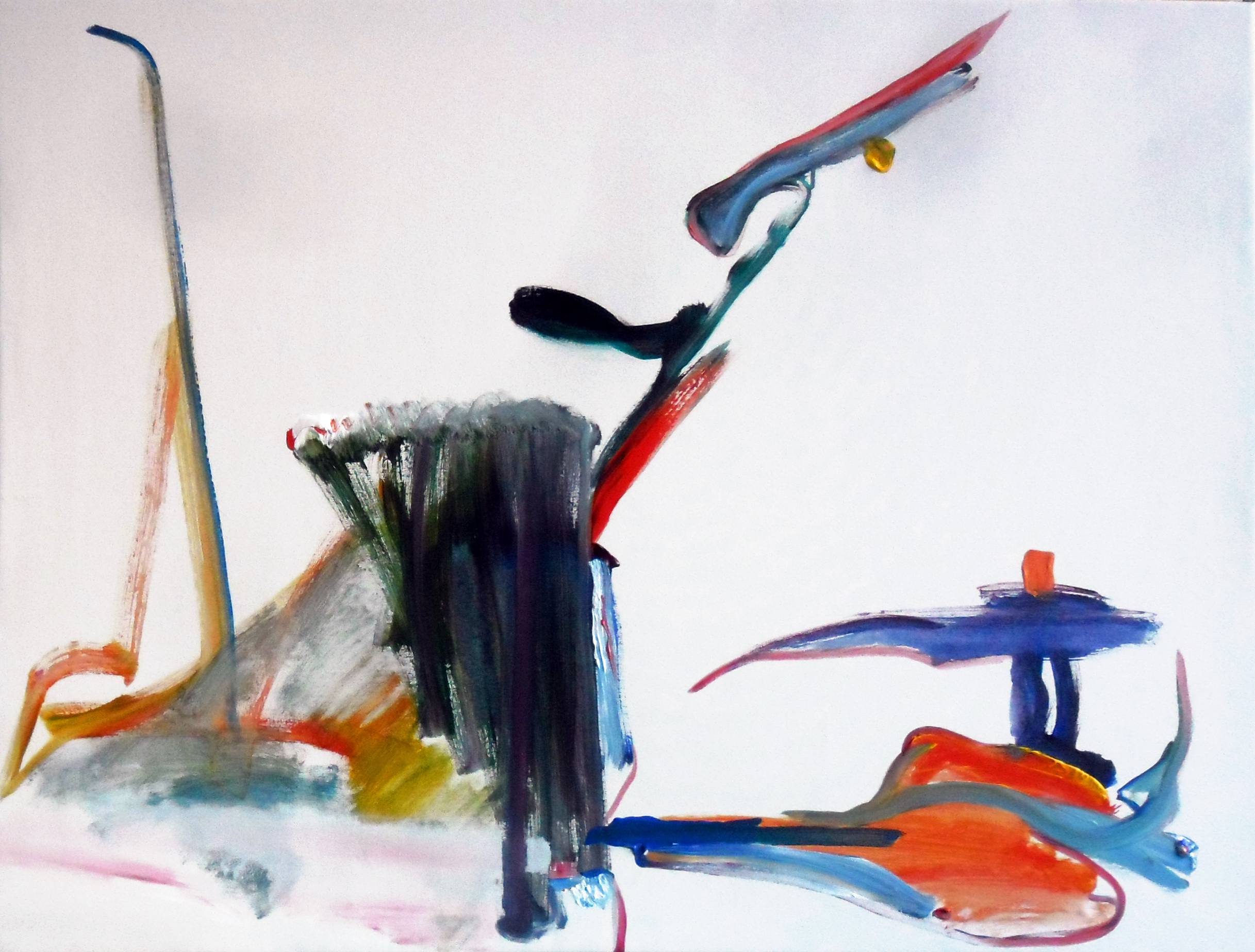 Na obrazie dominuje abstrakcyjna kompozycja pełna dynamicznych pociągnięć pędzla, które tworzą intrygującą mieszankę kolorów i kształtów. Z prawej strony widzimy niebiesko-pomarańczowe formy, jakby rozwiane porywem wiatru, z kolei lewa strona zdaje się tętnić chaosem ciemniejszych tonów. Czerwień i zielenie wprowadzają nutę niepokoju, a ostrzejsze kolory dodają energii. Niebo rozmyte, pełne pustki bieli, tworzy kontrast, podkreślając intensywność pozostałych elementów. Ten obraz przemawia do nas swoją ekspresjonistyczną formą, coś jak crazy ride przez uczucia. Artysta używa techniki impastu, co dodaje głębi i trójwymiarowości. Każdy pociągnięcie pędzla jest jak oddech – nierównomierny, ale z pasją. Obraz emanuje niepokojem i jednocześnie intrygą. Dzieło to może wywoływać różnorodne emocje, od ekscytacji po kontemplację. Z jednej strony, patrząc na te kształty, można się zastanowić: „Co tu się właściwie dzieje?” Niektórych może przyciągać jego dynamika, innych zaś uspokajać jego abstrakcyjność. Wow, niebo jest takie duże! Osobiście czuję, że ten obraz to jak spacery w nieznane, pełne nieoczekiwanych zakrętów, które wciąż na nowo odkrywają samego siebie. I to jest fascynujące. It's like a whirlwind of emotions captured in one frame.