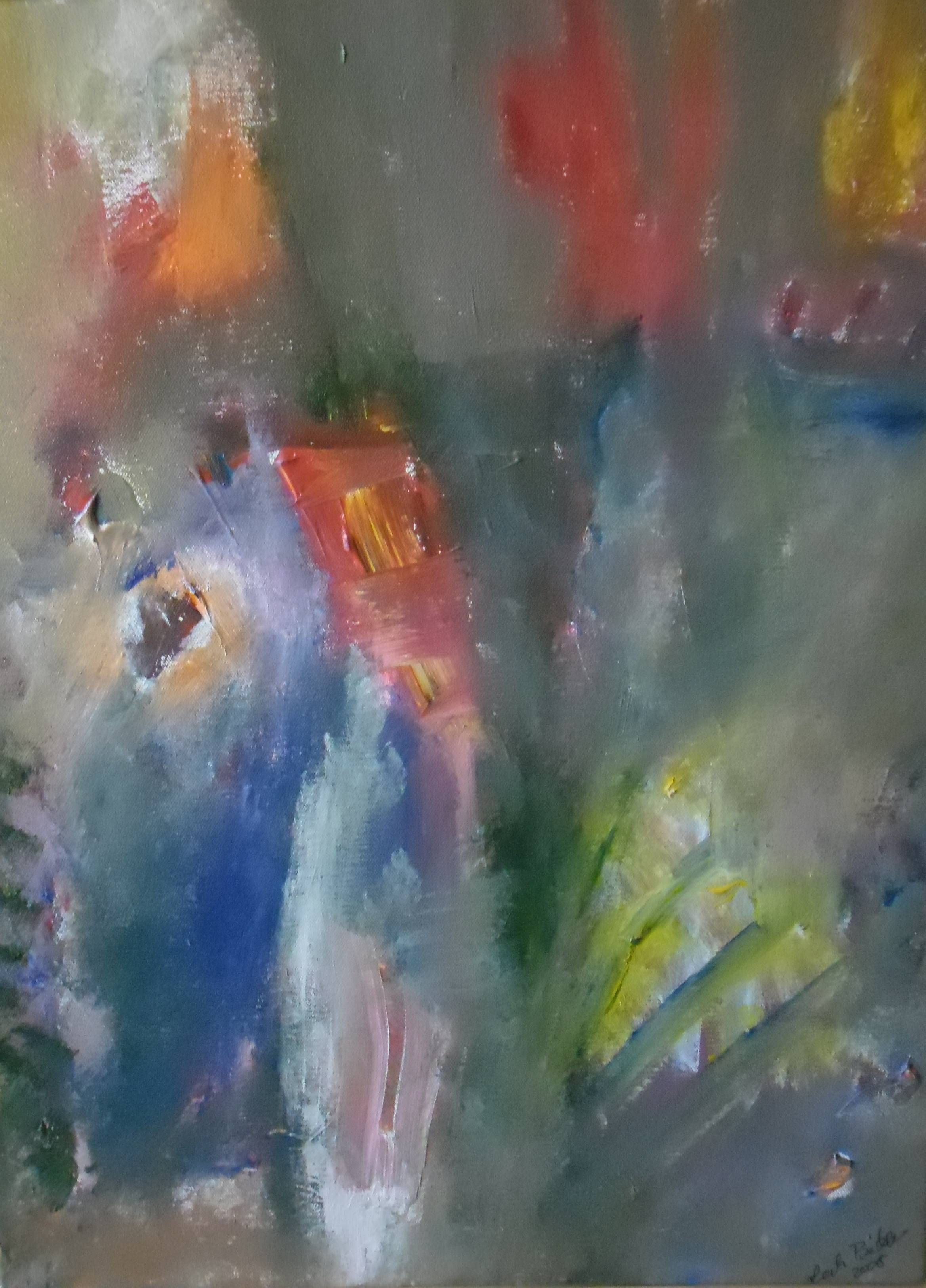 Obraz emanuje mistyczną atmosferą, składając się z nieregularnych kształtów i niewyraźnych konturów. Śmiałe, nasycone kolory, takie jak czerwienie, błękity i zielenie, przenikają się wzajemnie, tworząc dynamiczną kompozycję. Niby-tło, niby forma. To trochę jak marzenie senne. Dominujący szary odcień dodaje całości tajemniczości, sprawiając, że widz od razu zaczyna się zastanawiać. Artysta zastosował ekspresyjne pociągnięcia pędzla i intensywne kontrasty kolorystyczne, co nadaje pracy energię i intensywność. Technika impastowa przywodzi na myśl spontaniczność i emocjonalność. Ten obraz wywołuje skojarzenia z nieodkrytymi historiami i sekretami. Może dlatego, że nie wszystko musi być na "first sight" jasne. Patrząc na ten obraz, można poczuć się jak w innej rzeczywistości. A ja widzę w nim kolorowy balon, który unosi się w chmurach. Odbiorca może odkrywać różne emocje – od zadumy po radość. Pełen życia i pełen tajemnicy, obraz z pewnością przyciąga i intryguje swoją nieokiełznaną formą.