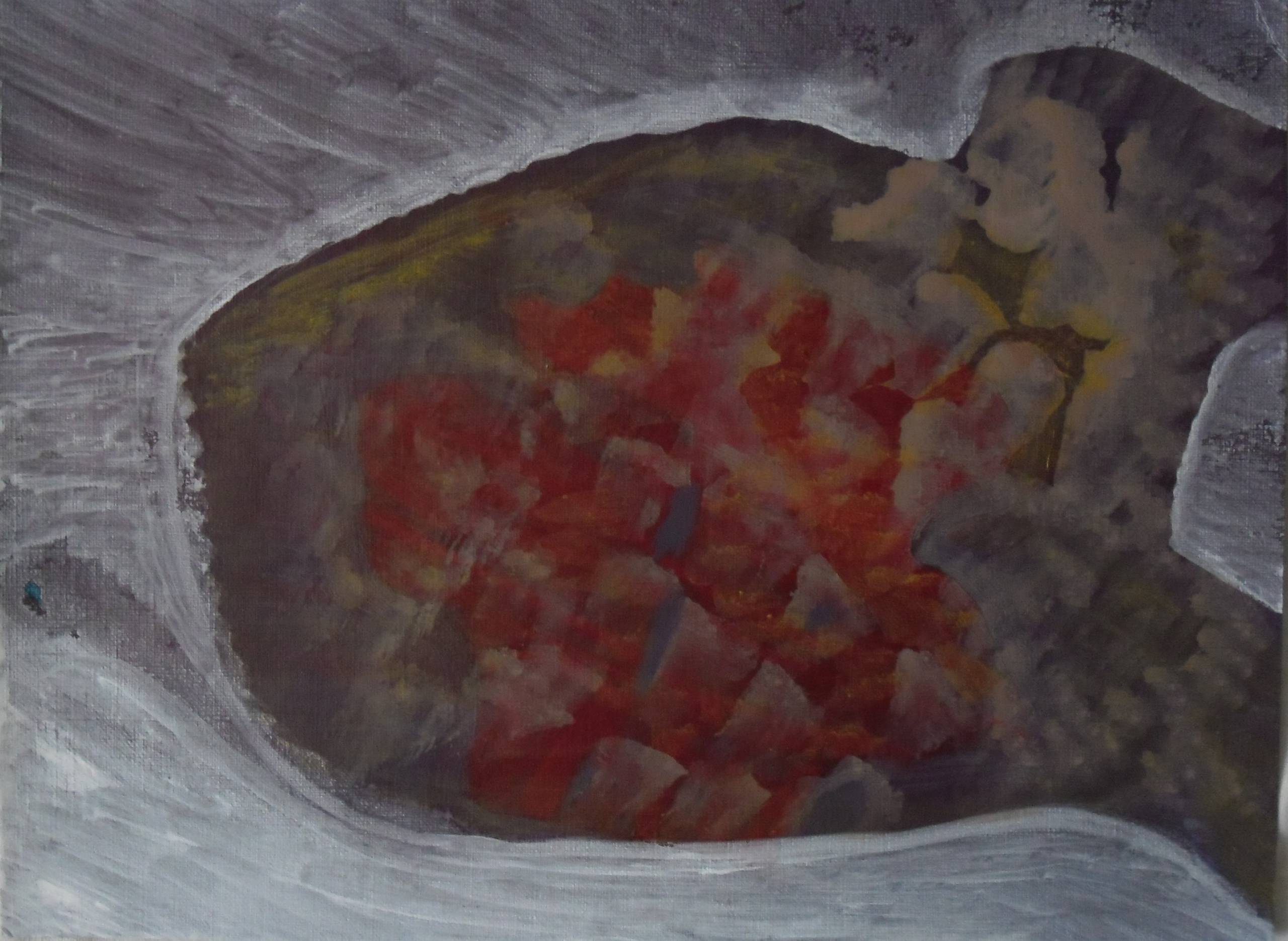 Obraz, na który patrzymy, zdaje się być wirującą kompozycją w stonowanych odcieniach szarości, otaczającą intensywniejsze, ciepłe kolory czerwieni i pomarańczu. Te żywe barwy przypominają płatki kwiatów lub może chmurę dymu, unoszącą się w środku czegoś ciemniejszego. Tło ma miękkie, płynne linie prowadzące wzrok, co dodaje dynamiki i poczucia głębi. Całość wydaje się zamglona, jakbyśmy spoglądali na nią przez lekko zroszoną szybę. Atmosfera obrazu jest nieco tajemnicza i wręcz melancholijna. Mimo ciemniejszej palety, dzięki ciepłym odcieniom w centrum, czujemy pewne napięcie – jakby za chwilę coś miało się wydarzyć. Artysta użył techniki, która balansuje na granicy abstrakcji z nagłym przebłyskiem realizmu. Pociągnięcia pędzla są miękkie i rozmyte, co wprowadza element niedopowiedzenia. Obraz wywołuje emocje refleksji, spokoju, ale i niepokoju. Czy to chaos czy harmonia? Może widzisz coś zupełnie innego. Gdy patrzę, wydaje mi się, że zatańczyć z tymi kolorami to taka troszkę "cool" sztuka. Może to przypomnienie, by były dni, gdy po prostu trzeba się zatrzymać i popatrzeć, znaleźć sens w bezkształtnej formie. Dla dziecka to może być plama, którą pokolorowała chmurka po zjedzeniu dużego, czerwonego lizaka! Obraz, niczym kalejdoskop, przyciąga do siebie, zmusza do zatrzymania się na chwilę.