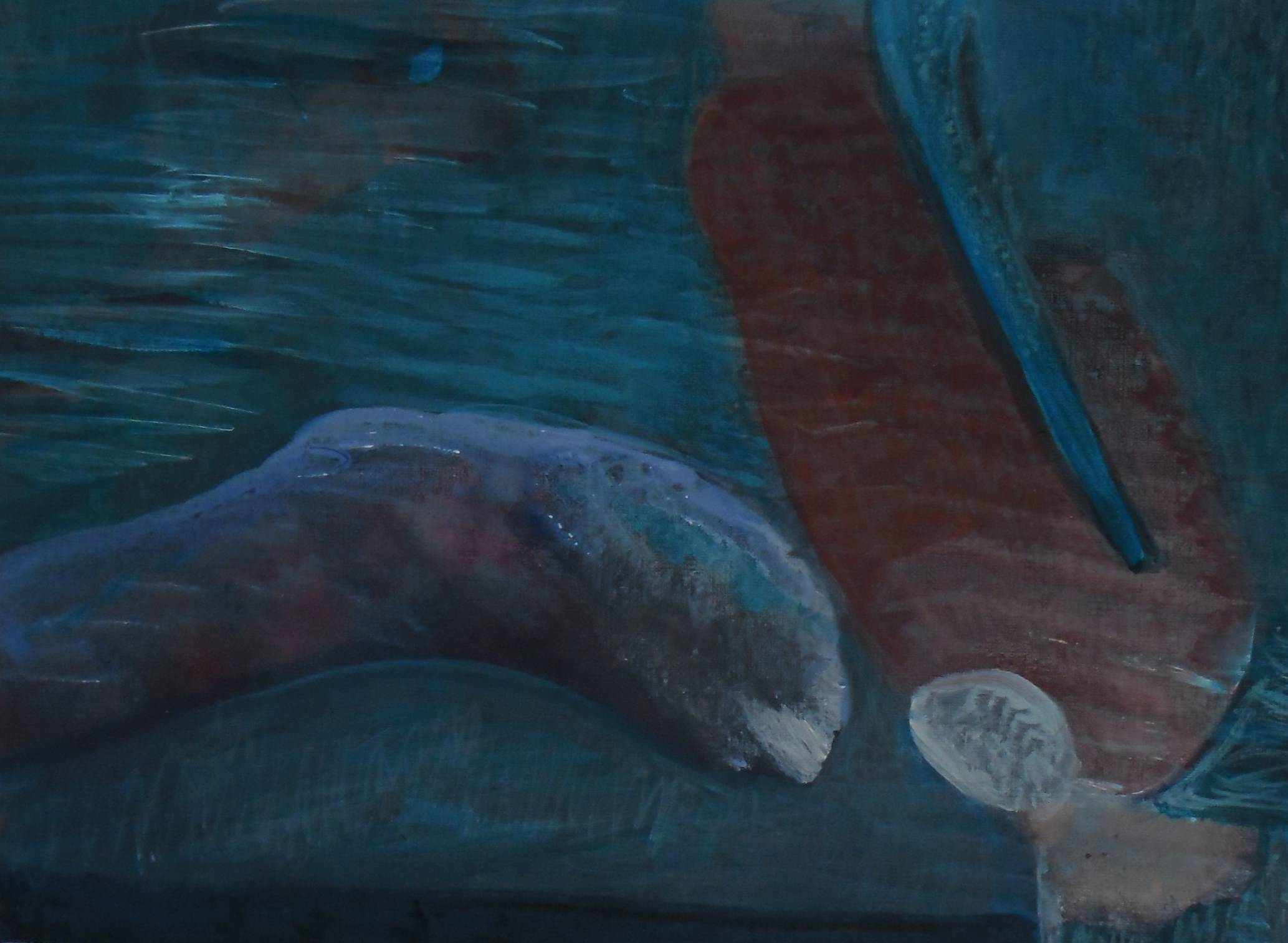 Obraz eksploduje tajemniczym zestawieniem kolorów. Dominują ciemne odcienie błękitu i szarości, które zdają się wręcz płynąć po powierzchni płótna. Abstrakcyjne kształty w formie falistych linii i delikatnych pociągnięć pędzla przyciągają wzrok. Artysta zastosował technikę impasto, dodając strukturę i głębię poprzez grube warstwy farby. Atmosfera dzieła jest spokojna, lecz jednocześnie pełna napięcia. Wręcz słychać szum wiatru i chlupot wody, co wprowadza w stan niepokoju i refleksji. W obrazie można dostrzec prostotę i skomplikowanie w jednym. To jak oglądanie morza podczas burzy. Można by powiedzieć, że opowiada historię o chaosie i harmonii w jednym. Patrząc na to dzieło, poczujesz dreszczyk emocji, a jednocześnie spokój. Journey into the unknown – to chyba najlepsze określenie na tę wizję. Gdyby 7-letnie dziecko mogło to opisać, powiedziałoby: „To wygląda jak ciemna, tajemnicza kraina”. Subtelna gra światła i cienia jest niemal hipnotyzująca. Obraz pobudza wyobraźnię i zachęca do głębszej interpretacji. Zachwyca prostotą, a jednocześnie odkrywa zawiłe warstwy emocji ukrytych pod powierzchnią koloru.
