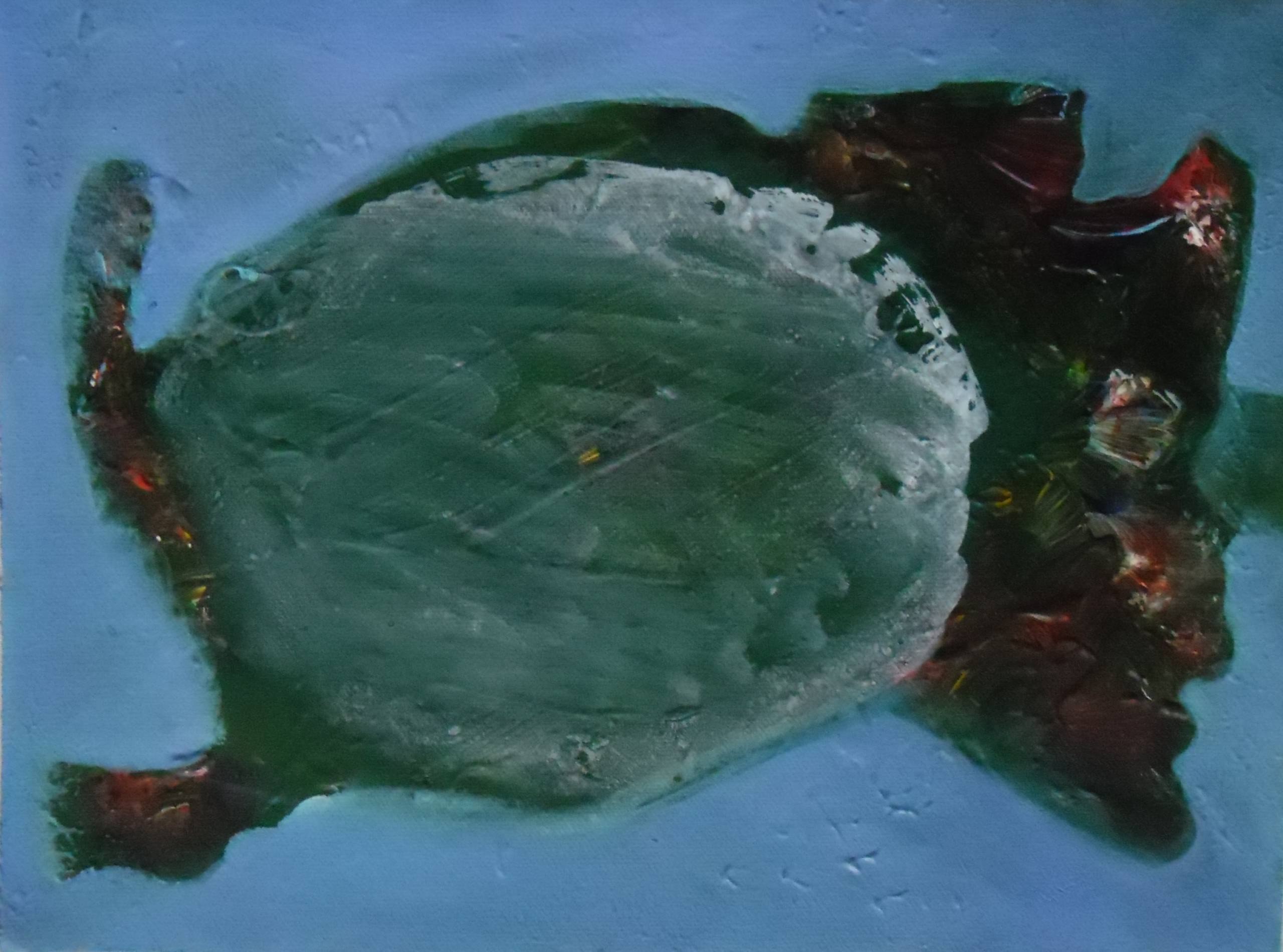 Obraz emanuje spokojem i tajemnicą. Na pierwszy rzut oka dominuje duży, zielony kształt o nieregularnych konturach, jakby zanurzony w jasnoniebieskim tle. To jak marzenie o podwodnym świecie, gdzie zielone fale spotykają się z turkusową głębią. Kolory, mimo swojej intensywności, są harmonijne. Tło niebieskie przypomina niebo lub ocean, wprowadza uczucie przestrzeni, a może nawet swobody. Kiedy patrzę na ten obraz, czuję spokój, ale także ciekawość, co kryje się za tym zielonym obiektem. Artysta zastosował technikę impasto, widoczne są pociągnięcia pędzlem i tekstura farby, co dodaje dziełu charakteru. Wyczuwalna jest wolność ekspresji, z nutką chaosu. Czuję, jakby obraz wołał do mnie: "Zatrzymaj się, popatrz". Dzieciak powiedziałby pewnie, że to zielony stworek pływający w błękitnej kałuży. W swej prostocie dzieło porusza, otwiera pole do interpretacji, budzi curiosity. Fascynuje, jak za pomocą koloru i formy artysta kreuje inny świat.