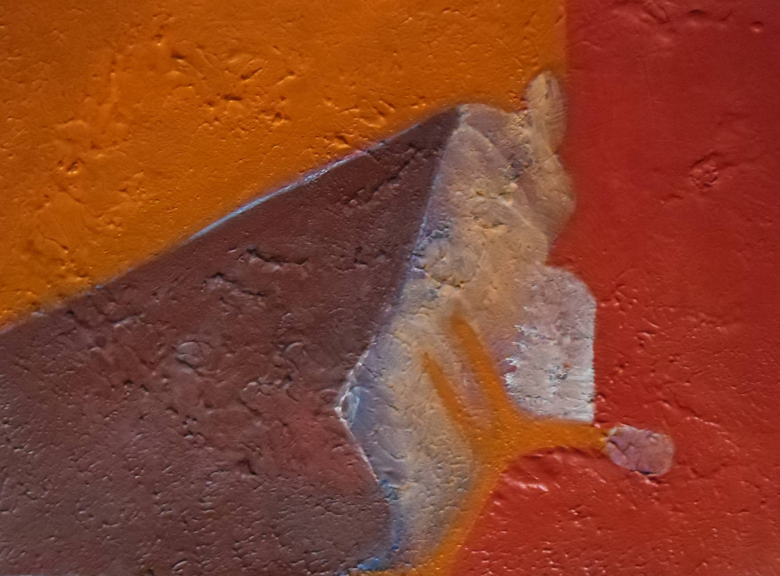 Na obrazie dominują ciepłe, nasycone barwy – ognista pomarańcz i głęboki brąz tworzą wspaniały kontrast. Kształty są organiczne, nieco zamglone, jakby artysta celowo chciał ukryć ich dokładną formę. Ta abstrakcyjna kompozycja przyciąga wzrok swoją tajemniczością i sprawia że widz chce podejść bliżej. Atmosfera jest intrygująca i nieco nostalgiczna. Wydaje się, że dzieło przypomina zachodzące słońce, kiedy dzień łagodnie zmienia się w noc. Techniki artystyczne skupiają się na fakturze i geometrii, widoczna jest mieszanka gładkich i chropowatych powierzchni. Te różnice nadają obrazowi trójwymiarowości. Odbiorcy może przypominać to o ciepłym wieczorze, kiedy czuje się ukojenie i wewnętrzny spokój. Obraz emanuje czymś, co nazwałbym "connectedness", jakby był częścią większej historii. Myślę sobie, że 7-letnie dziecko mogłoby powiedzieć: "To wygląda jak góra, która się uśmiecha!" I coś w tym jest. Emocje są mieszanką zaciekawienia i spokoju. Świetne dzieło na chwilę zadumy.