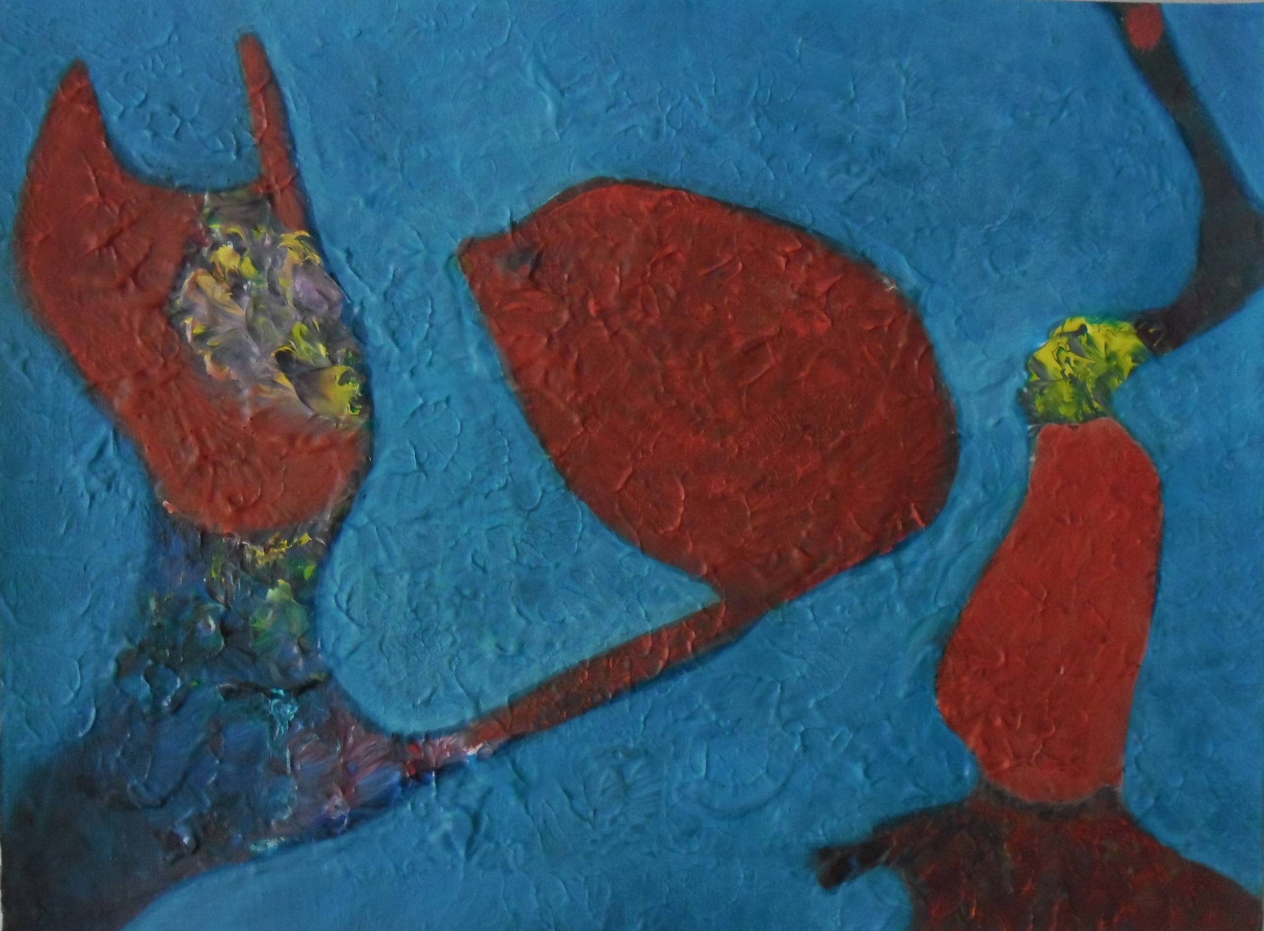 Obraz ukazuje intrygującą grę kolorów i kształtów. Na dominującym tle intensywnego błękitu wyłaniają się abstrakcyjne formy w głębokim odcieniu czerwieni, przypominające nieokreślone stworzenia lub przedmioty. Wrażenie ruchu uzyskiwane jest przez falującą linię, która splata czerwone kształty z tłem. Ten niejednoznaczny taniec form przyciąga wzrok, nadając dziełu dynamiczny charakter. Atmosfera dzieła jest jednocześnie tajemnicza i pełna energii. Intensywne kolory sprawiają, że obraz tętni życiem, nasuwając skojarzenia z nieznanym światem podwodnym lub kosmiczną przestrzenią. Artysta stosuje technikę impasto, co dodaje obrazowi teksturę i trójwymiarowość, zachęcając do zbliżenia się i odkrywania kolejnych detali. Patrząc na to dzieło, można poczuć się jak odkrywca, który znalazł coś nowego i fascynującego. Czy to może być planeta Mars? Może! Niezależnie od tego, czy widz dostrzeże mityczne stworzenia czy abstrakcyjne symbole, jedno jest pewne: obraz skłania do refleksji i poszukiwań. Tło zdaje się szeptać do nas: "explore!" - zachęca do głębszego spojrzenia i zatrzymania się na chwilę w biegu codzienności. Obraz budzi emocje, które trudno zdefiniować jednym słowem. Czujesz zaciekawienie, a może nawet dreszczyk emocji odkrywania czegoś nieznanego. To jak tajemniczy sen pełen nieoczywistych znaczeń.