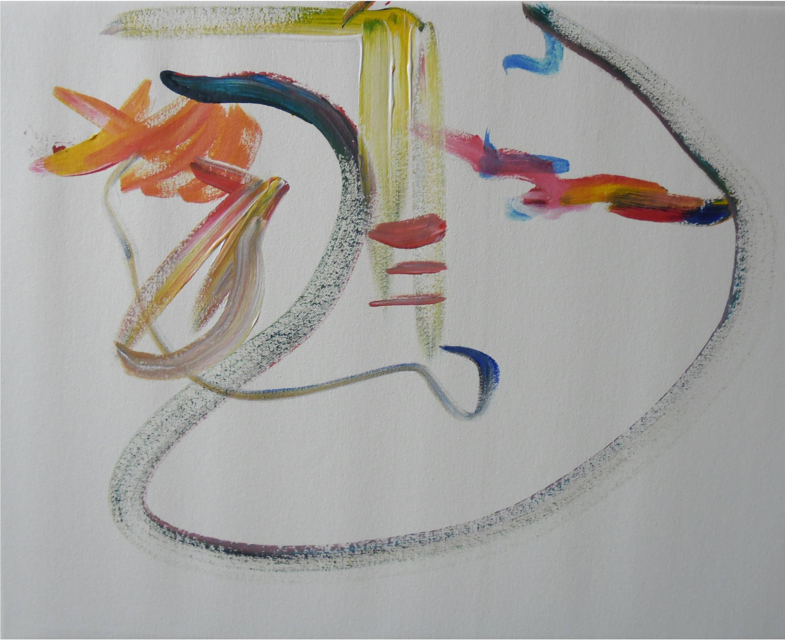 Dynamiczny wir intensywnych kolorów na białym tle tworzy abstrakcyjny spektakl pełen ruchu i energii. Na obrazie dominują barwy ciepłe: pomarańcze, żółcienie, czerwienie, które przeplatają się z chłodnymi tonami niebieskiego i zieleni. Kompozycja jest nieregularna, chaotyczna, ale w tym chaosie jest pewna harmonia, jakby każdy pociągnięcie pędzla miał swoje miejsce i cel. Wygląda to jak taniec kolorów, który przywodzi na myśl emocje i rytm. Nastrój obrazu jest dynamiczny i optymistyczny. Artysta wykorzystał technikę ekspresyjnych pociągnięć, co nadaje dziełu swobodny, spontaniczny charakter. Można dostrzec pewne ślady eksperymentowania, jakby autor próbował przekazać coś głębszego, nienamacalnego. Abstrakcja ta jest open to interpretation, zostawiając odbiorcę z pytaniem: co właściwie widzę? Dla niektórych może to być eksplozja emocji, dla innych - błoga cisza przed burzą. Patrząc na to, można poczuć przypływ energii lub wręcz przeciwnie, refleksję nad własnymi emocjami. Wiesz, to jest trochę jak szukanie kształtów w chmurach - każde oko widzi coś innego. Wrażenie, jakie pozostawia ten obraz, to uczucie immersji w świat ekspresyjnych barw. Wyobraźnia dziecka dodałaby tu zdanie: "To wygląda jak bałwanek w wybuchu kolorów!". Czyż to nie cudowne, że sztuka potrafi tak pobudzać zmysły?