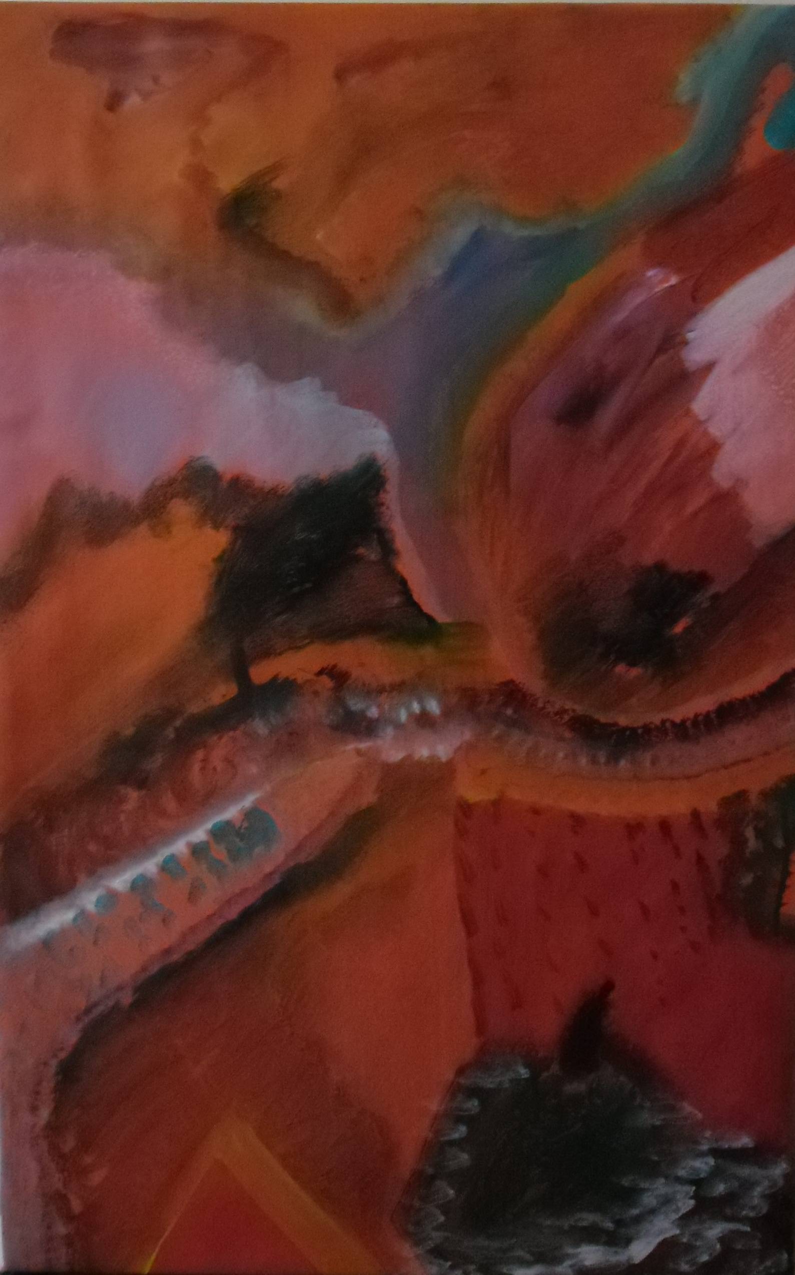 Obraz emanuje ciepłem i dynamiką, pełen jest płomienistych pomarańczy, czerwieni i delikatnych brązów, które tworzą abstrakcyjny krajobraz. Kompozycja to prawdziwy chaos w najpiękniejszej formie, z pociągnięciami pędzla, które zdają się płynąć i tańczyć po płótnie. Te kolory przypominają gorący letni wieczór, gdzie każdy odcień wydaje się szeptać coś na ucho. Nastrój obrazu jest oniryczny, niemalże melancholijny, ale z nutą nadziei. To trochę tak, jakby artysta próbował złapać ulotny moment pomiędzy dniem, a nocą, zawieszeni w przestrzeni. Styl jest ekspresjonistyczny, z elementami action painting, gdzie farba zdaje się być wyrzucana na płótno z pasją i energią. To wywołuje emocje - otula, inspiruje, zmusza do refleksji. Dla mnie, ten obraz jest jak rollercoaster. Przyspiesza serce, a jednocześnie uspokaja. Jakby ktoś szeptał: „wszystko będzie dobrze”. W jednym miejscu widzę cień drzewa, które szepcze wspomnienia lata. A 7-letnie dziecko powiedziałoby: "To wygląda jak wielki, pomarańczowy miód!". Czyż to nie magiczne? Kreatywne połączenie kolorów i formy sprawia, że obraz jest „breathtaking”. Te ciepłe barwy są kojące, a sposób, w jaki różne odcienie się mieszają, przyciąga wzrok i nie pozwala się oderwać. Każdy, kto spojrzy na to dzieło, znajdzie w nim coś dla siebie.