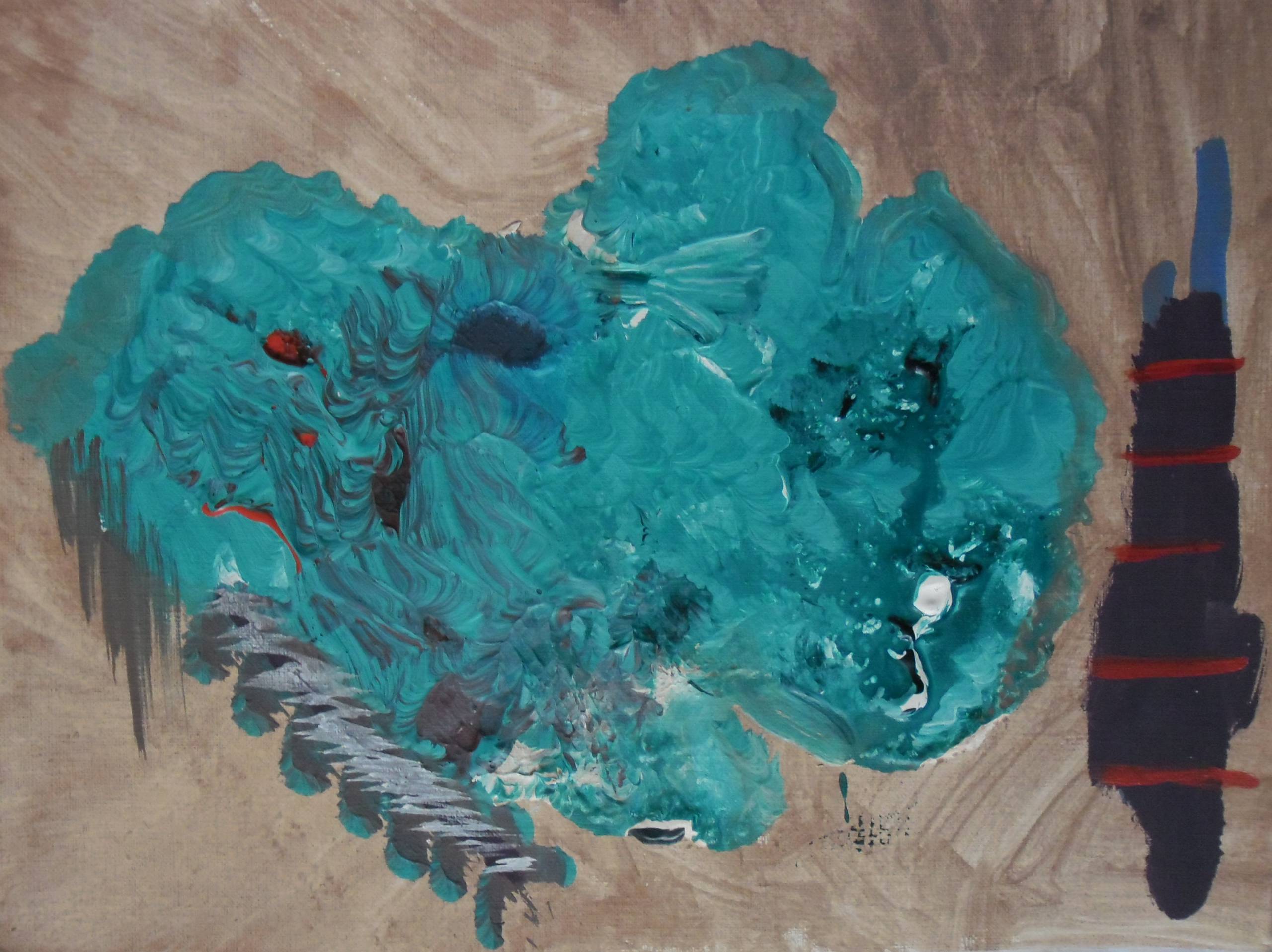 Na obrazie dominują intensywne odcienie turkusu, które przypominają morską toń. Miękkie pociągnięcia farby tworzą organiczne kształty, jakby artysta próbował zamrozić ruch w czasie. Na tle widać kontrastującą plamę ciemnego granatu z czerwonymi liniami, które niczym pioruny przecinają spokój obrazu. Kompozycja jest dynamiczna a jednocześnie równoważona subtelnym tłem w odcieniu brązu, które nadaje całości nieco rustykalnego charakteru. Styl dzieła to mieszanka ekspresjonizmu z gestami typowymi dla action painting. Patrząc na obraz, można poczuć falę spokoju ale i niepokoju. Jest coś hipnotyzującego w tej chaotycznej harmonii. „To wygląda jak chmura z bajki!” - powiedziałoby dziecko. Technika impasto, z grubą fakturą farby, podkreśla fizyczność obrazu. Wrażenie dotykowego zmysły jest niemal tangible. Każdy detal ma swoją historię, każda linia to ścieżka emocji. Zastanawiam się, czy artysta chciał przekazać chaos wewnętrzny czy po prostu zagrać na naszych uczuciach. Może mi się tylko wydaje.