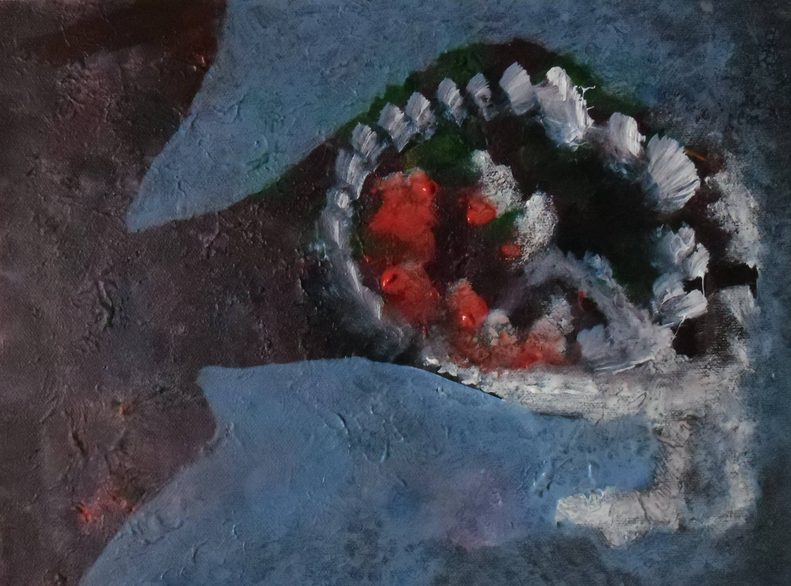 Na obrazie widzimy dynamiczną grę ciemnych i jasnych odcieni, które tworzą niemalże kosmiczny pejzaż. Dominują tu głębokie błękity i czerń, które przełamują jaskrawe, czerwone plamy przypominające ogniste wybuchy. Kształty są nieostre, a powierzchnia malowidła wydaje się nieco chropowata, co dodaje dziełu faktury. Atmosfera jest tajemnicza i nieco niepokojąca, ale też fascynująca, jakby obraz skrywał jakiś sekret. Artysta posłużył się techniką, która przypomina impasto, gdzie farba jest nakładana grubą warstwą. Dzięki temu dzieło ma trójwymiarowy charakter. To może budzić w oglądającym poczucie zbliżania się do czegoś nieznanego, ale też niesamowicie pociągającego. Może się zdawać, że obraz opowiada jakąś historię, pełną emocji i dramatyzmu, niemniej każdy widz odczyta ją na swój własny sposób. "Wow, ale to jest kolorowe" - mógłby powiedzieć dziecko, wskazując na obraz. Jest to taki obraz, który pozostaje w pamięci na długo i wywołuje ciekawość. Trochę jak zagadka, która prosi się o rozwiązanie.