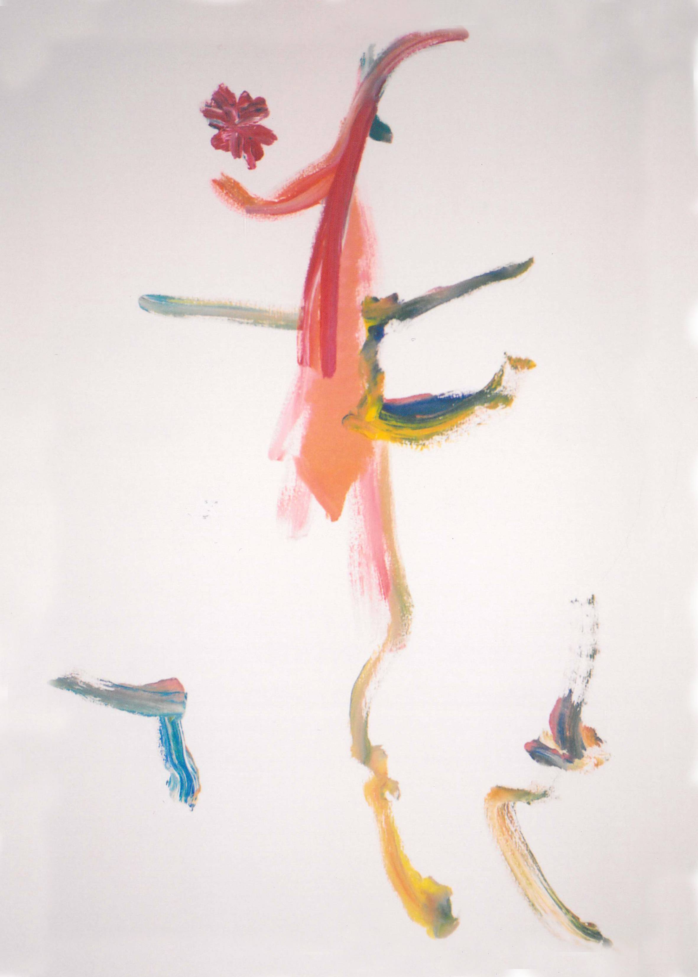 Obraz na pierwszy rzut oka wydaje się prosty, ale z każdym momentem ujawnia coś nowego. Dominują w nim delikatne, pastelowe kolory – różowy, błękitny i odrobina zieleni, które mieszają się jakby niepewne, tworząc swobodny taniec na białym tle. Kształty na płótnie są organiczne, ich nieprecyzyjność dodaje dziełu dynamiki. Artysta zastosował technikę, która wydaje się być szybkim pociągnięciem pędzla. Ta spontaniczność dodaje mu czaru (charm). Obraz emanuje lekkością i pewnym rodzajem wolności. Atmosfera jest pogodna, można by rzec, że niemal beztroska. Jak powiedziałoby dziecko: to wygląda jak huśtawka na chmurze. Zastanawiam się, jakie emocje chciał obudzić twórca. Czy chodziło o radość, czy może o nostalgię za chwilami, gdy wszystko było proste? Patrząc na to dzieło, czuję, jakby czas zwalniał. Zachęca do spojrzenia na świat przez pryzmat dziecięcej wyobraźni. Czuję lekki powiew świeżości, jakby powietrze na wiosnę wciągnięte po raz pierwszy od zimy.
