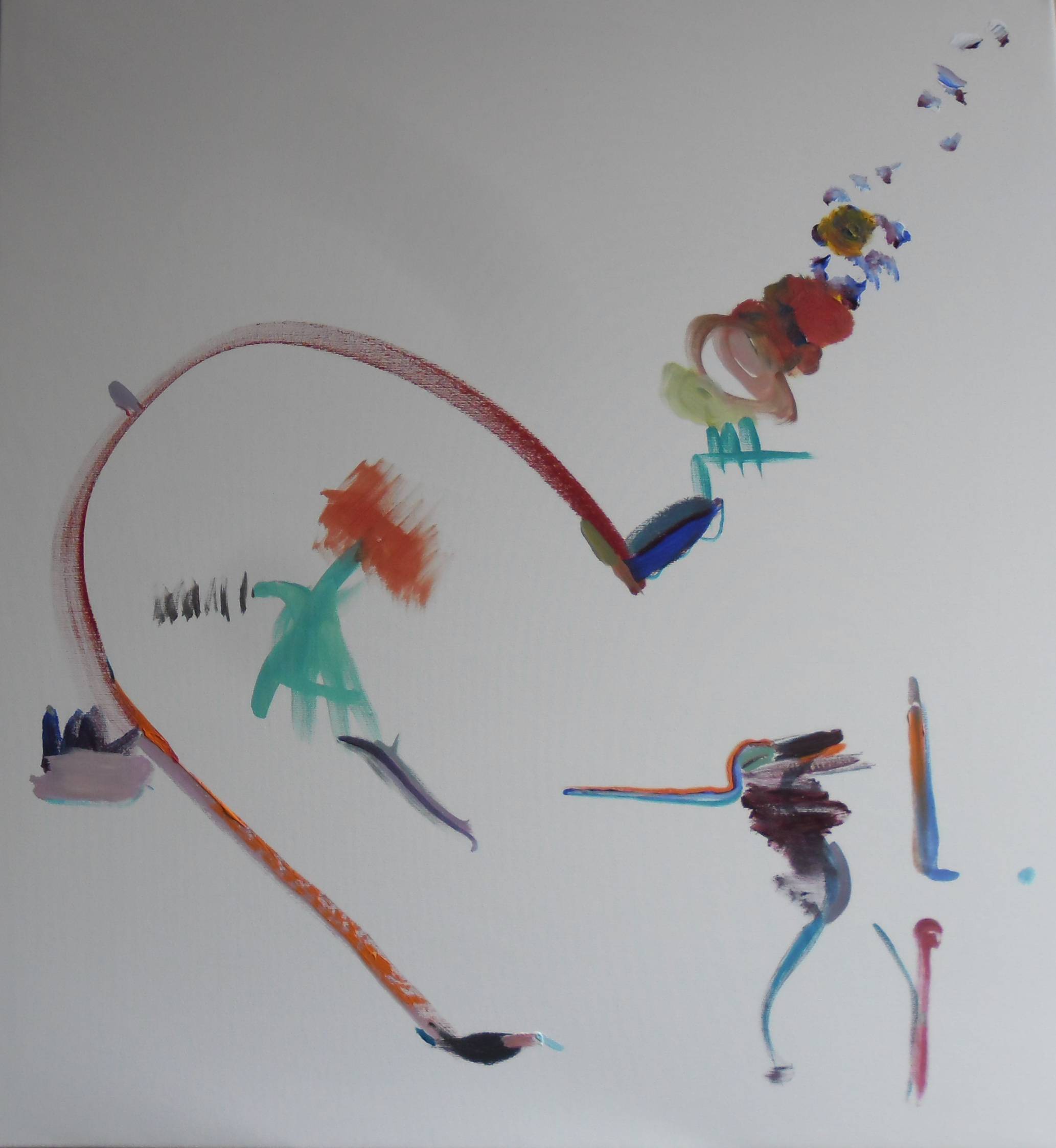 Obraz ten jest jak tajemnicza mapa pełna zagadek do odkrycia. Na białym tle, które przypomina czyste płótno czekające na twórcze eksplozje, widzimy zawirowania kolorowych kresek i plam. Czerwona, krzywa linia wije się niczym wąż, a obok niej kilka chaotycznie rozproszonych plam w różnych barwach. Zielona plama z radosnym pomarańczem zdaje się być centralnym punktem tej abstrakcyjnej kompozycji. Atmosfera jest pełna niewinności i beztroski, jak od niechcenia pomazane kartki przez dziecko. Obraz emanuje swobodą użycia farb, a technika artystyczna zdaje się być mieszanką działania instynktownego i spontanicznego artyzmu. Dzieło przywołuje uczucia radości, wolności, ale też i zagubienia w chaosie codziennych myśli. "Wow, tyle tu kolorów!" – tak to mogłoby widzieć dziecko. Osobiście, czuję przy tym jakąś wewnętrzną tęsknotę za chwilami, kiedy można wszystko zostawić i zanurzyć się w twórczości. A ja dodam tylko: these colors sing! Obcowanie z takim obrazem jest jak patrzenie w duszę artysty, pełne emocji i nieoczywistości.