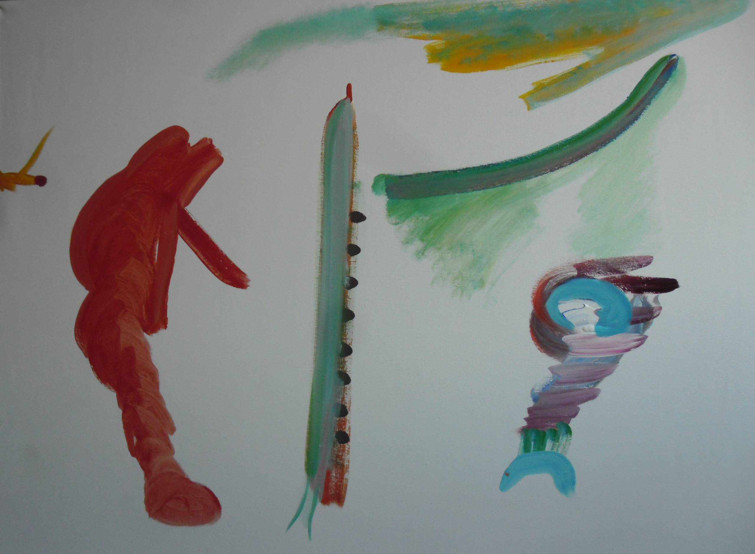 Obraz jest prawdziwym festiwalem kolorów i form. Na pierwszy plan rzucają się czerwone pociągnięcia pędzla, chaotycznie wijące się po lewej stronie płótna. Po prawej stronie widzimy nieco bardziej zorganizowaną kompozycję. Zielone i niebieskie kształty, które tworzą jakby zawiłą plątaninę. Atmosfera obrazu jest bardzo dynamiczna, ale jednocześnie sprawia wrażenie pewnej medytacyjnej spokoju. Można się tu doszukać stylu abstrakcyjnego, pełnego rozmachu i ekspresji. Artysta użył techniki szerokiego pędzla, co dodaje dziełu lekkości. A może to był roller? Kto wie. Całość jest zarazem delikatna i mocna. Patrząc na nią, można poczuć nagłe uniesienie i przypływ energii. Nieco skośne linie i łagodne przejścia kolorystyczne mogą przywoływać wspomnienia wakacyjnych dni. Jest jak cichy dialog pomiędzy chaosem a harmonią. Właściwie, przypomina mi się wakacje na plaży. Obraz wyzwala emocje skrajne. Dla dziecka: "To wygląda jak ślad wielkiego robaka!" Jest w tym też coś open-ended, jakby każdy mógł tam zobaczyć swoje własne wspomnienia. A może to tylko plamki? Tak czy siak, obraz zostawia nas z dziwnym uczuciem – czy to była chwila na jawie czy sen na jawie?