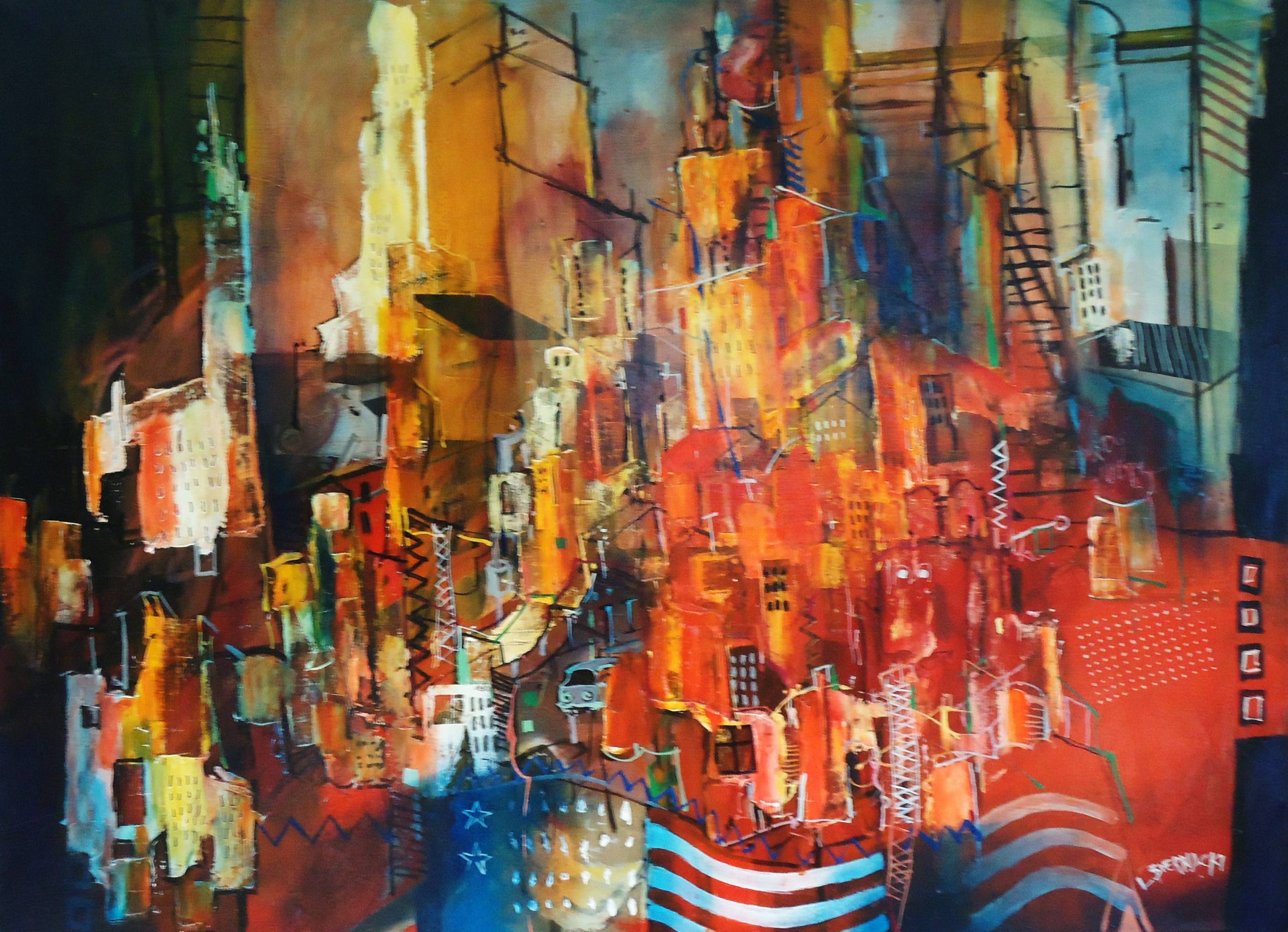 Obraz wciąga nas w wir intensywnych kolorów i chaotycznej kompozycji. Dominują czerwienie, pomarańcze i złota, które emanują ciepłem i energią. Linie są krzywe, czasem niedbałe, przypominające szkic na gorąco, pełne spontaniczności i życia. Wieże i budynki zdają się sięgać nieba, tworząc malowniczy miejski krajobraz. Tło jest ciemne, prawie mroczne, kontrastujące z jasnymi elementami w centrum. Atmosfera jest gęsta, trochę tajemnicza, jakby coś się miało wydarzyć. Może to prawdziwy city jungle, jak mawiają w Nowym Jorku. Styl artysty jest pełen ekspresji, niemal abstrakcyjny. Każda kropla farby zdaje się pulsować z emocjami, które mogą być odbierane bardzo osobiste. Odbiorca może się poczuć jak w środku tętniącej życiem metropolii, pełnej hałasu i ludzkich historii. Obraz może wywoływać mieszane uczucia — z jednej strony zachwyt, z drugiej lekkie przytłoczenie. Patrząc na to dzieło, mam ochotę powiedzieć: "Wow, ile tu się dzieje!". Może zdanie, jakie napisałoby dziecko: "To jest miasto z ognia!". To dzieło na pewno nie da się przespać. A jakie emocje tobie przynosi?