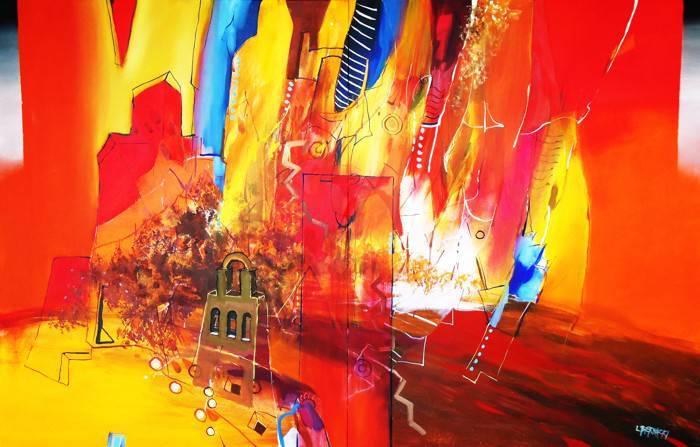 Obraz eksploduje ferią kolorów, dominują tu intensywne czerwienie i żółcie, które przeplatają się z odrobiną chłodnego niebieskiego. Kompozycja jest dynamiczna, pełna abstrakcyjnych kształtów i nieoczywistych form, które sprawiają, że patrząc na to dzieło, czujemy się jak na karuzeli. Nastroju nadaje wzburzenie i ognista energia. Wygląda, jakby płomienie tańczyły na płótnie, tworząc dramatyczny efekt. Styl artystyczny można nazwać abstrakcjonizmem z zacięciem ekspresyjnym. Artysta wykorzystuje ostrą linię, kontrastujące kolory i różnorodne faktury, co nadaje obrazowi głębokość i moc. Czujesz to? To jak pęd powietrza na twarzy. Technika jest dynamiczna, pociągnięcia farby są zdecydowane, jakby artysta z rozmachem malował swoje uczucia. Obraz może budzić różne emocje. Dla niektórych to może być chaos, dla innych pasja i energia. Dziecko powiedziałoby: "To wygląda jak wybuch super komety!" Osobiście czuję się zaintrygowany, jakbym stał u progu wszechświata nieograniczonych możliwości. Ten element 'cool', niesie ze sobą zarówno niepokój, jak i zachwyt. Wiesz, co mam na myśli? To coś, co chciałoby się widzieć codziennie, by pobudzać wyobraźnię. I tak obraz opowiada swoją historię, a twoja interpretacja jest równie ważna jak zamysł artysty.