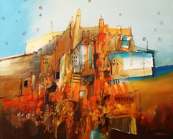 Obraz przed nami to prawdziwa feria barw. W dynamicznej kompozycji królują ciepłe odcienie pomarańczy i brązu, przeplatane chłodnym błękitem nieba. Geometryczne kształty budowli tworzą chaotyczną harmonii, sprawiając, że wzrok nieustannie się przemieszcza, próbując ogarnąć całość pejzażu. Atmosfera dzieła jest zarazem nostalgiczna i żywa, jakbyśmy patrzyli na zaklętą w czasie starówkę. Ten art styka się z techniką ekspresjonizmu, gdzie śmiałe pociągnięcia pędzla i abstrakcyjne formy dominują. Obraz może wywoływać u odbiorcy szereg emocji — od zadumy po fascynację. Może nawet przypominać o miejscach z dzieciństwa lub też o marzeń o odległych krainach. It's magical! Jakbyśmy byli w bajce, gdzie wszystko jest możliwe. Jeden chłopczyk mógłby krzyknąć "Hej, to wygląda jak zamek z mojej książki!". Osobiście, dzieło skłania mnie do refleksji nad przemijaniem czasu i unikalnością każdego miejsca, które tworzą nasze wspomnienia, filmy, marzenia.