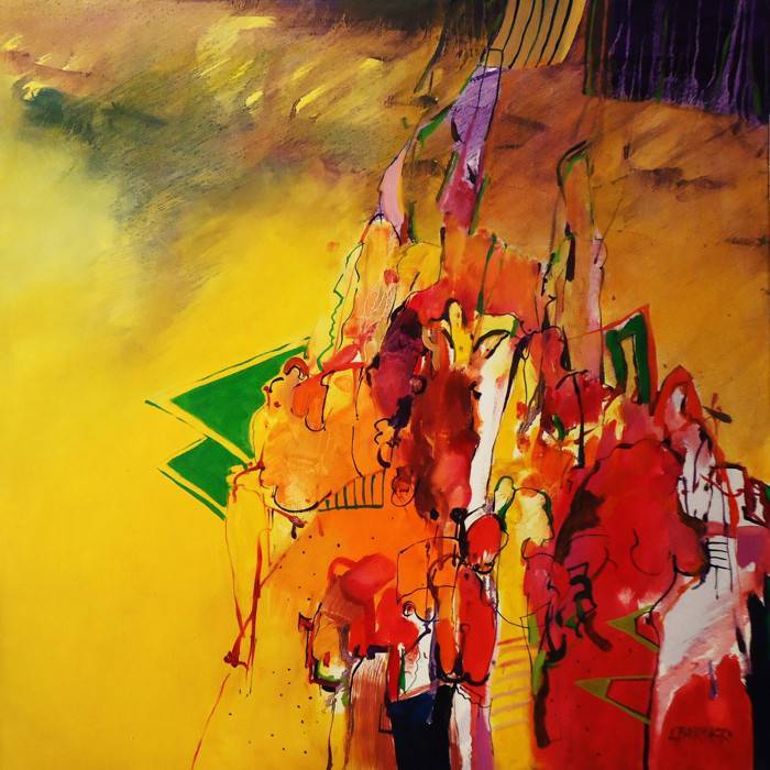 Na tym obrazie dominuje intensywny żółty kolor, który przypomina promienie słonecznego dnia. Ożywiają go plamy głębokiej czerwieni i zieleni, tworząc dynamiczną kompozycję pełną życia i energii. Kształty są abstrakcyjne, jakby wyjęte z marzeń, zlewające się i przenikające, choć jednocześnie zarysowane wyraźnymi konturami. Obraz emanuje niespokojną atmosferą, jakby coś miało się wydarzyć. Czujesz, jakby na moment zatrzymał się czas, a ty stałeś na skraju czegoś nowego. Styl artysty jest niezwykle ekspresyjny. Pociągnięcia pędzla są spontaniczne i pełne pasji. Abstrakcyjna forma i gra kolorów sprawiają wrażenie, jakby obraz poprowadził cię w nieznane. Dzieło budzi różnorodne emocje, od zadziwienia po coś, co można by nazwać "sense of wonder". Możesz poczuć jak serce bije szybciej, jakby na skraju przygody. "To wygląda trochę jak ogień, mamo!" mogłoby powiedzieć dziecko. Obraz zmusza do refleksji, otwiera drzwi do interpretacji osobistych, co czyni go jeszcze bardziej fascynującym. Można zadać sobie pytanie, czy to chaos, czy może świadoma harmonia. Może to tylko artystyczny wyraz emocji, które każdy z nas, choć w inny sposób, czuje. Ten obraz mówi do widza, zachęca do zatrzymania się na chwilę.
