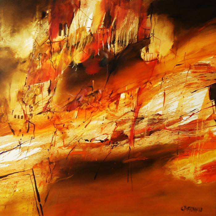 Obraz emanuje intensywnymi kolorami — dominują tu ciepłe odcienie pomarańczy, żółci i czerwieni. Całość tworzy dynamiczną kompozycję, przypominającą chaotyczny taniec płomieni. Linie są poszarpane, a kształty niewyraźne, co dodaje dziełu nieco abstrakcyjnego charakteru. Atmosfera jest pełna energii, tak jakby coś ogromnego się działo, może burza emocji? Styl artysty przejawia się w ekspresyjnych pociągnięciach pędzla, które przyciągają wzrok. Techniki na pewno były intensywne, może impasstowe, bo farba zdaje się mieć fakturę. Wydaje się, że chciał on uchwycić chwilę pełną napięcia i ruchu. Odbiorca może się zastanawiać, co właściwie przedstawia obraz. Some might see a landscape on fire, or maybe a battle of elements. Jakby to nie było, emocje buzują jak szalone. Osobiście czuję pewien niepokój, ale i fascynację tą nieuporządkowaną harmonią. To trochę jak przyroda — piękna i nieprzewidywalna. Kolorystyka przypomina mi zachód słońca, kiedy to światło igra z niebem. Czasem myślę, że to takie magiczne płomienie z bajki. Ten obraz potrafi mówić i szeptać na tysiąc sposobów — zależy, komu chce opowiedzieć swoją historię. Po prostu fab.