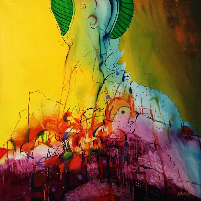 Ten obraz to prawdziwy eksplozja kolorów i emocji. Dominującą barwą jest żywy, intensywny żółty, który tworzy tło dla szalonej gry kształtów i linii. Zielone detale przyciągają uwagę, kontrastując z ciepłymi odcieniami czerwieni i pomarańczy. Kompozycja jest dynamiczna, pełna energii, jakby malarz chciał uchwycić moment eksplozji lub erupcji emocji. Nastrój dzieła jest surrealistyczny, nieco tajemniczy. Można się poczuć jak w innym świecie, gdzie wszystko jest możliwe. Artystyczny styl przypomina abstrakcję ekspresjonistyczną, gdzie techniki łączą się w organiczną całość. Widać tu pewną nonszalancję, jakby artysta zdał się na swój instynkt, tworząc w emocjonalnym uniesieniu. Ten obraz wywołuje intrygę, czasem nawet lekkie zamieszanie. Można się zastanawiać, co artysta chciał przekazać, ale to jest właśnie magia tego dzieła. Dla mnie, osobiście, daje poczucie wolności i radości. "To wygląda jak tęcza, która spadła na ziemię!" – powiedziałoby dziecko. W tym chaosie i tumultu odnajduję jednak swój spokój. Obraz jest jak abstrakcyjna symfonia – vibrant i różnorodna. Czyż nie jest to fascynująca podróż dla wyobraźni?