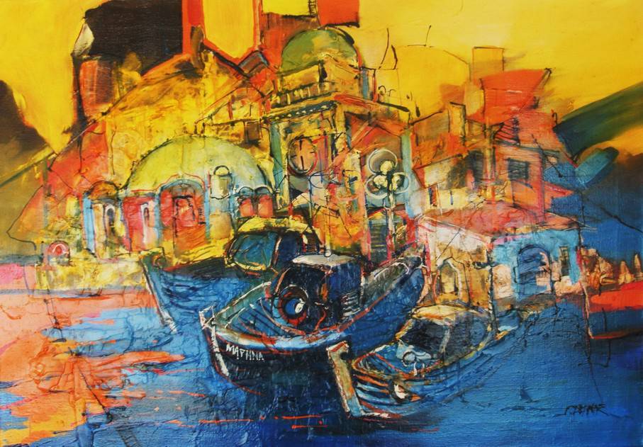 Na obrazie dominują żywe kolory, które przyciągają wzrok od pierwszej chwili. Głębokie odcienie niebieskiego przenikają się z ciepłymi tonami żółci i czerwieni, tworząc niezwykłą kompozycję pełną energii. W centrum znajduje się łódź z napisem "MARINA", otoczona przez nieregularne kształty budynków. Ich zarys jest delikatny, jakby wyrwany z kartki szkicownika marzyciela. Atmosfera tego dzieła jest dynamiczna i nieco chaotyczna, przypominająca gwarne nabrzeże w słoneczny dzień. Czuję się, jakbym wszedł w kolorowy sen. Artysta używa technik mieszanych, z wyraźnymi liniami kreski nadającymi strukturę i głębię. Trochę przypomina to impresjonizm, ale z twistem współczesności. Obraz pobudza wyobraźnię i może wywoływać różnorodne emocje - od radości po lekką nostalgię za miejscem, które może znamy, ale dawno go nie widzieliśmy. Widząc te śmiałe pociągnięcia, mam wrażenie, że artysta bawił się z medium jak dziecko z farbami. Wow, jak kolorowo - pomyślałby 7-latek. To dzieło przywołuje wspomnienia letnich przygód, a użycie jednego słowa w języku angielskim, "twist", idealnie oddaje jego nieprzewidywalny charakter. Obraz jest jak muzyka życia - pełen rytmu i harmonii, a jednocześnie bałaganu, który sprawia, że się zatrzymujemy. Przeżywam to niemal na nowo, widząc jak światło igra na powierzchni wody, a słońce zachodzi, barwiąc niebo ciepłymi barwami.