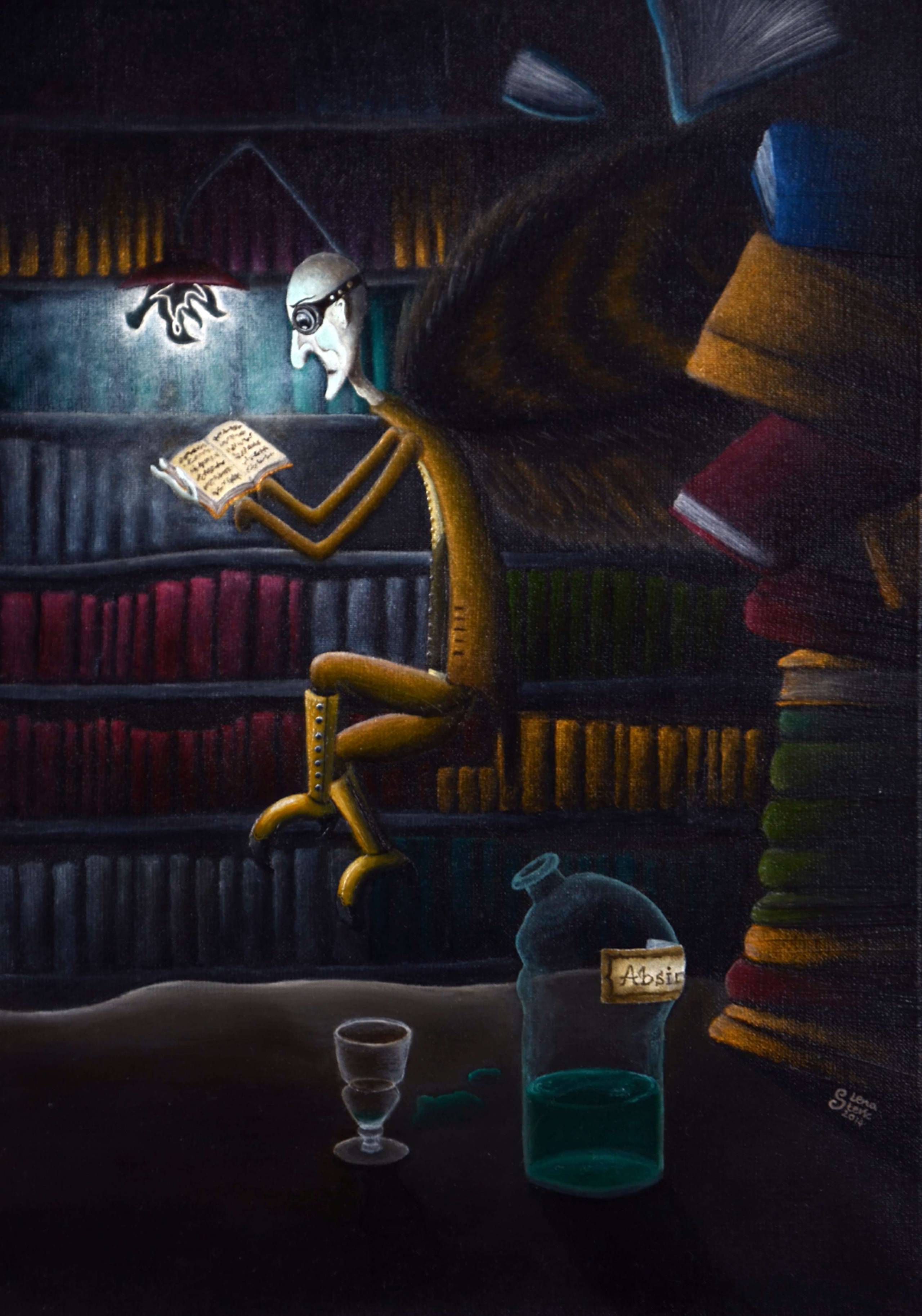 Obraz ukazuje tajemniczą postać, siedzącą relaksacyjnie wśród stosu książek. Dominują ciemne barwy z nutami zieleni, brązu i czerwieni. W centrum uwagi jest owadopodobna figura z wielkimi skrzydłami, trzymająca książkę pod migoczącą lampką. Te dziwaczne połączenie człowieka i owada wprowadza atmosferę surrealizmu. Wywołuje uczucie niepokoju, ale też fascynuje. Styl obrazu przypomina Salvador Dali z jego zamiłowaniem do nadrealistycznych kompozycji. Technika jest precyzyjna, z wyraźnymi detalami i delikatnymi przejściami kolorów. To wszystko sprawia, że obraz jest tak engaging i przyciąga uwagę na dłużej. Emocje? Różnorakie. Z jednej strony zauroczenie światem książek, a z drugiej coś niepokojącego. Wyobrażam sobie, że to miejsce, gdzie żyją marzenia i koszmary. Moim zdaniem, to idealne tło dla refleksji nad granicami ludzkiej wyobraźni. Czyż to nie trochę straszne? A przecież dzieciak mógłby powiedzieć: "Wow, to wygląda jak magiczna biblioteka!". Mimo wszystko, obraz ma w sobie coś, co nie pozwala o nim zapomnieć.