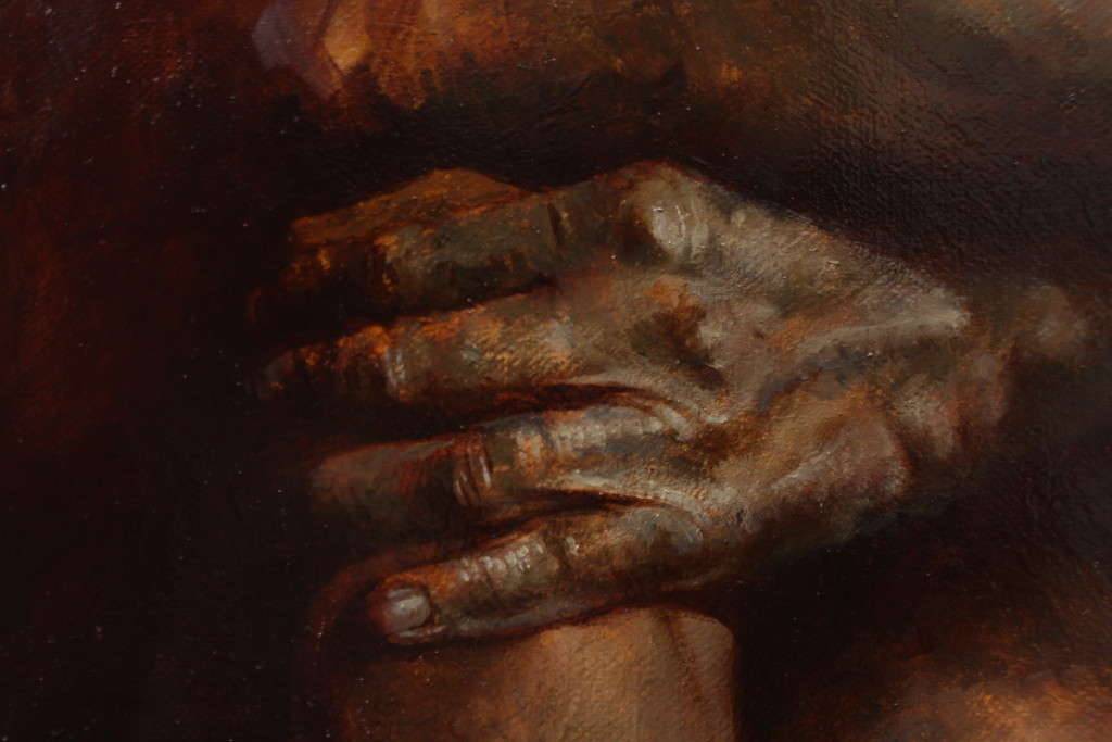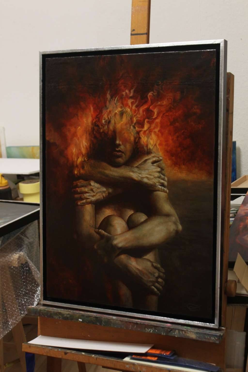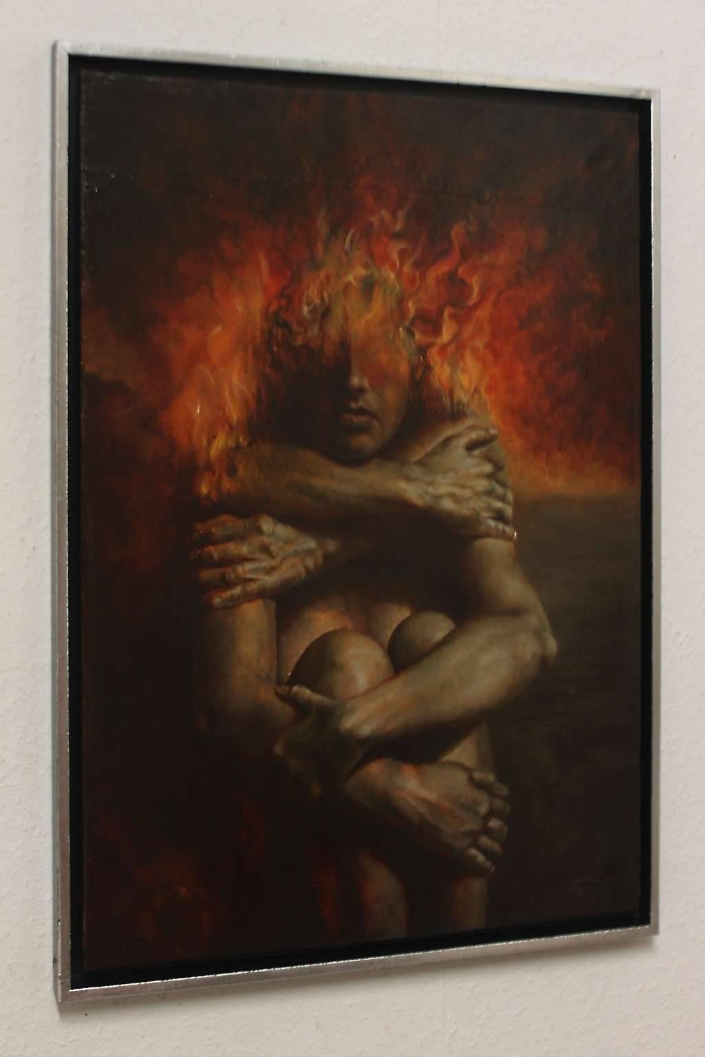 Na obrazie widzimy postać otoczoną żywym, wręcz dzikim płomieniem, który emanuje intensywnymi odcieniami pomarańczu i czerwieni. Płomienie zdają się inspirować ruch i dynamizm, tworząc delikatne kontrasty z ciemniejszym otoczeniem. Postać siedzi skulona, jej twarz jest częściowo ukryta, co dodaje tajemniczości. Kolory głównie ciemne, przywodzą na myśl niepokój i intensywne emocje. Obraz emanuje atmosferą napięcia, może nawet uwięzienia. Widać jakby wewnętrzny konflikt. Mistrzowskie użycie cieni i światłocienia nadaje obrazowi głębię i trójwymiarowość. To malarstwo olejne ma w sobie coś nieziemskiego, almost surreal. Można poczuć żar wydobywający się z płomieni i przenikający do samego serca. Dziecko powiedziałoby, że ten ogień jest jak włosy z bajki! Ten obraz wywołuje niepokój, zmusza do zastanowienia. Jakby pytając: co nas tak naprawdę trawi od środka? Artysta przez gesty, kolory uderza w emocje, które na długo zostają w pamięci. Obraz jest jednocześnie fascynujący i nieco przerażający. Daje do myślenia, nie pozwala na szybkie zapomnienie. Wciąga nas w swój świat, subtelnie, lecz zdecydowanie.